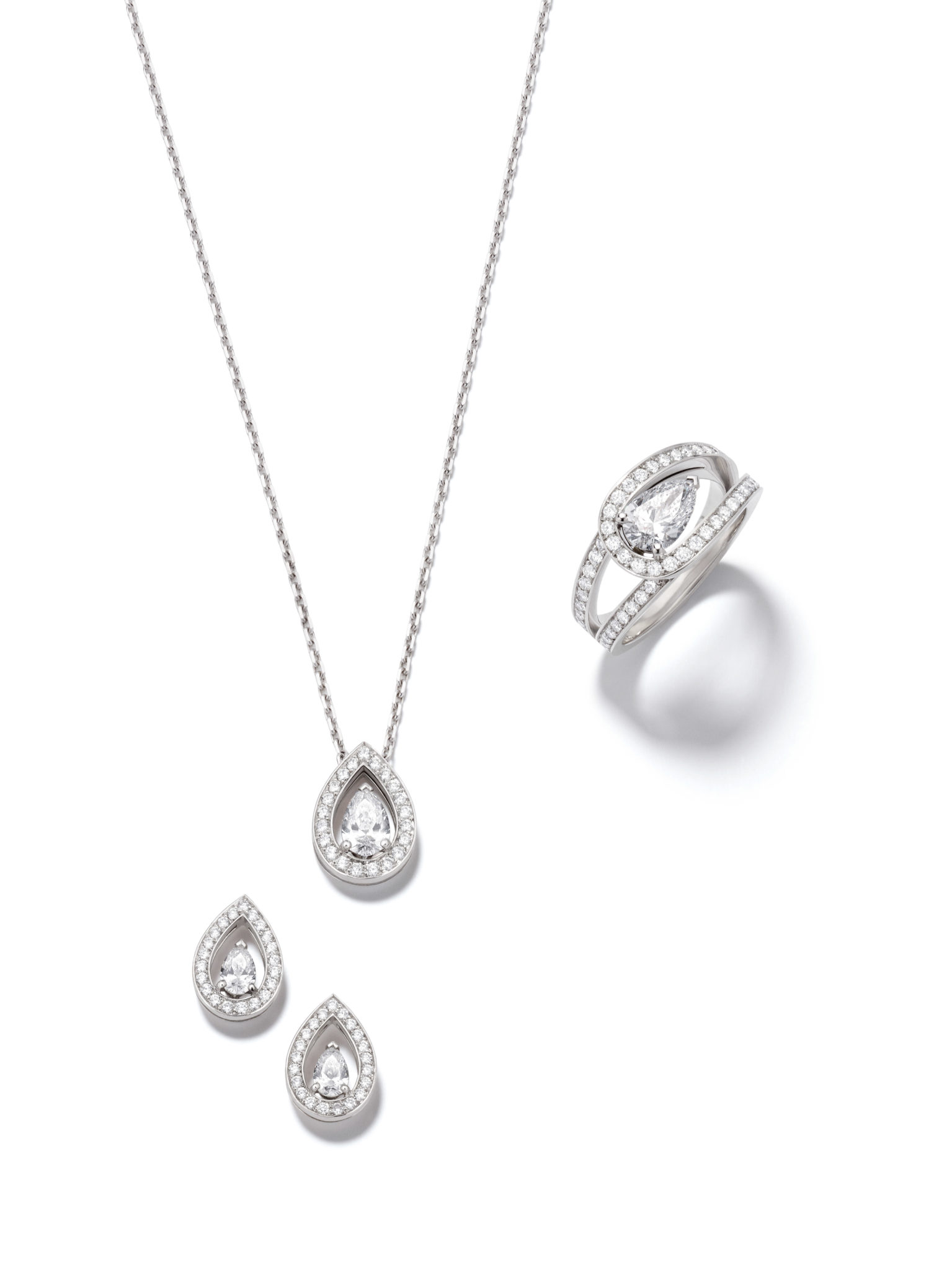 Tout diamants dehors, taillés et sertis, la ligne s’attache un caractère graphique et précieux inouï, symbole moderne d’un amour éternel et unique. La bague Lovelight se réinvente en un bandeau raffiné et délicat et s’agrémente d’un pendentif et de boucles d’oreilles pures et intemporelles