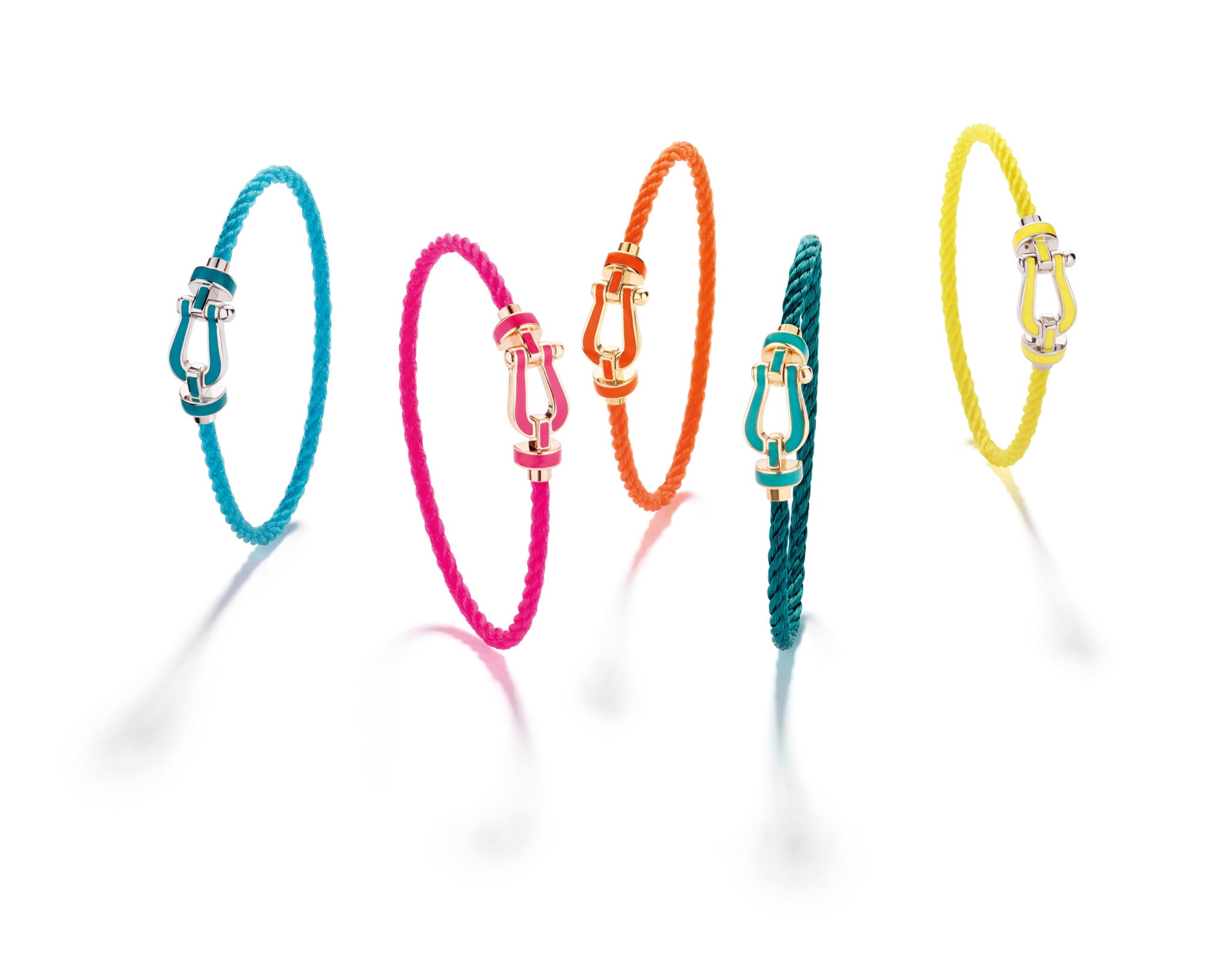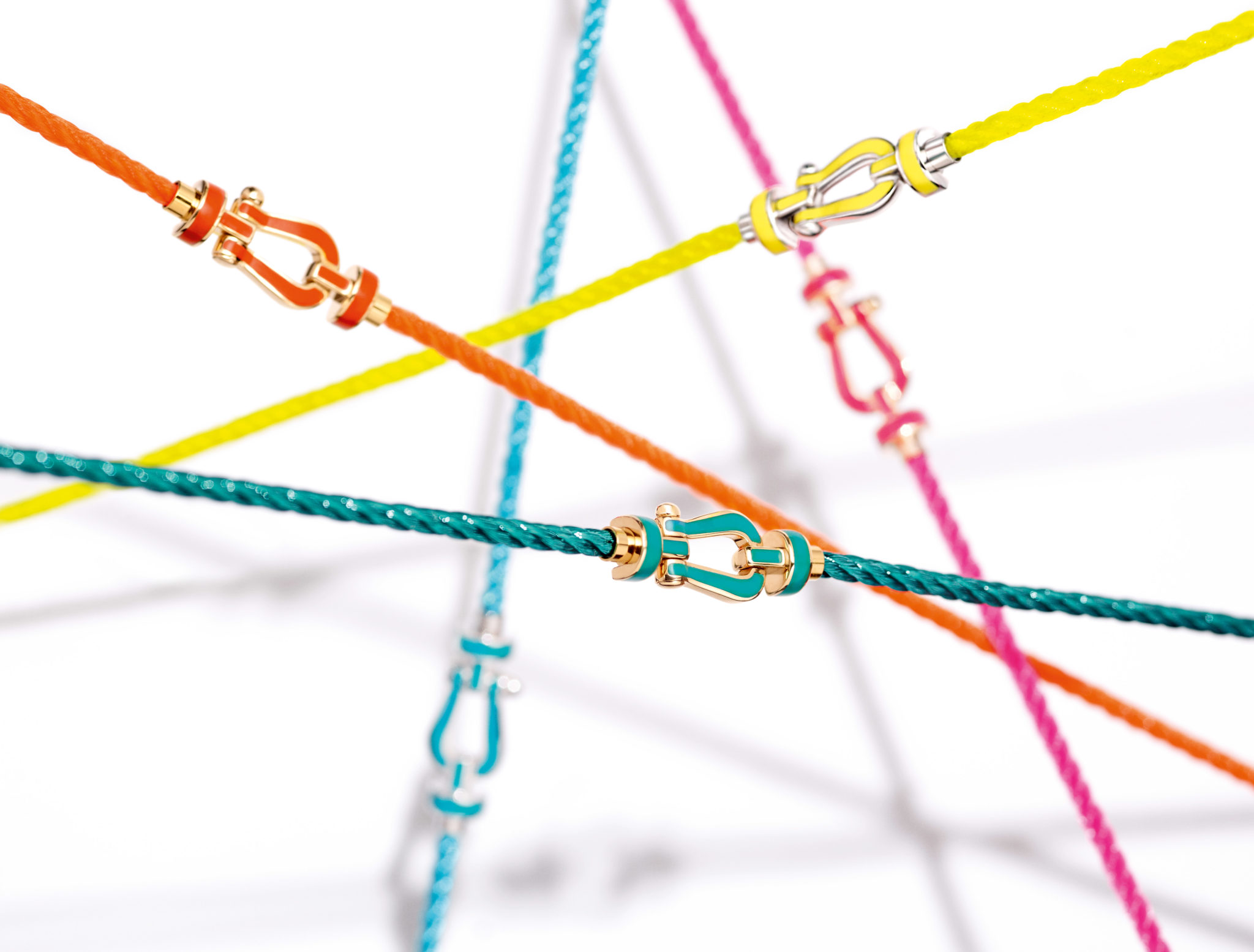 Une ligne aux allures de carte postale, un avant-goût de vacances que FRED signe d’un trait d’humour et de créativité joyeuse, décalée, piquée d’un léger grain de folie. Laquées, les manilles FORCE 10 sont déclinées en jaune citron, vert gazon, bleu turquoise, rose fuchsia et orange vitaminé portées avec des câbles assortis.