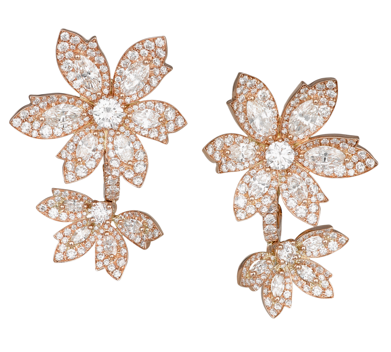 Toutes ces feuilles de palme, colorées ou non, comprennent un diamant rond central entouré de diamants en pavage sur chaque feuille. Les versions tout-diamant utilisent des pierres taille marquise et taille brillant d’une qualité et d’une clarté exceptionnelles pour former un luxuriant éventail de feuillage.