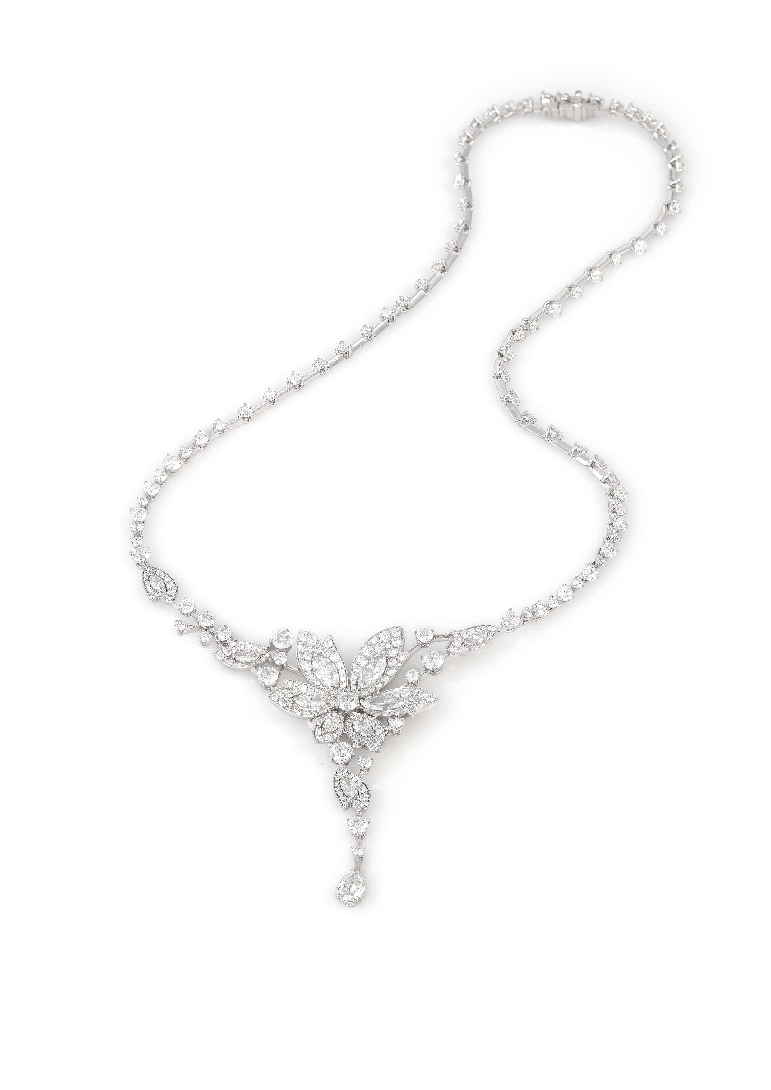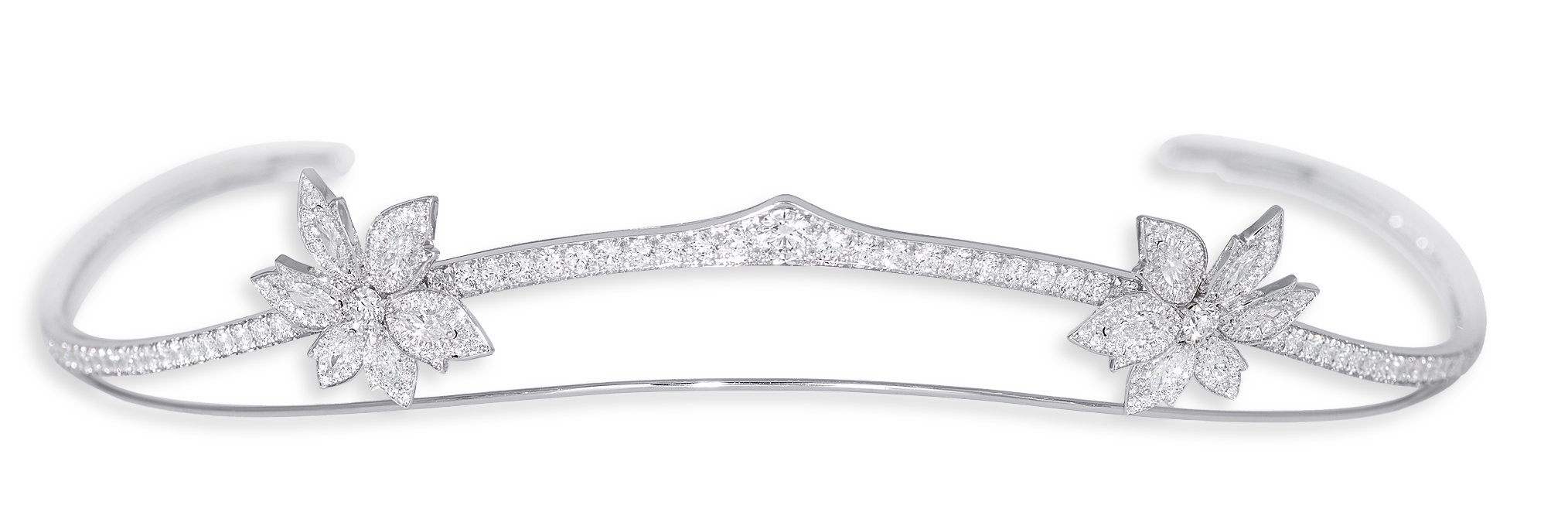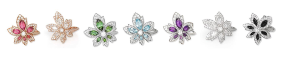 Pour refléter la gamme de couleurs trouvées dans la nature, chaque feuille est sertie de diamants blancs et d’une variété de pierres précieuses semi-précieuses : majestueuse améthyste pourpre, rubellite rose royal, tourmaline vert luxuriant et aigue-marine bleu perçant. La nacre blanche, l’onyx noir et la version tout-diamant proposent des alternatives plus classiques mais tout aussi élégantes.