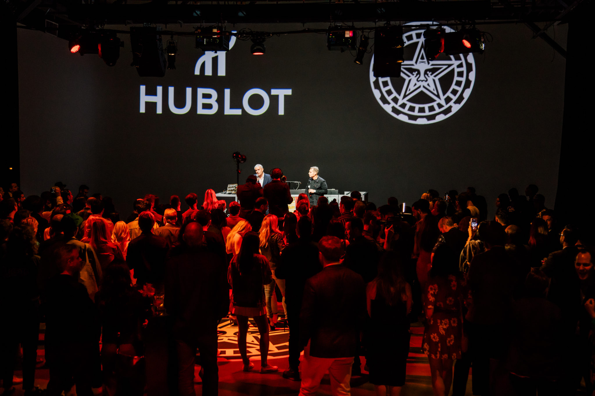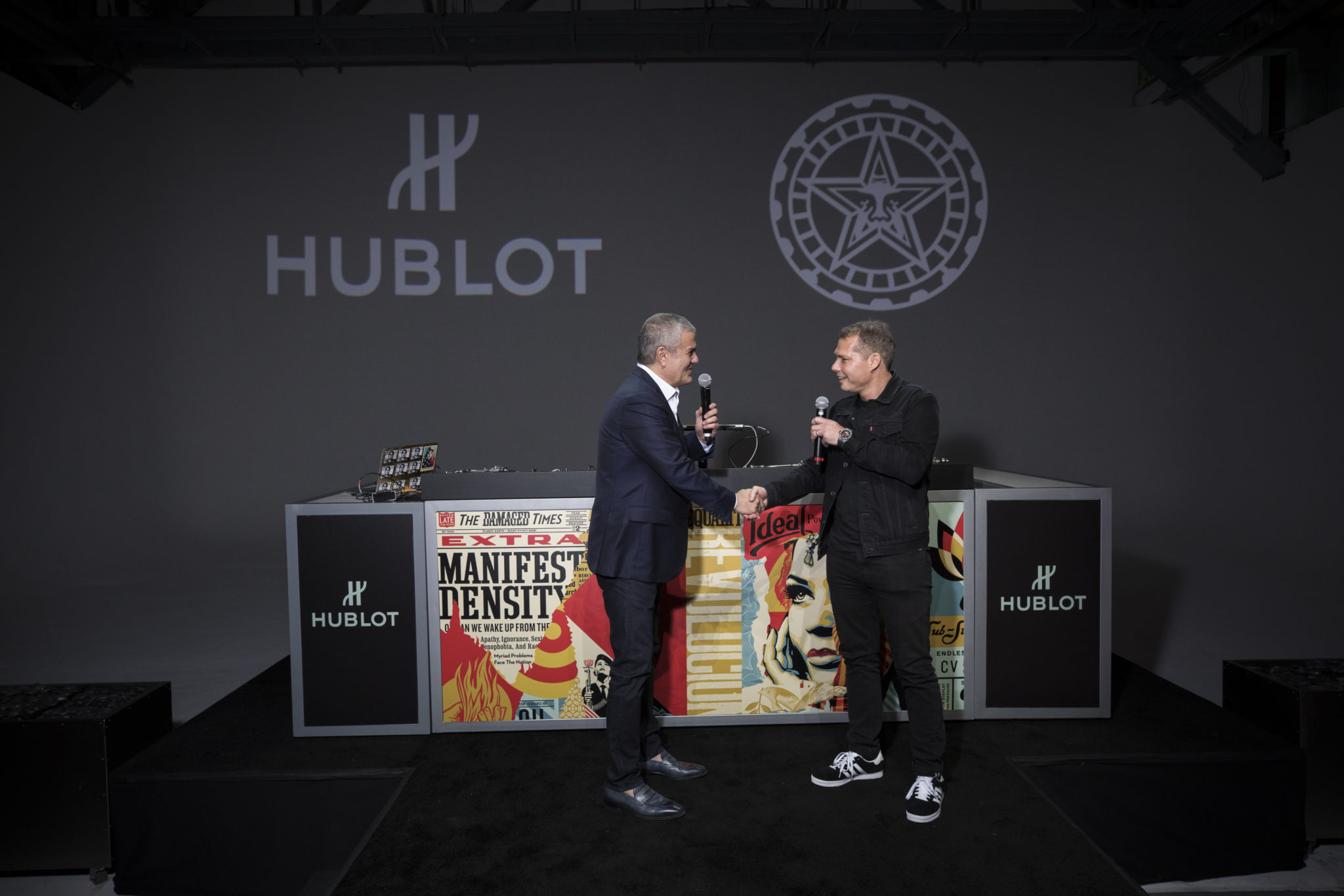 Ricardo Guadalupe, CEO de Hublot, a commencé par annoncer que Shepard Fairey intégrait la famille Hublot. Ensemble, ils ont ensuite dévoilé la nouvelle Big Bang Shepard Fairey dans les studios Mack Sennett, un lieu historique du quartier Silver Lake, à Los Angeles Est. La soirée a ainsi réuni des VIP, des médias, des influenceurs et des amis de la marque. Parmi les grandes figures présentes, on a pu voir le groupe de rock Franz Ferdinand, le comédien Joel McHale, les artistes LOVE WATTS et Okuda, le curateur de l’exposition de street art « Beyond The Streets » Roger Gastman, l’actuer Duane McLaughlin, la chanteuse Petite Meller. Tout au long de la soirée, les invités ont assisté à divers divertissements interactifs, avec notamment un DJ en live installé par Shepard Fairey lui-même ! Le site, créé en 1916, est l’un des studios de cinéma les plus anciens de Los Angeles toujours en activité, là où ont été tournés bon nombre des premiers films. La façade arbore une imposante fresque intitulée « American Dreamers », peinte par Shepard Fairey et l’artiste Vhils en février 2018.