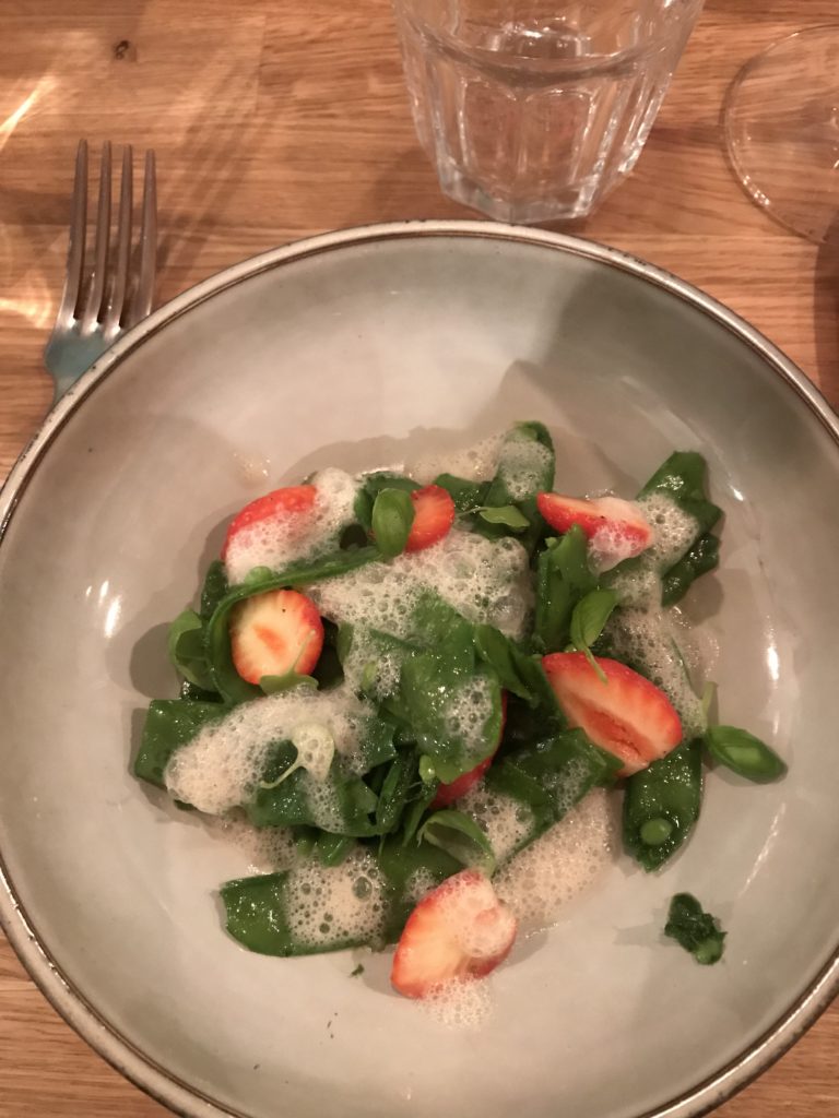 Quand on pénètre chez Mokko, on découvre un lieu qui peut paraître familier. Un resto de poche avec une déco épurée (verrière, plantes suspendues), des vins soigneusement sélectionnés et des assiettes à se partager. Un resto fait pour les hédonistes. Le menu à 39 euros pour une dégustation en cinq services tape dans le mille. La carte change tous les jours en fonction de l’inspiration et des produits de saison : velouté, charcuterie, tartares, ravioles. Ce soir là : jambon de galice, patate douce ou pois gourmands, fraise rhubarbe, maquereau cru et cuit, tartare de veau et poitrine de bœuf. C’est très créatif et les plats sont graphiques et bons.