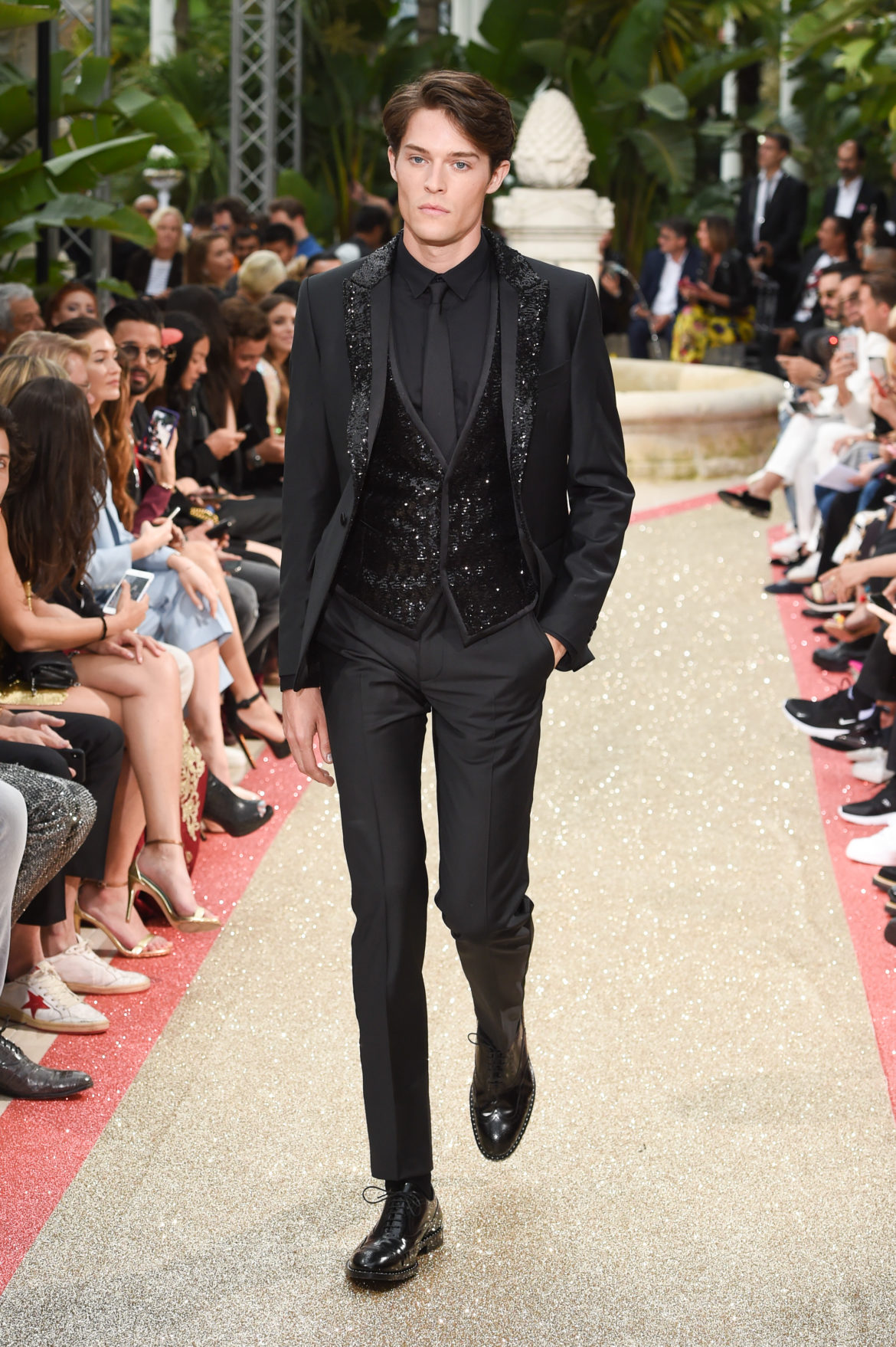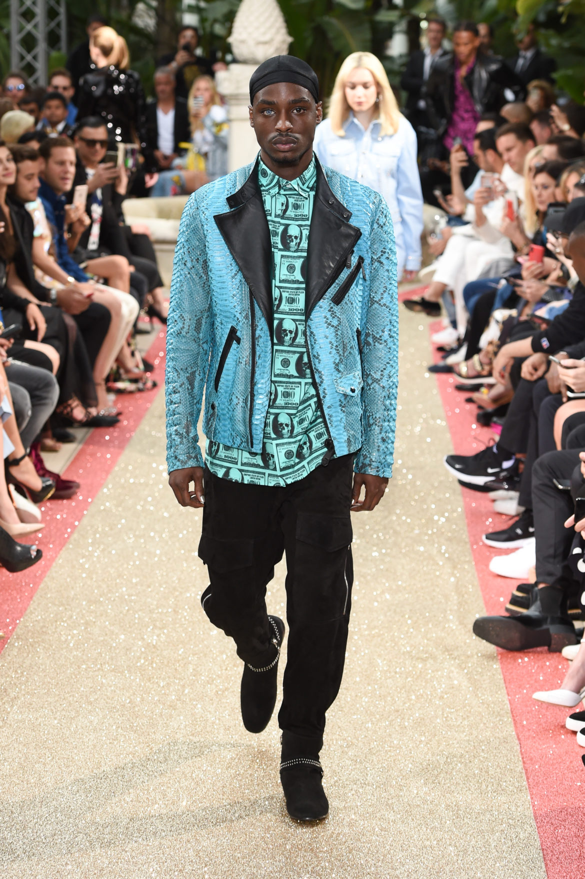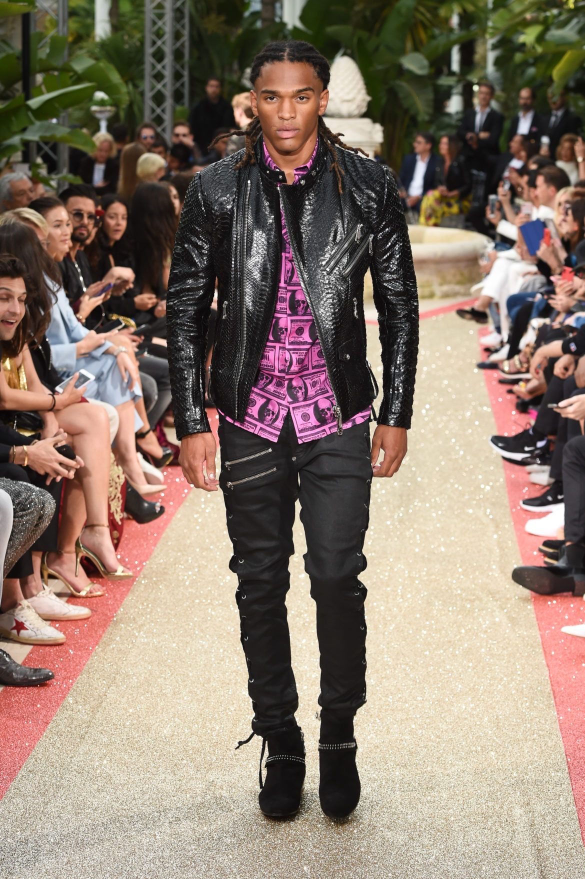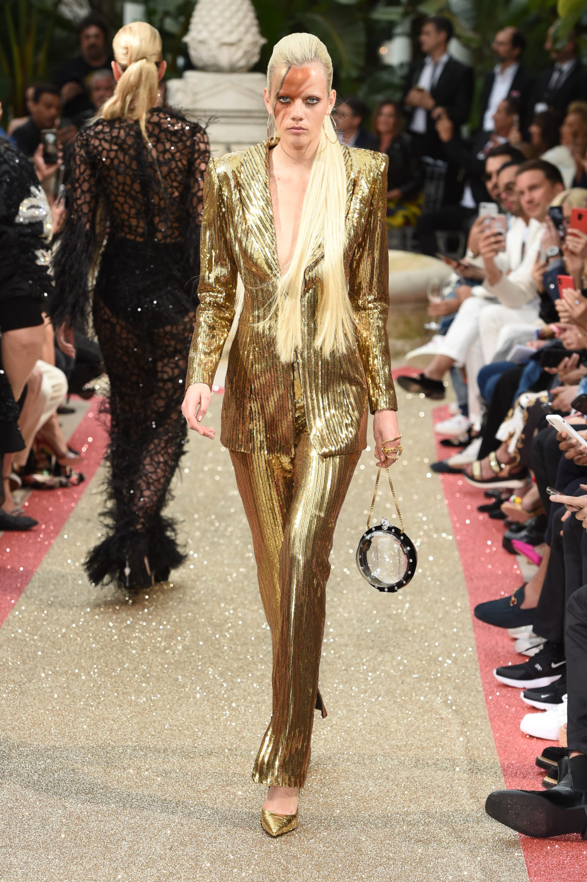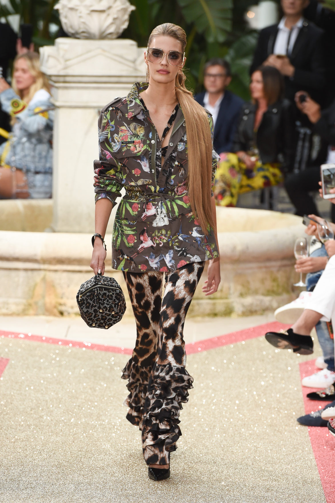 For his Resort 2019 collection, Philipp Plein once again opened the gates to his private palace on the Cote d’Azur, ‘La Jungle Du Roi’. At the entrance, on a wall of white roses, the word ‘PHILIPP PLEIN DYNASTY’ was framed by two giant ‘Ziggy Stardust’ lightning bolts – signaling an event charged with high-voltage power. The runway created in gold glitter was surrounded by the exotic garden’s palm and banana trees. The show began with David Bowie’s Rebel Rebel pounding through the speakers …