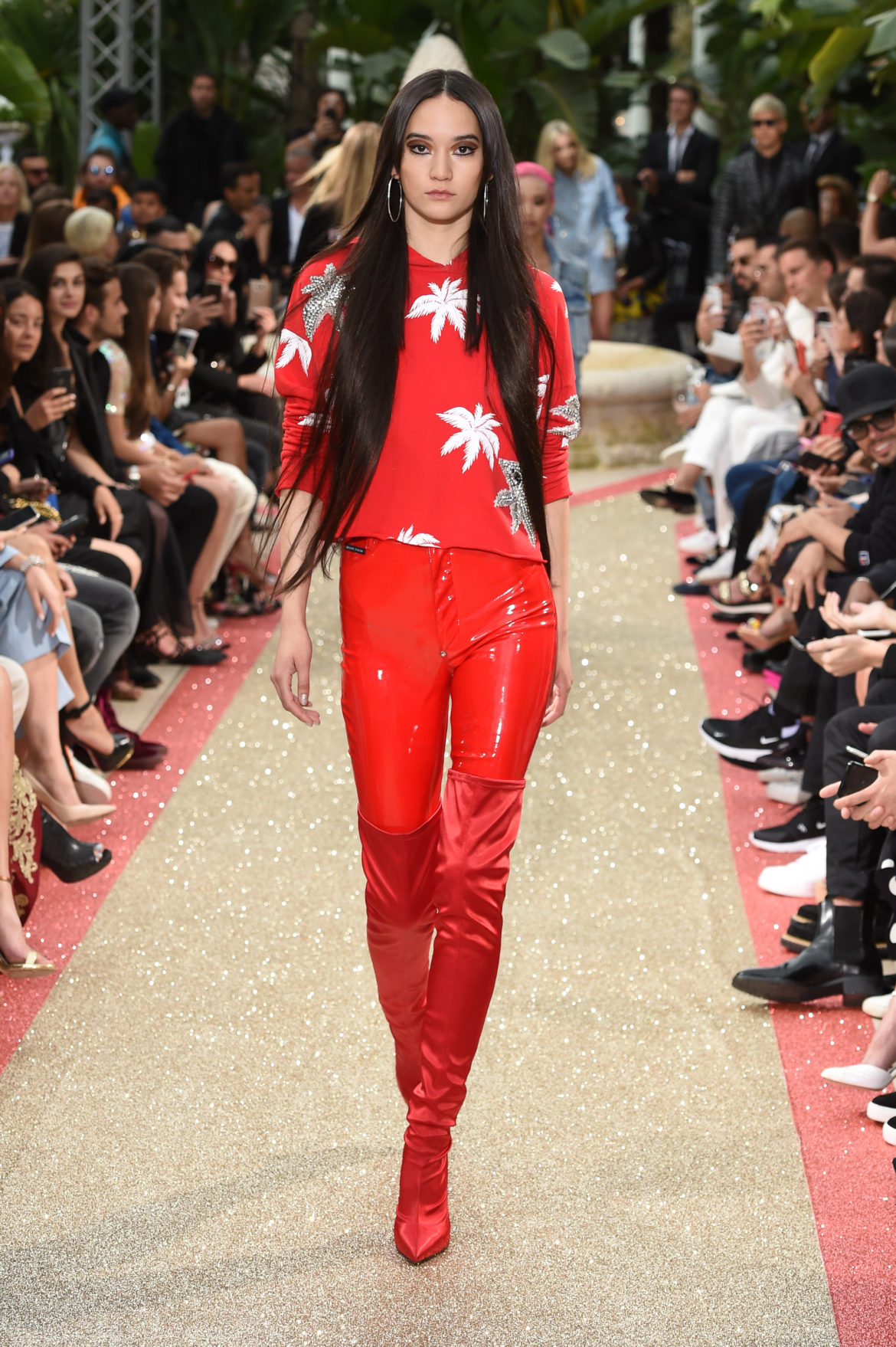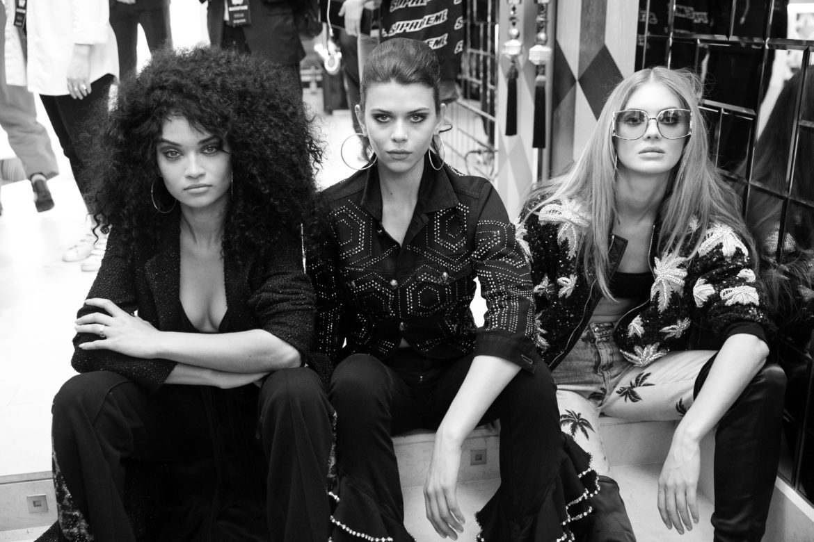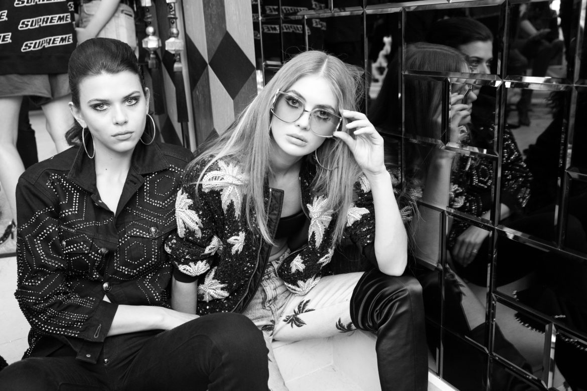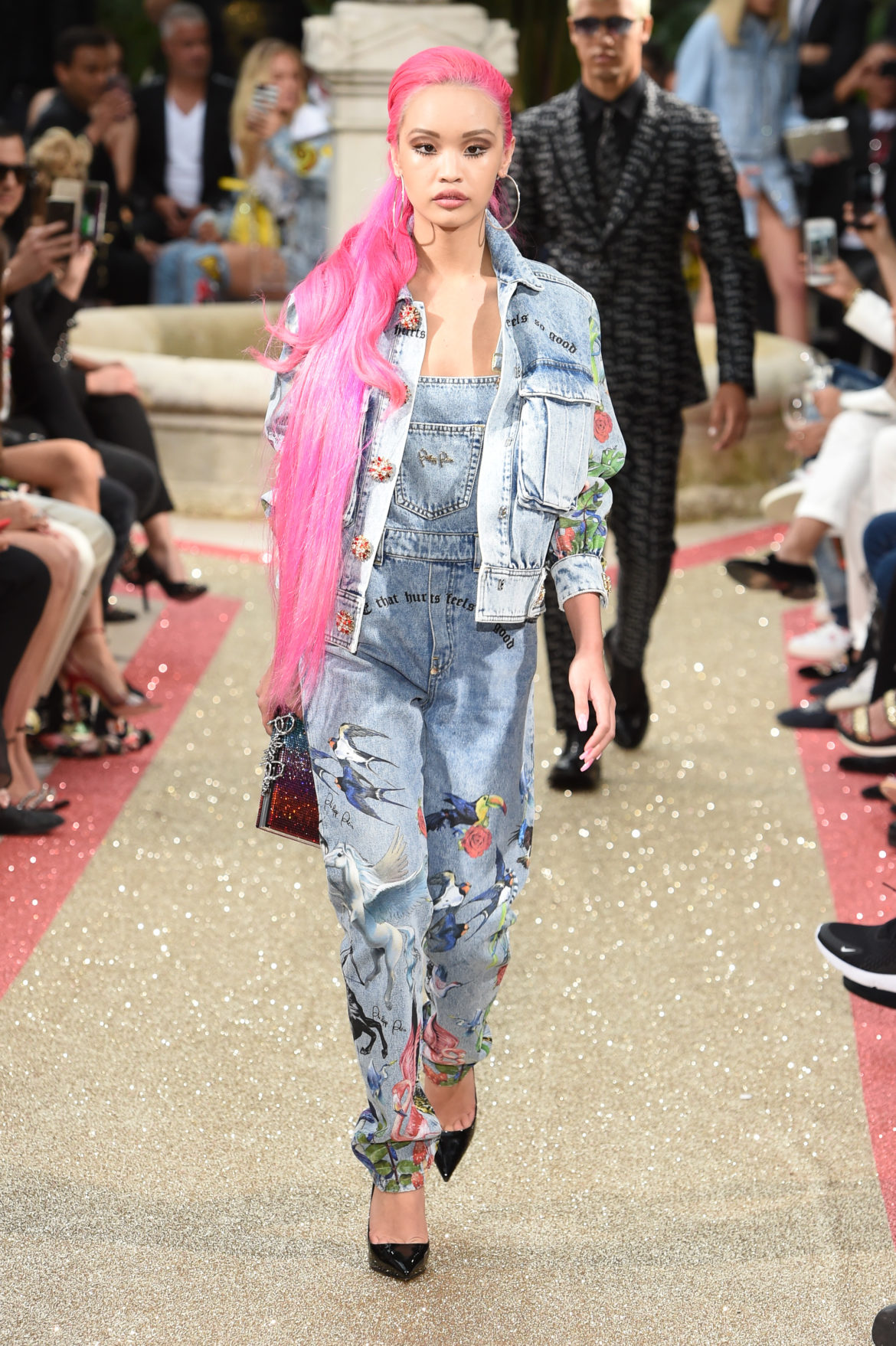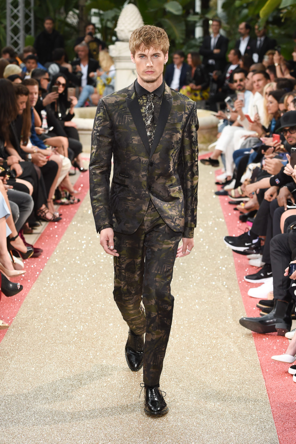 For his Resort 2019 collection, Philipp Plein once again opened the gates to his private palace on the Cote d’Azur, ‘La Jungle Du Roi’. At the entrance, on a wall of white roses, the word ‘PHILIPP PLEIN DYNASTY’ was framed by two giant ‘Ziggy Stardust’ lightning bolts – signaling an event charged with high-voltage power. The runway created in gold glitter was surrounded by the exotic garden’s palm and banana trees. The show began with David Bowie’s Rebel Rebel pounding through the speakers …