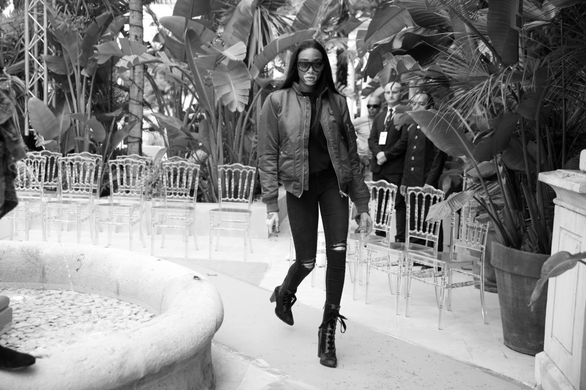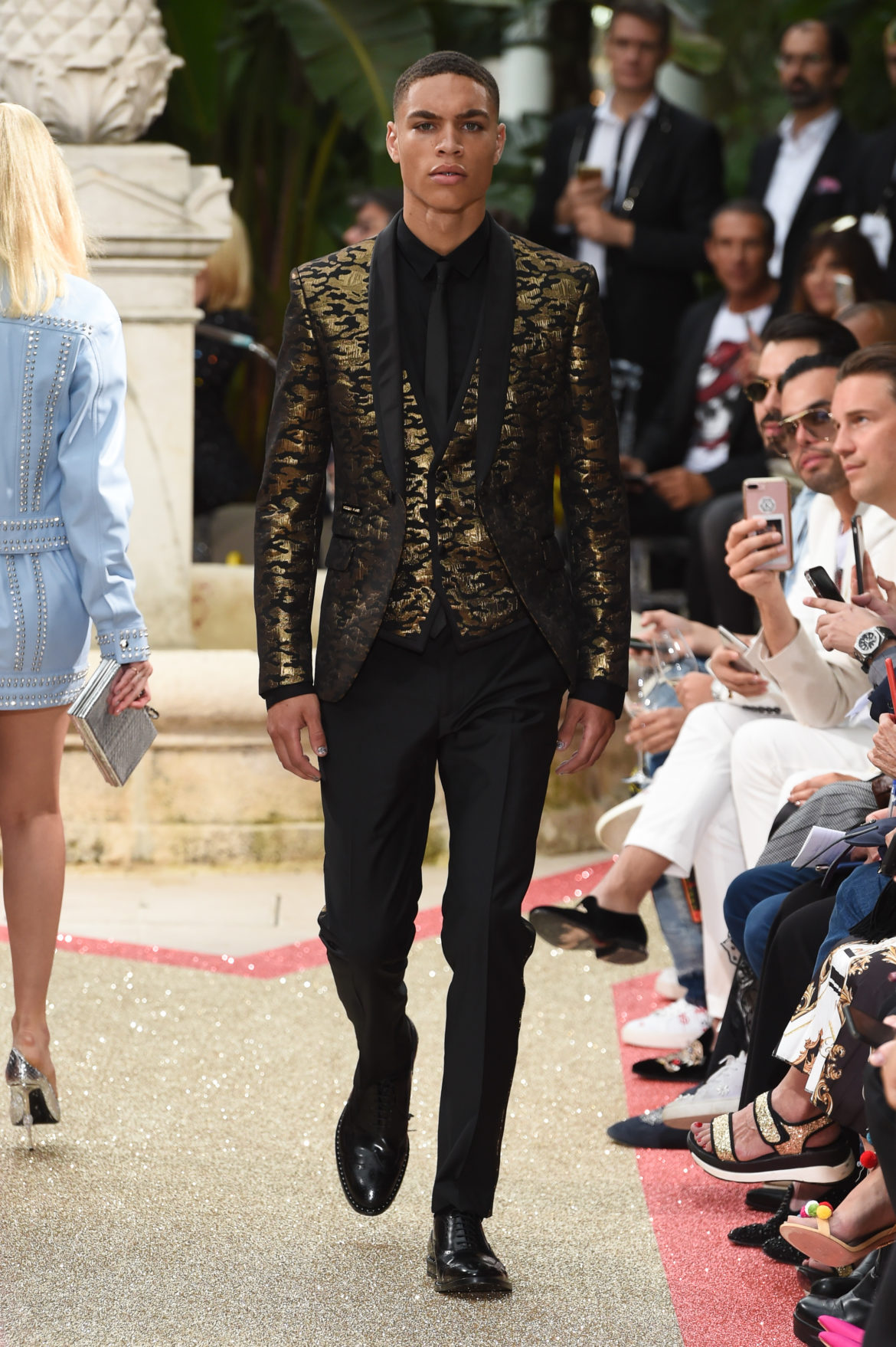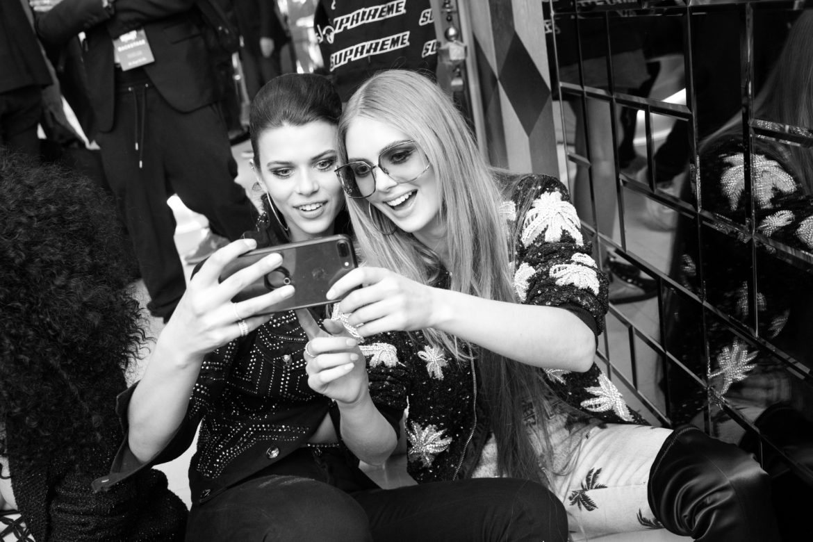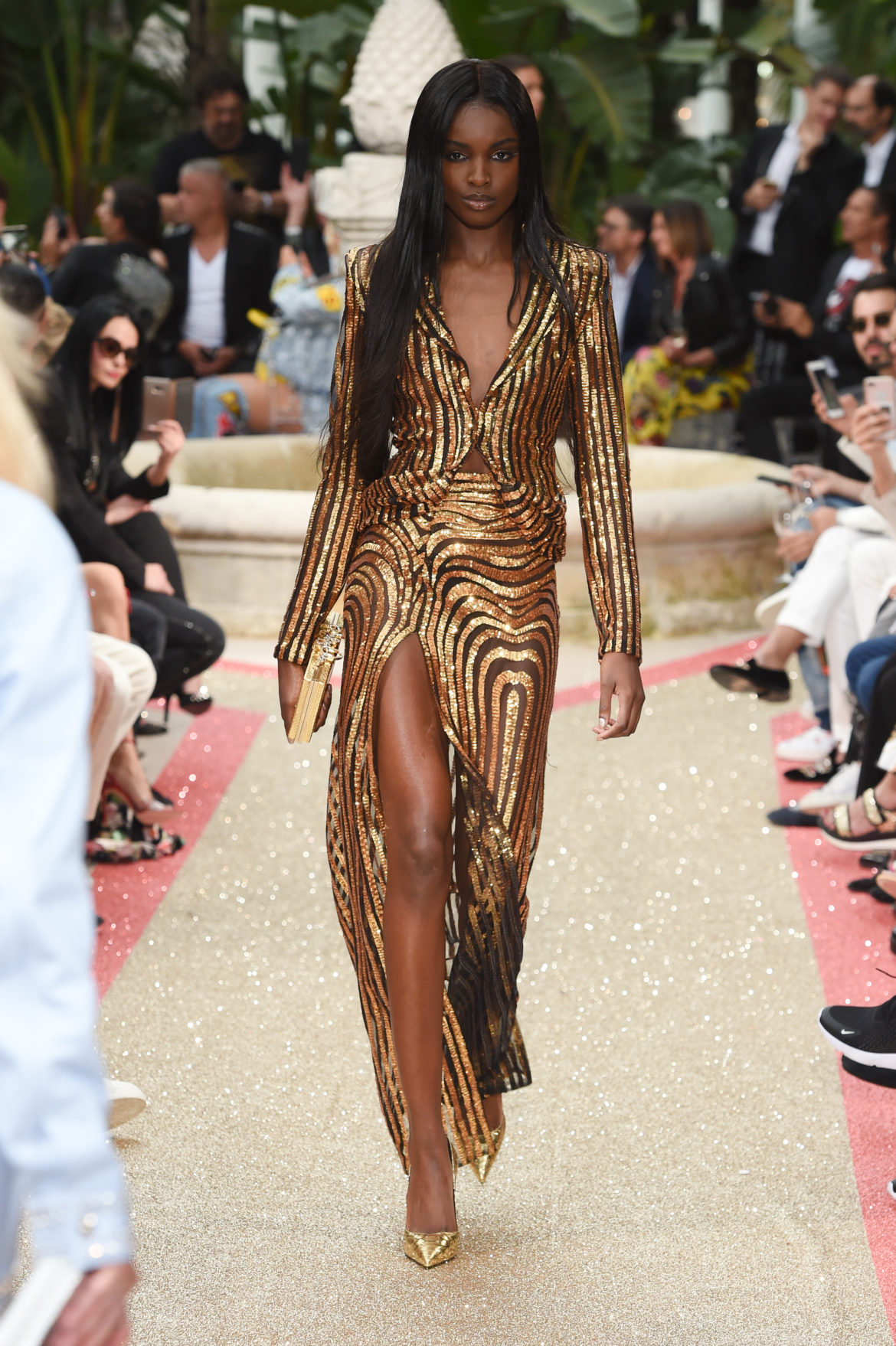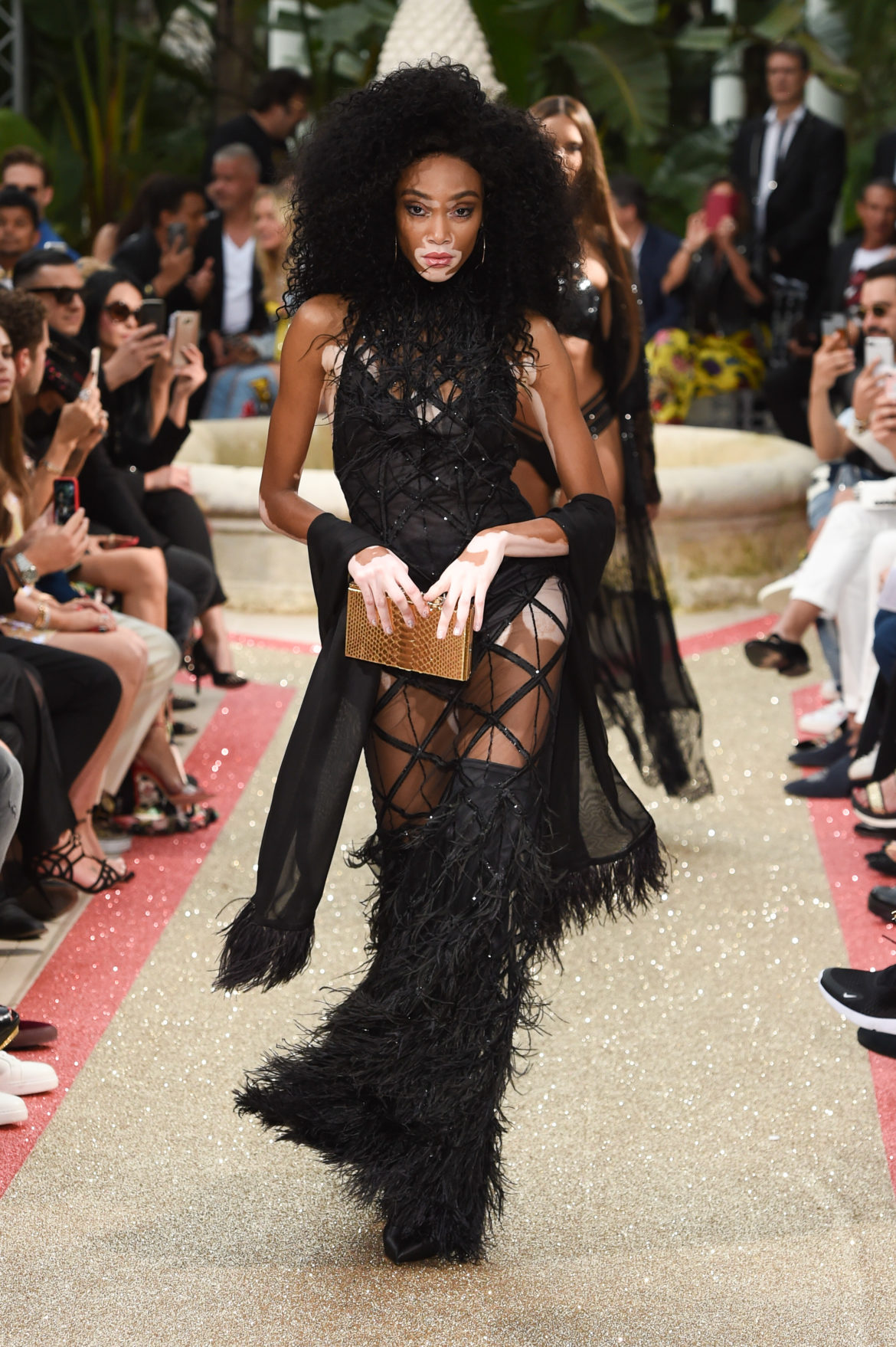 For his Resort 2019 collection, Philipp Plein once again opened the gates to his private palace on the Cote d’Azur, ‘La Jungle Du Roi’. At the entrance, on a wall of white roses, the word ‘PHILIPP PLEIN DYNASTY’ was framed by two giant ‘Ziggy Stardust’ lightning bolts – signaling an event charged with high-voltage power. The runway created in gold glitter was surrounded by the exotic garden’s palm and banana trees. The show began with David Bowie’s Rebel Rebel pounding through the speakers …