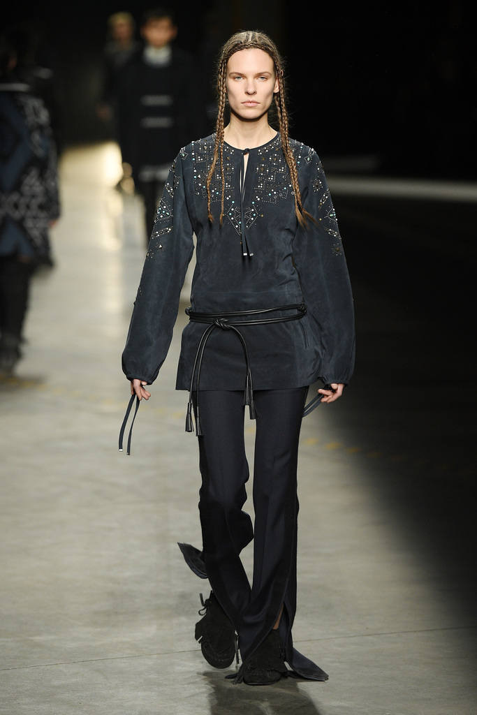 Wool flannel and vintage washed denim dresses, showing embroidered and multi studded plastrons, are cut in flared silhouettes referring Afghan Nuristan styles, while suede, leather and denim tops echo the shapes of Syrian tunics.