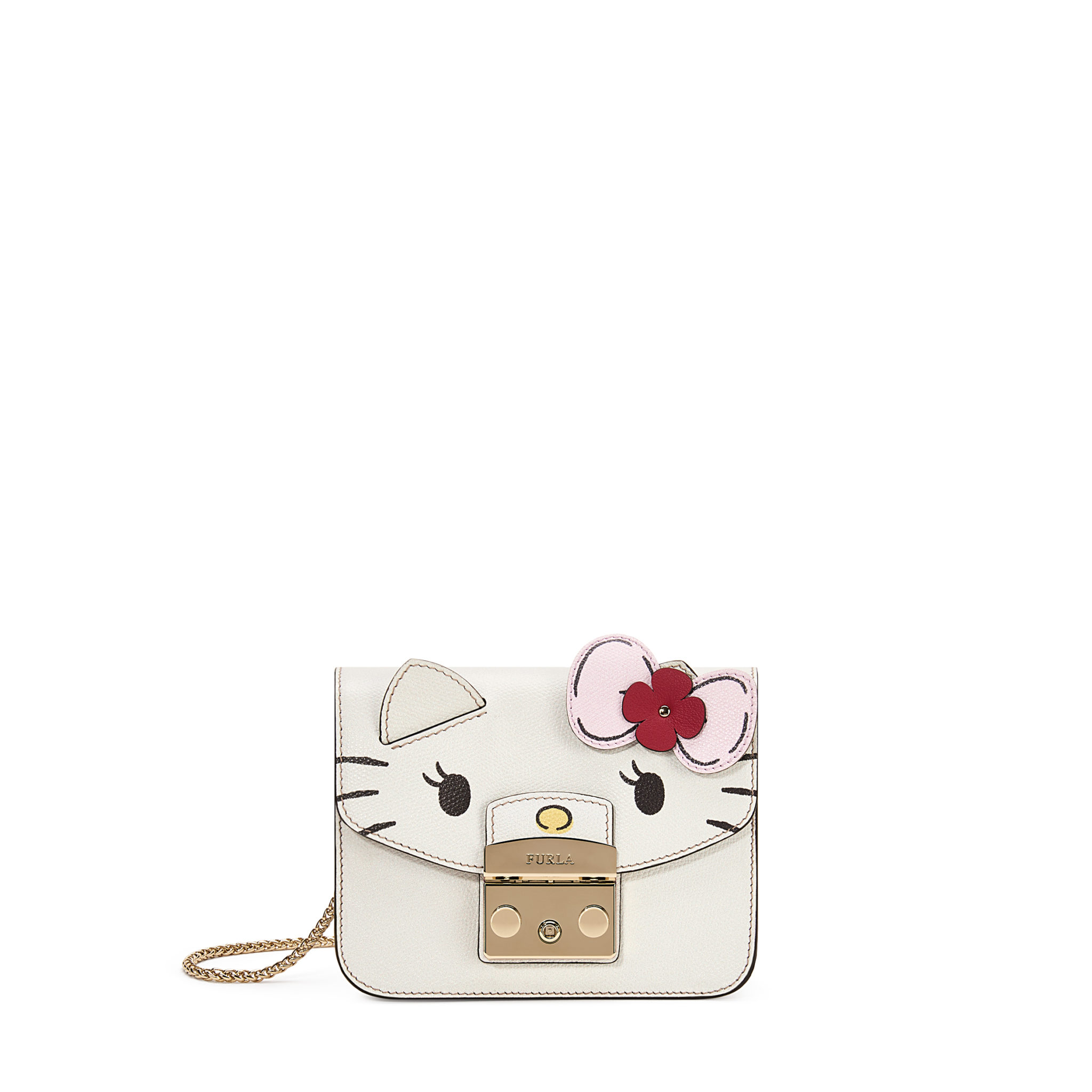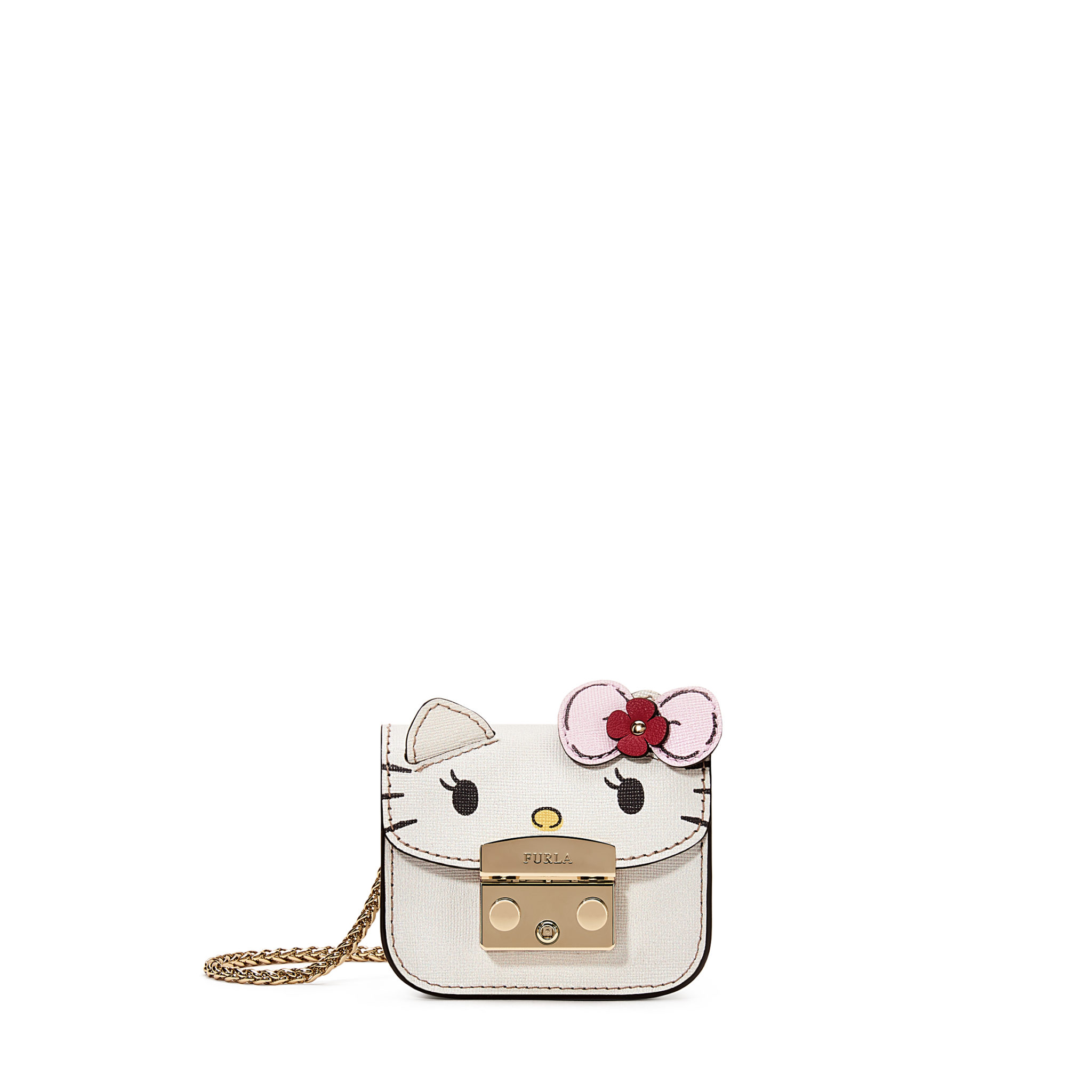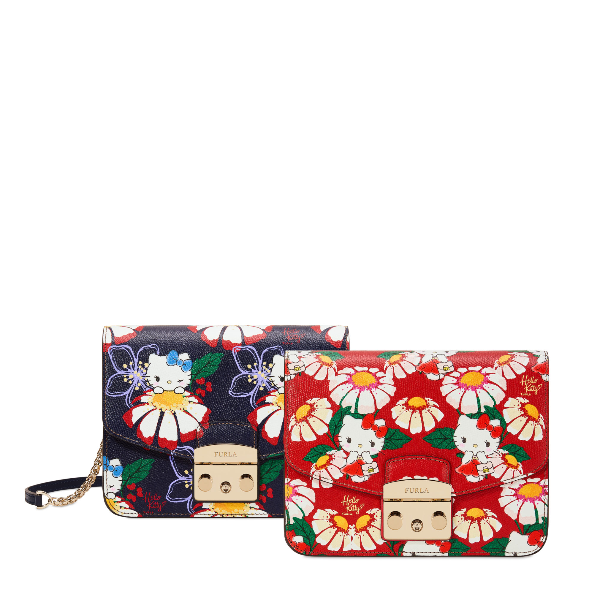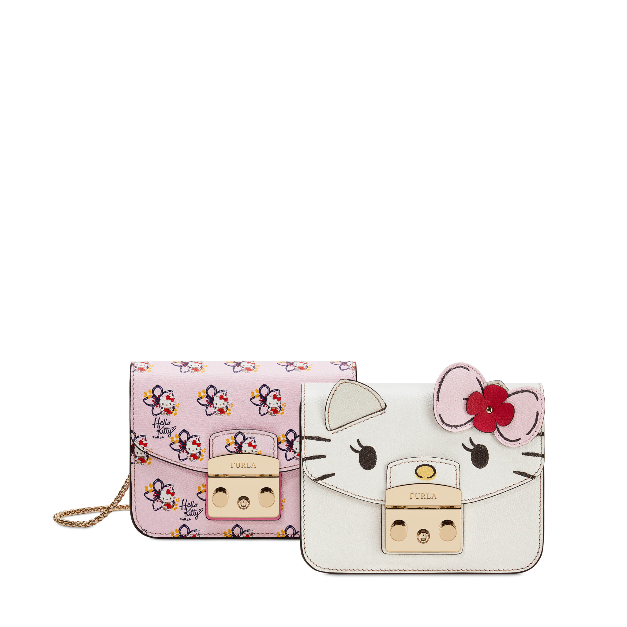 Le partenariat entre Hello Kitty et Furla se décline avec des micro-sacs, porte-clés, étuis pour cartes de crédit, étuis de cosmétiques et pochettes reprenant les imprimés et les thèmes du Metropolis.