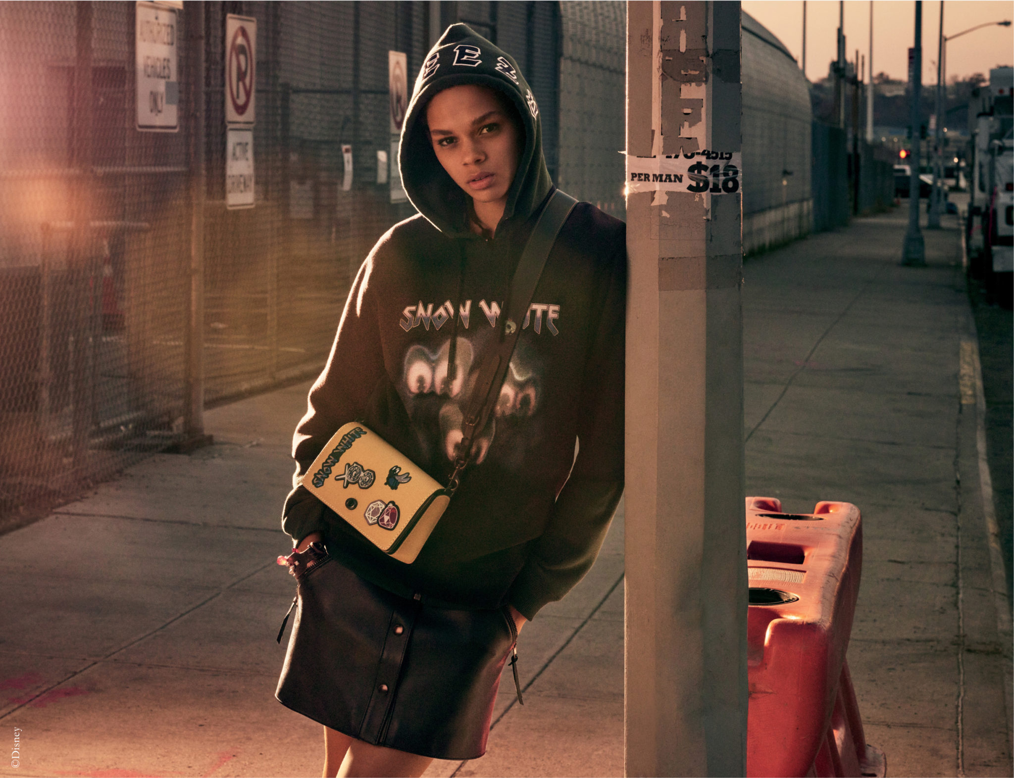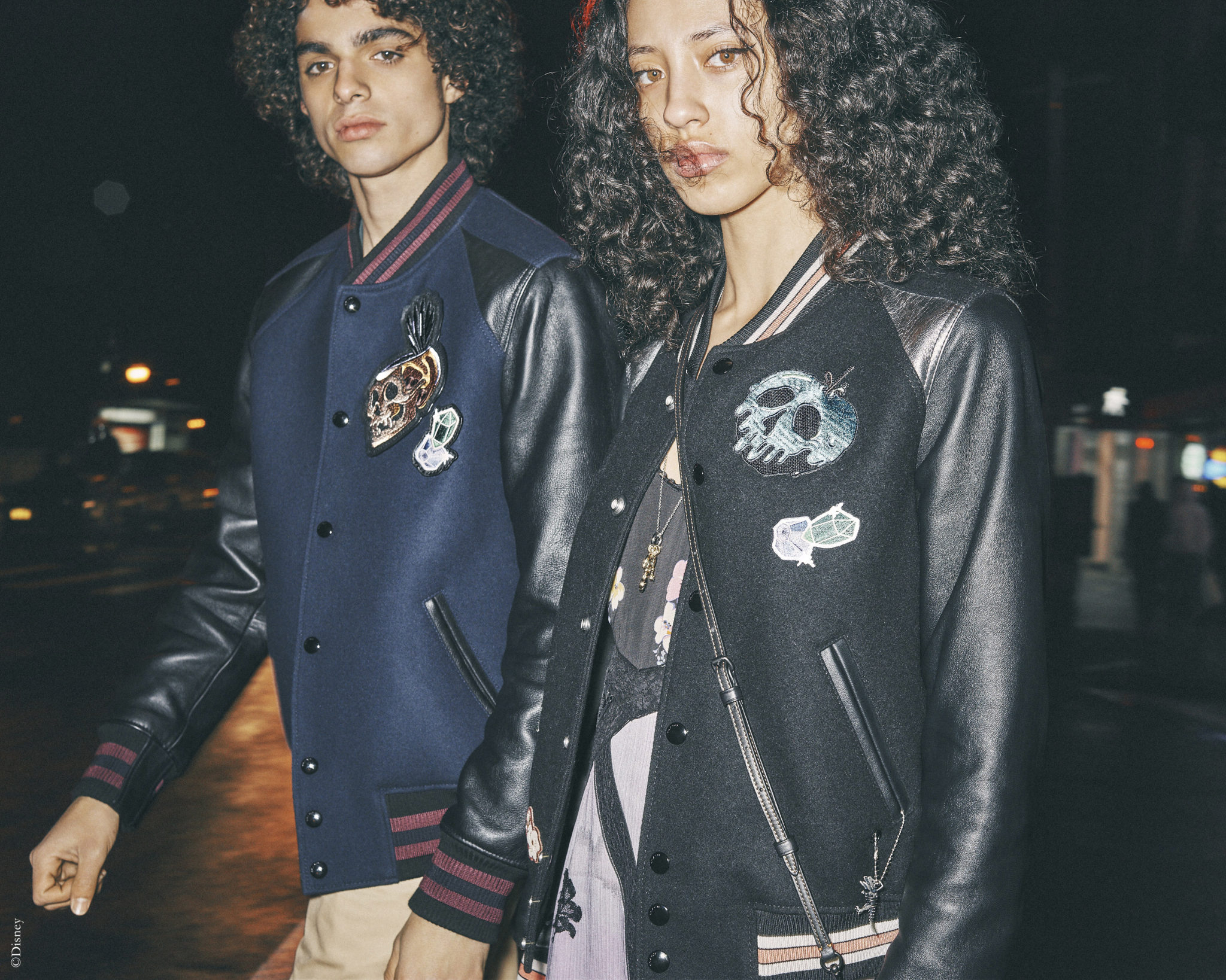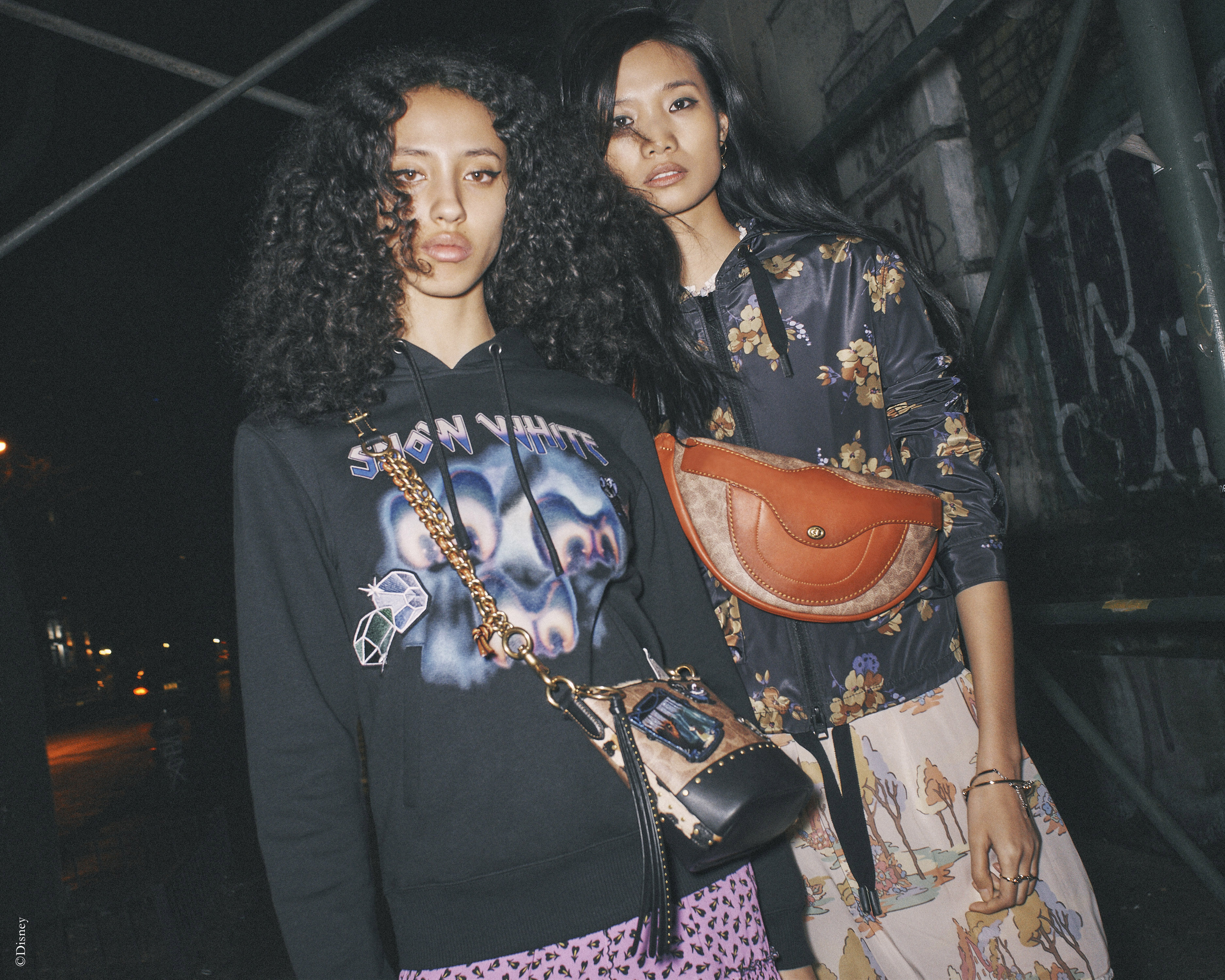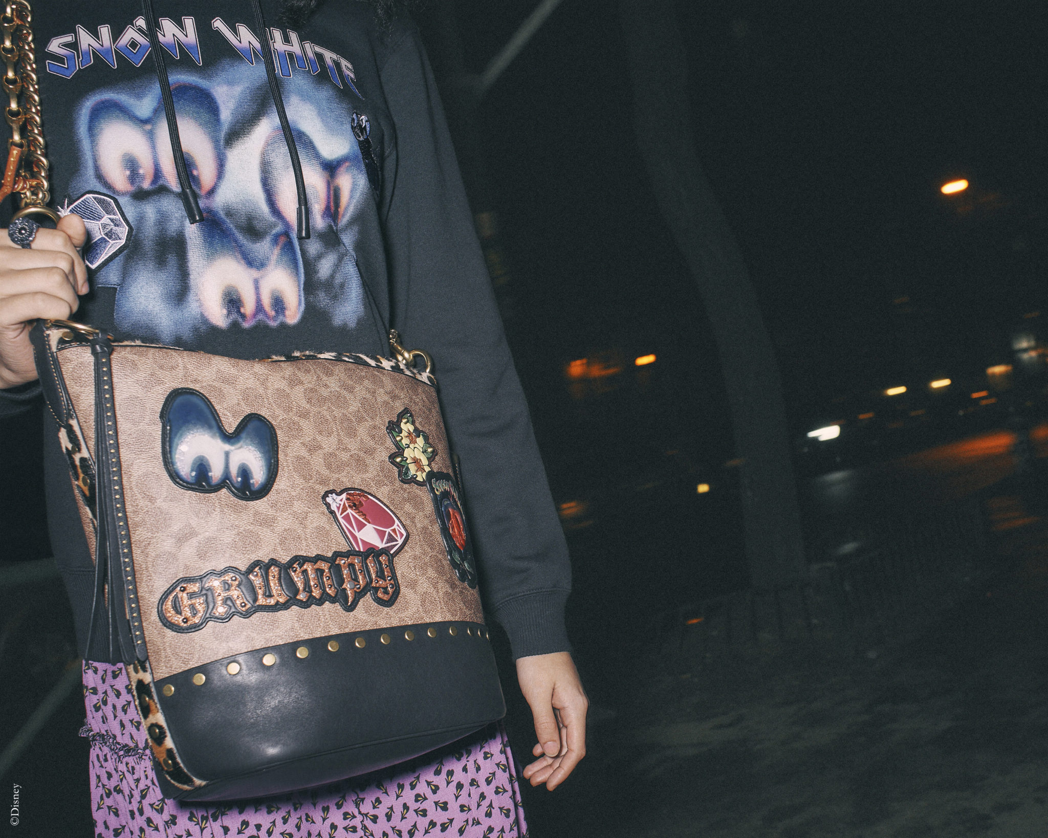 La collection recrée des motifs de Blanche Neige et les Sept Nains et de la Belle au Bois Dormant—des silhouettes inquiétantes de châteaux, des pommes empoisonnées et des créatures des bois aux yeux écarquillés—‘en mode épouvante’. Des T-shirts à police rock’n’roll et couleurs rétro sont portés avec des blousons de motard, et on aperçoit l’imprimé signature de Coach réécrit en juxtaposition avec des éléments graphiques pour un résultat résolument nouveau. On note aussi le sportswear américain de Coach : des sweats à capuche en jersey, des baskets et des sacs banane décorés d’écussons et autres détails Disney. Un écusson spécial a également été créé pour mettre à l’honneur les conteurs de Disney et les artisans de Coach.