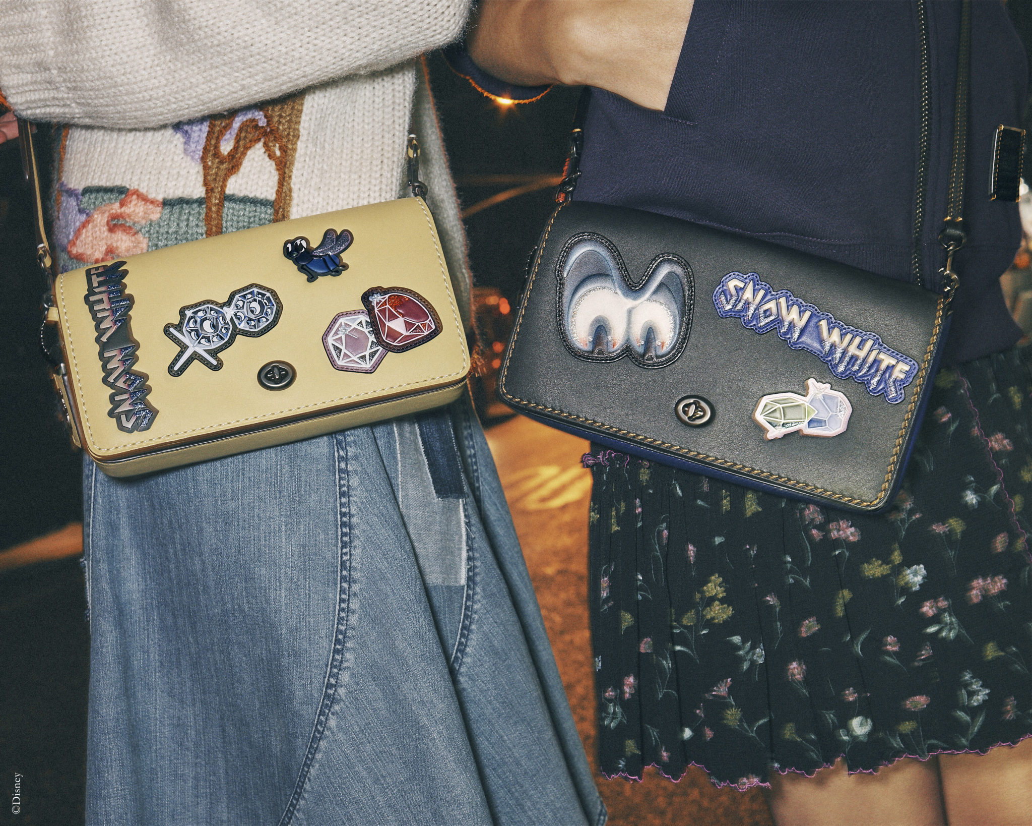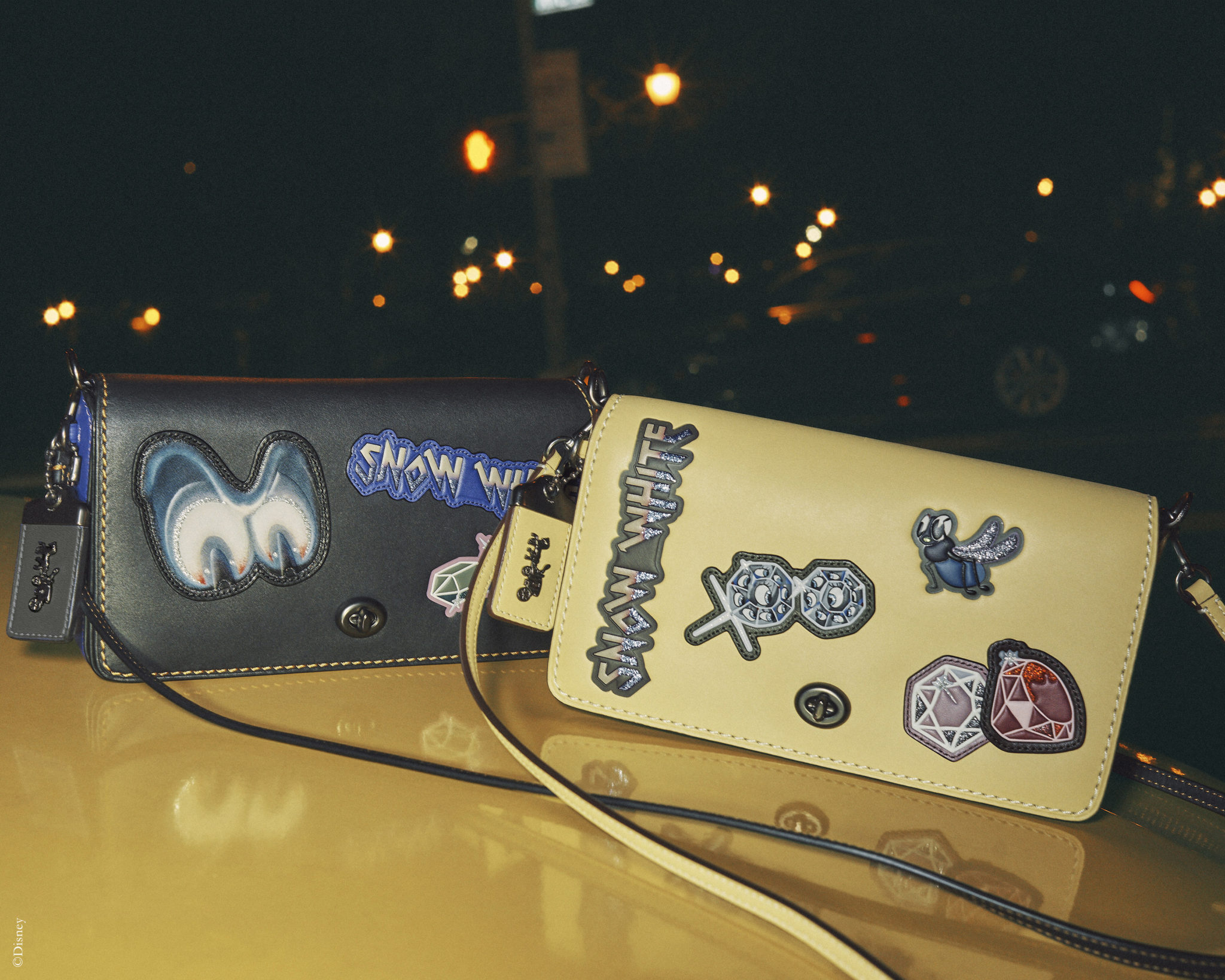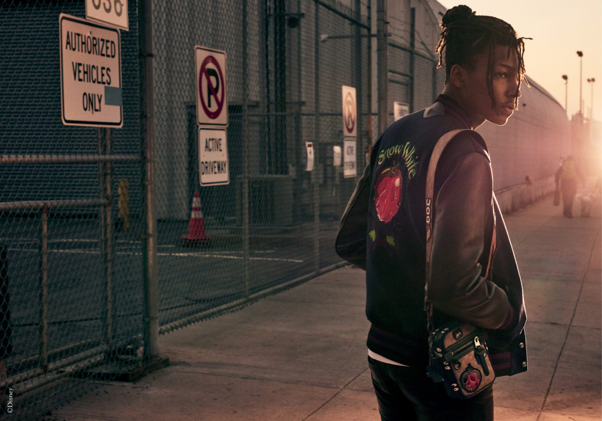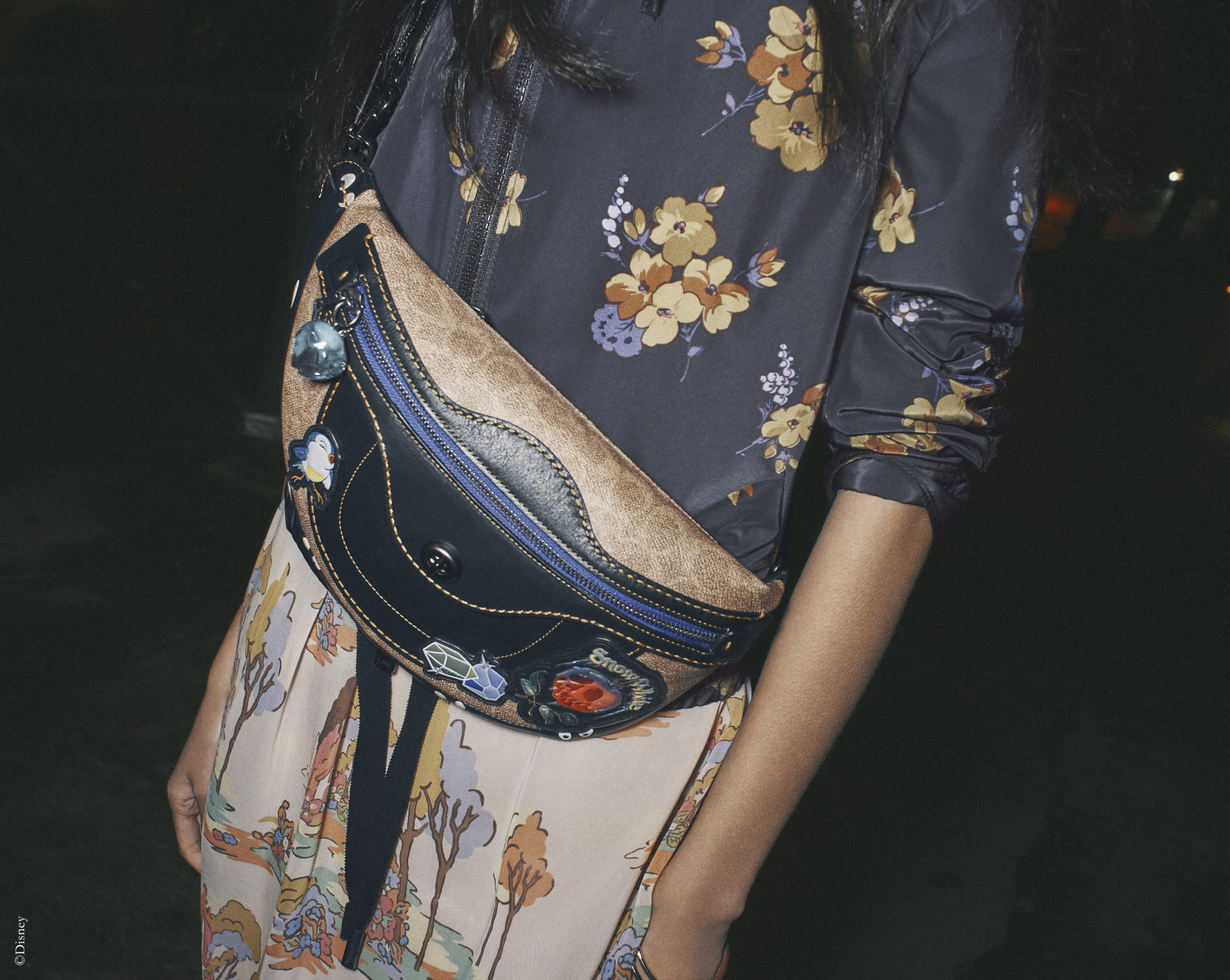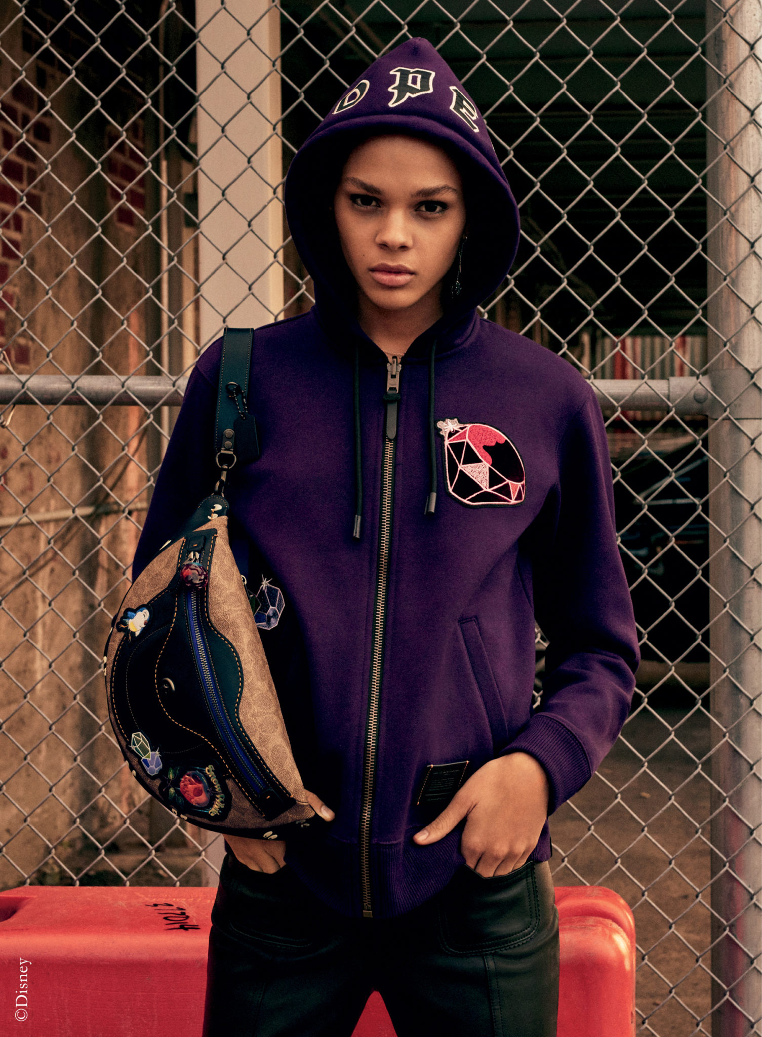 La collection recrée des motifs de Blanche Neige et les Sept Nains et de la Belle au Bois Dormant—des silhouettes inquiétantes de châteaux, des pommes empoisonnées et des créatures des bois aux yeux écarquillés—‘en mode épouvante’. Des T-shirts à police rock’n’roll et couleurs rétro sont portés avec des blousons de motard, et on aperçoit l’imprimé signature de Coach réécrit en juxtaposition avec des éléments graphiques pour un résultat résolument nouveau. On note aussi le sportswear américain de Coach : des sweats à capuche en jersey, des baskets et des sacs banane décorés d’écussons et autres détails Disney. Un écusson spécial a également été créé pour mettre à l’honneur les conteurs de Disney et les artisans de Coach.