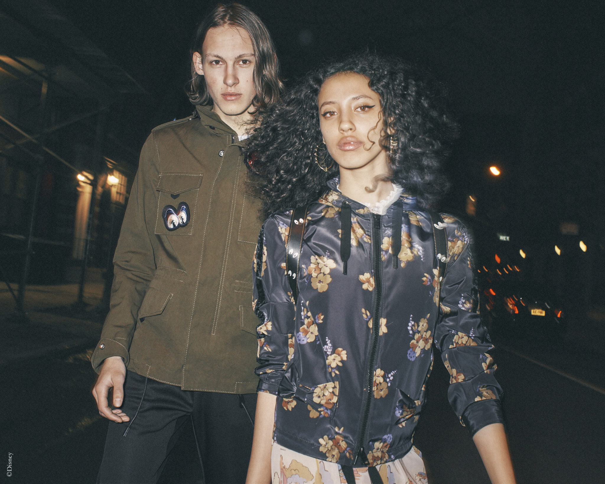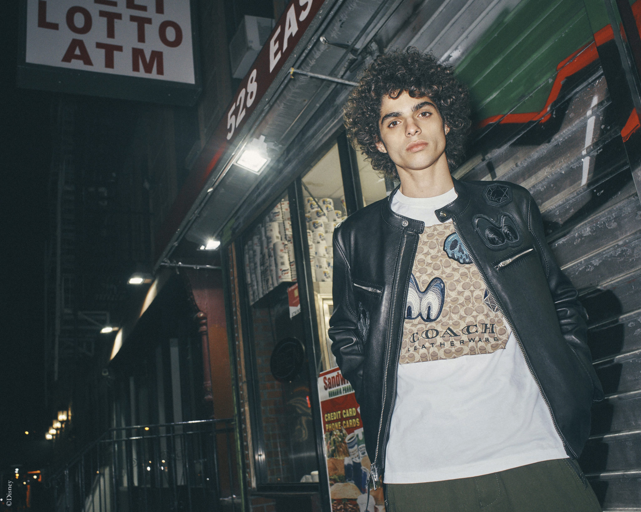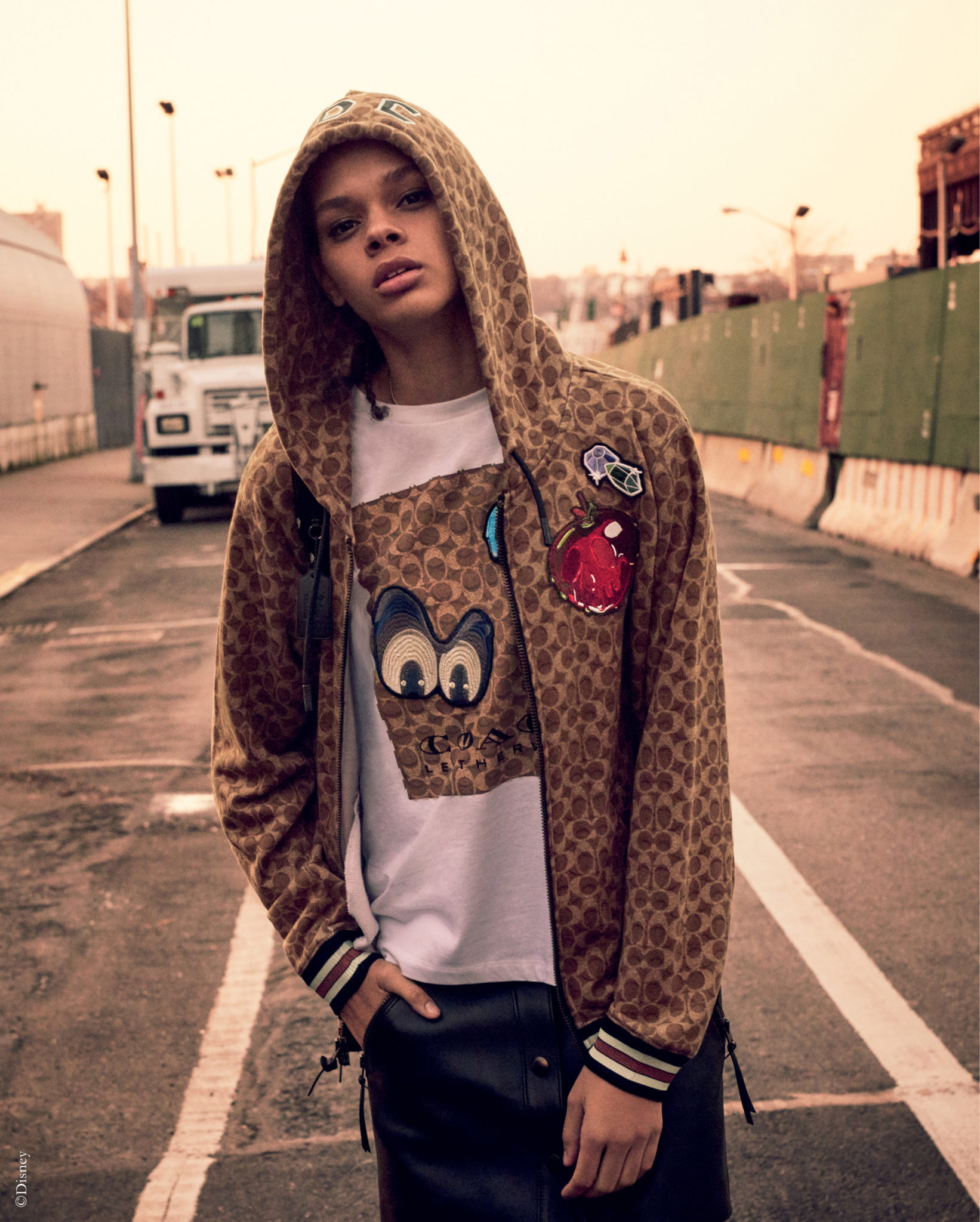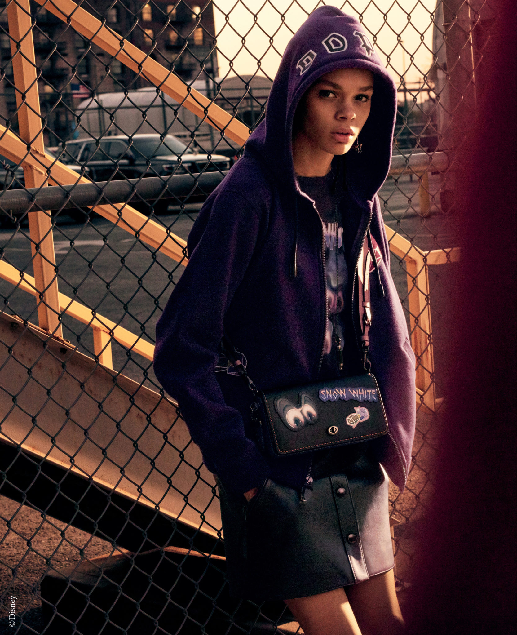 La collection recrée des motifs de Blanche Neige et les Sept Nains et de la Belle au Bois Dormant—des silhouettes inquiétantes de châteaux, des pommes empoisonnées et des créatures des bois aux yeux écarquillés—‘en mode épouvante’. Des T-shirts à police rock’n’roll et couleurs rétro sont portés avec des blousons de motard, et on aperçoit l’imprimé signature de Coach réécrit en juxtaposition avec des éléments graphiques pour un résultat résolument nouveau. On note aussi le sportswear américain de Coach : des sweats à capuche en jersey, des baskets et des sacs banane décorés d’écussons et autres détails Disney. Un écusson spécial a également été créé pour mettre à l’honneur les conteurs de Disney et les artisans de Coach.