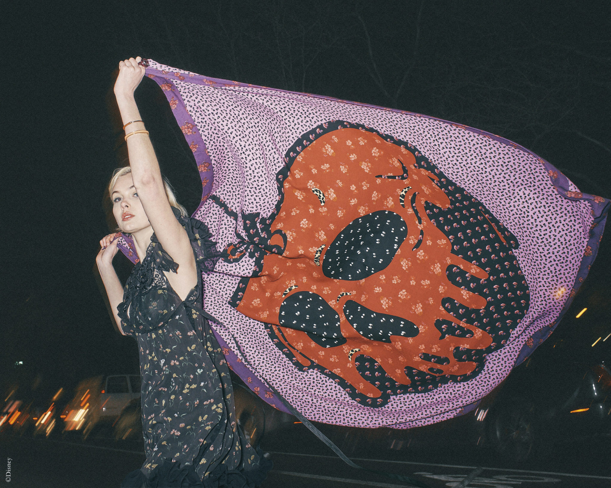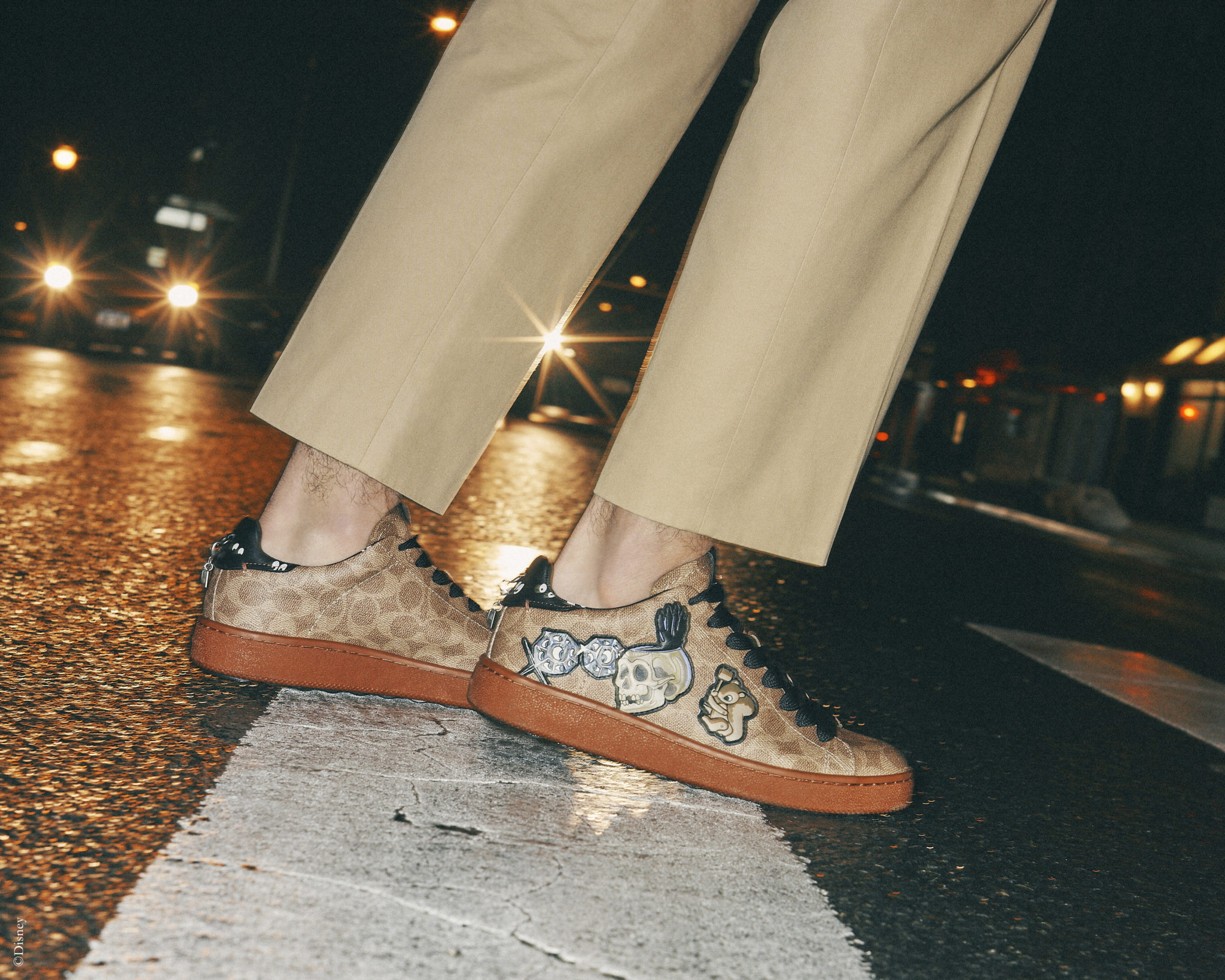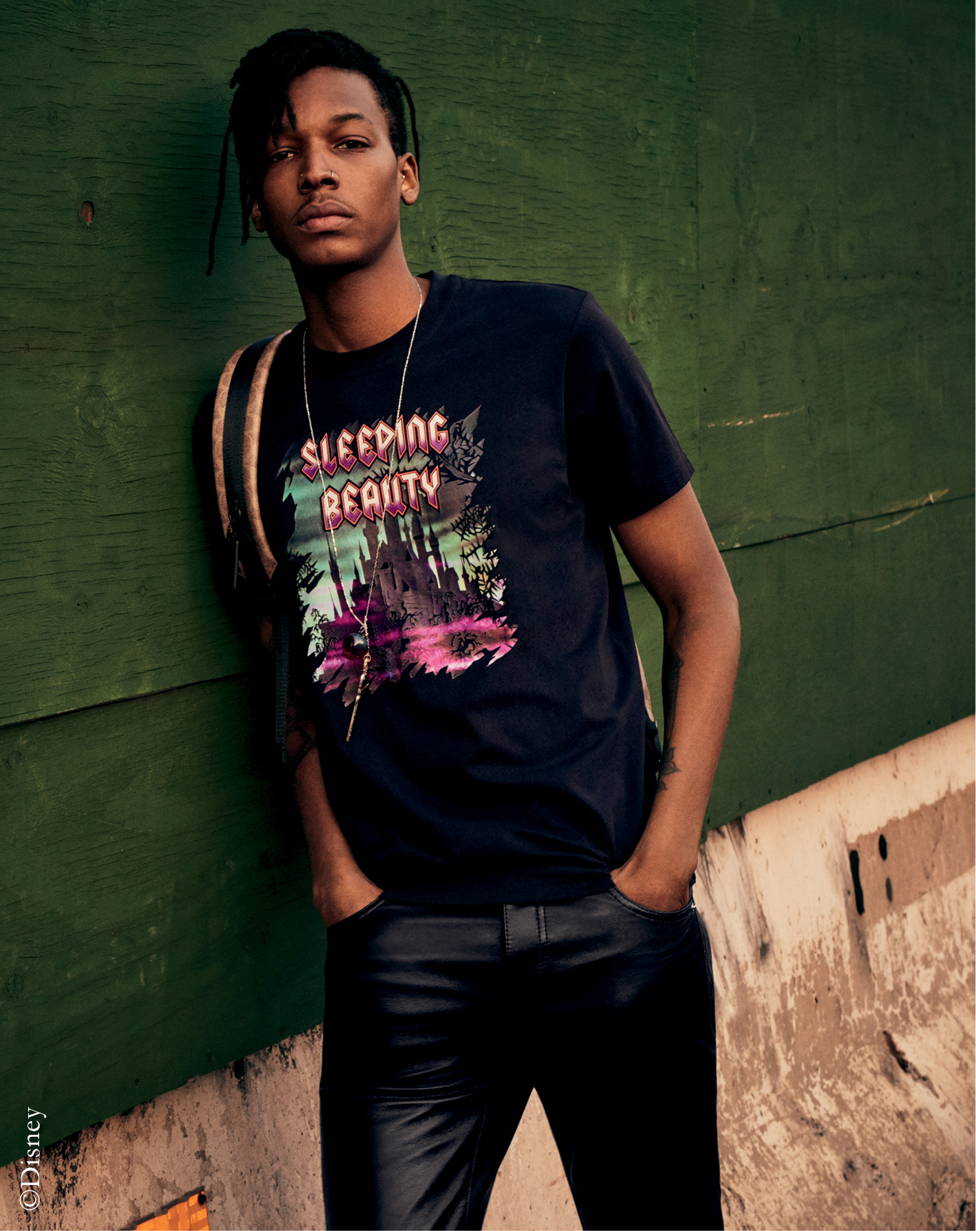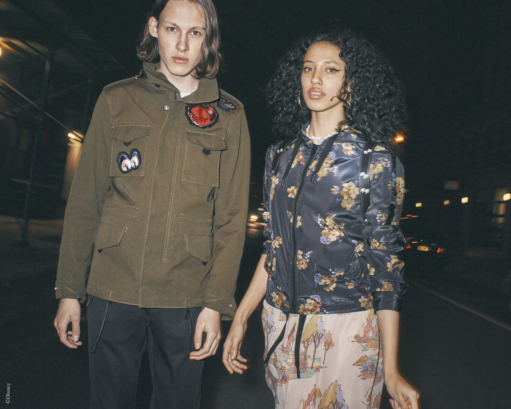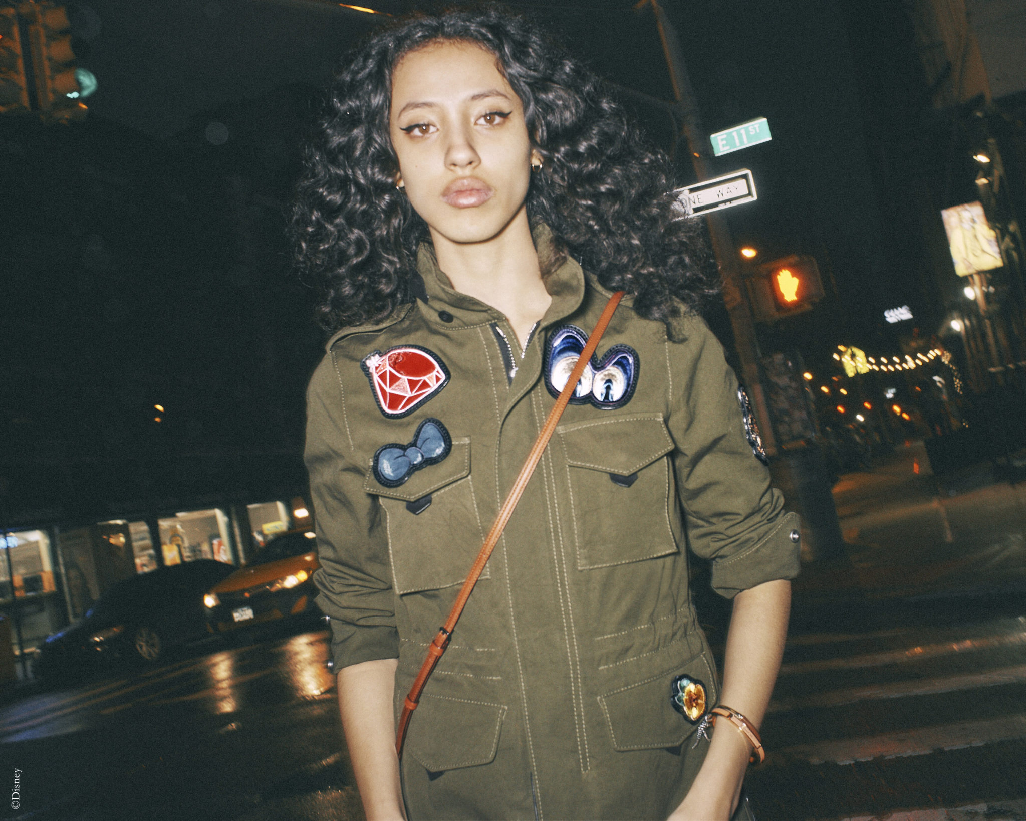 La collection recrée des motifs de Blanche Neige et les Sept Nains et de la Belle au Bois Dormant—des silhouettes inquiétantes de châteaux, des pommes empoisonnées et des créatures des bois aux yeux écarquillés—‘en mode épouvante’. Des T-shirts à police rock’n’roll et couleurs rétro sont portés avec des blousons de motard, et on aperçoit l’imprimé signature de Coach réécrit en juxtaposition avec des éléments graphiques pour un résultat résolument nouveau. On note aussi le sportswear américain de Coach : des sweats à capuche en jersey, des baskets et des sacs banane décorés d’écussons et autres détails Disney. Un écusson spécial a également été créé pour mettre à l’honneur les conteurs de Disney et les artisans de Coach.