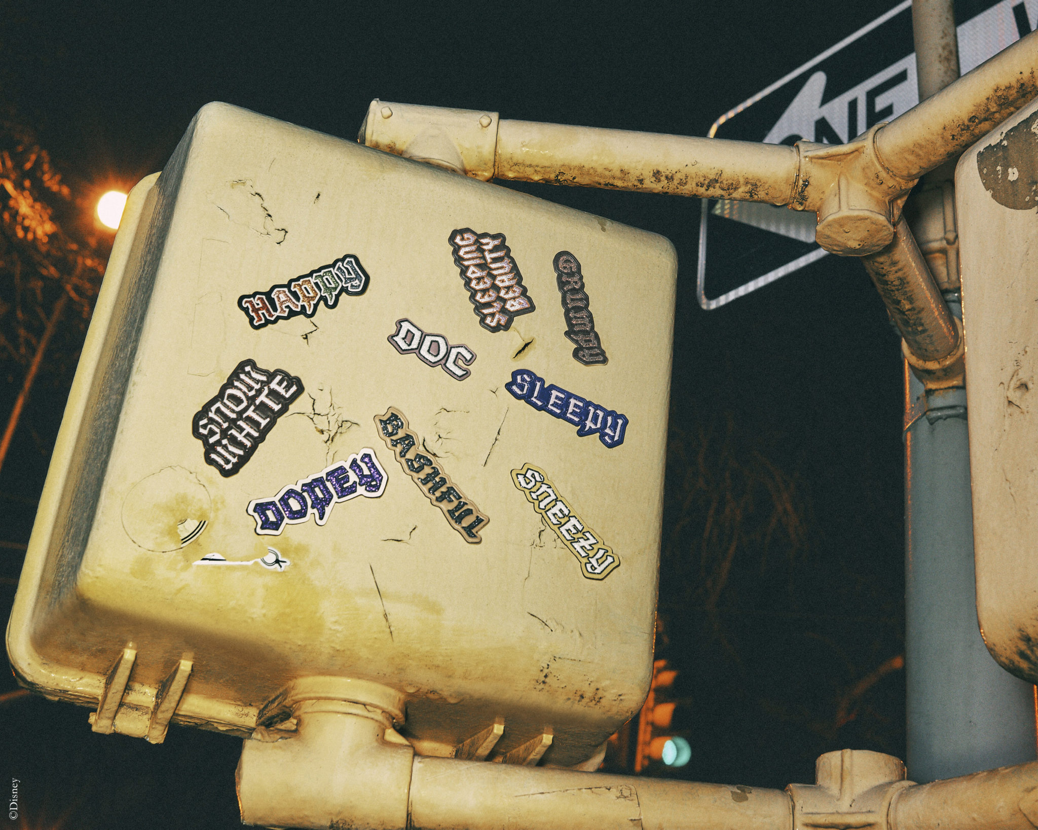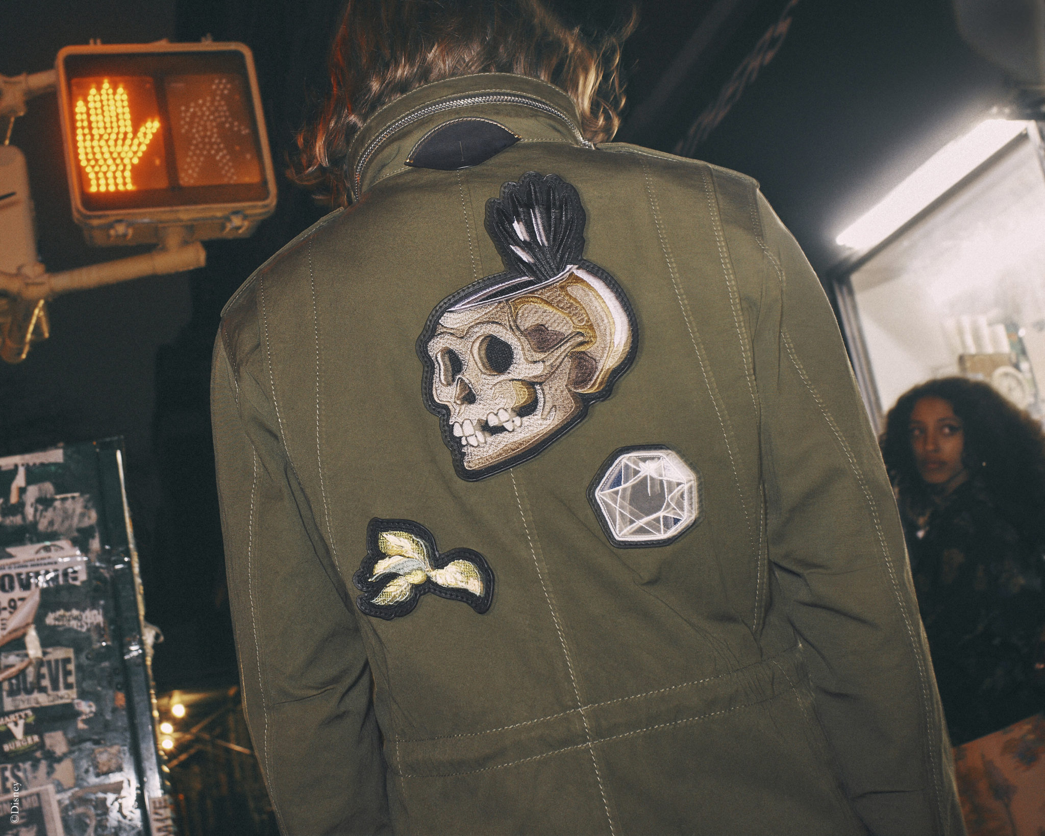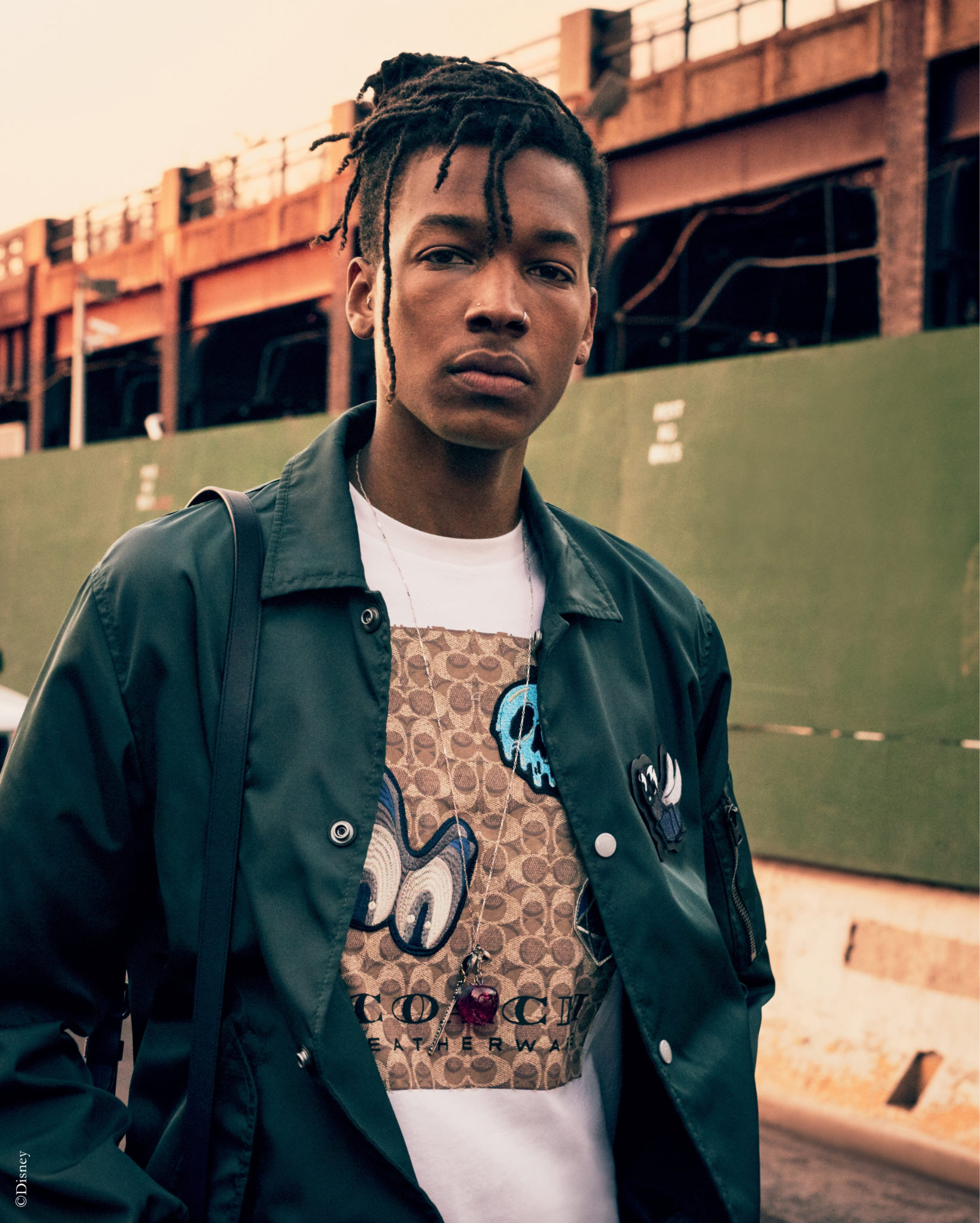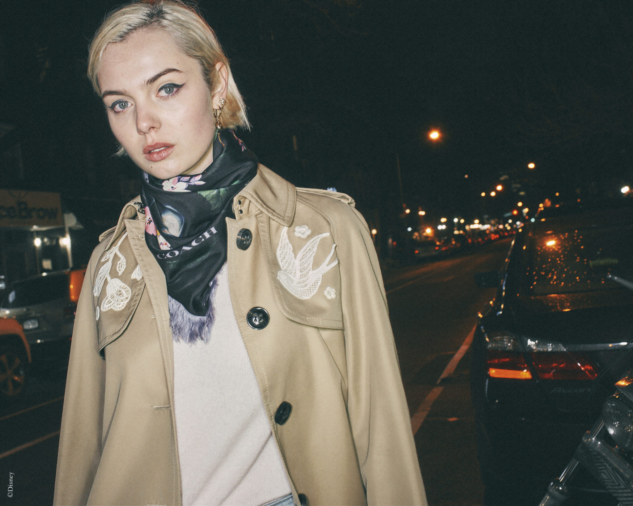 La collection recrée des motifs de Blanche Neige et les Sept Nains et de la Belle au Bois Dormant—des silhouettes inquiétantes de châteaux, des pommes empoisonnées et des créatures des bois aux yeux écarquillés—‘en mode épouvante’. Des T-shirts à police rock’n’roll et couleurs rétro sont portés avec des blousons de motard, et on aperçoit l’imprimé signature de Coach réécrit en juxtaposition avec des éléments graphiques pour un résultat résolument nouveau. On note aussi le sportswear américain de Coach : des sweats à capuche en jersey, des baskets et des sacs banane décorés d’écussons et autres détails Disney. Un écusson spécial a également été créé pour mettre à l’honneur les conteurs de Disney et les artisans de Coach.