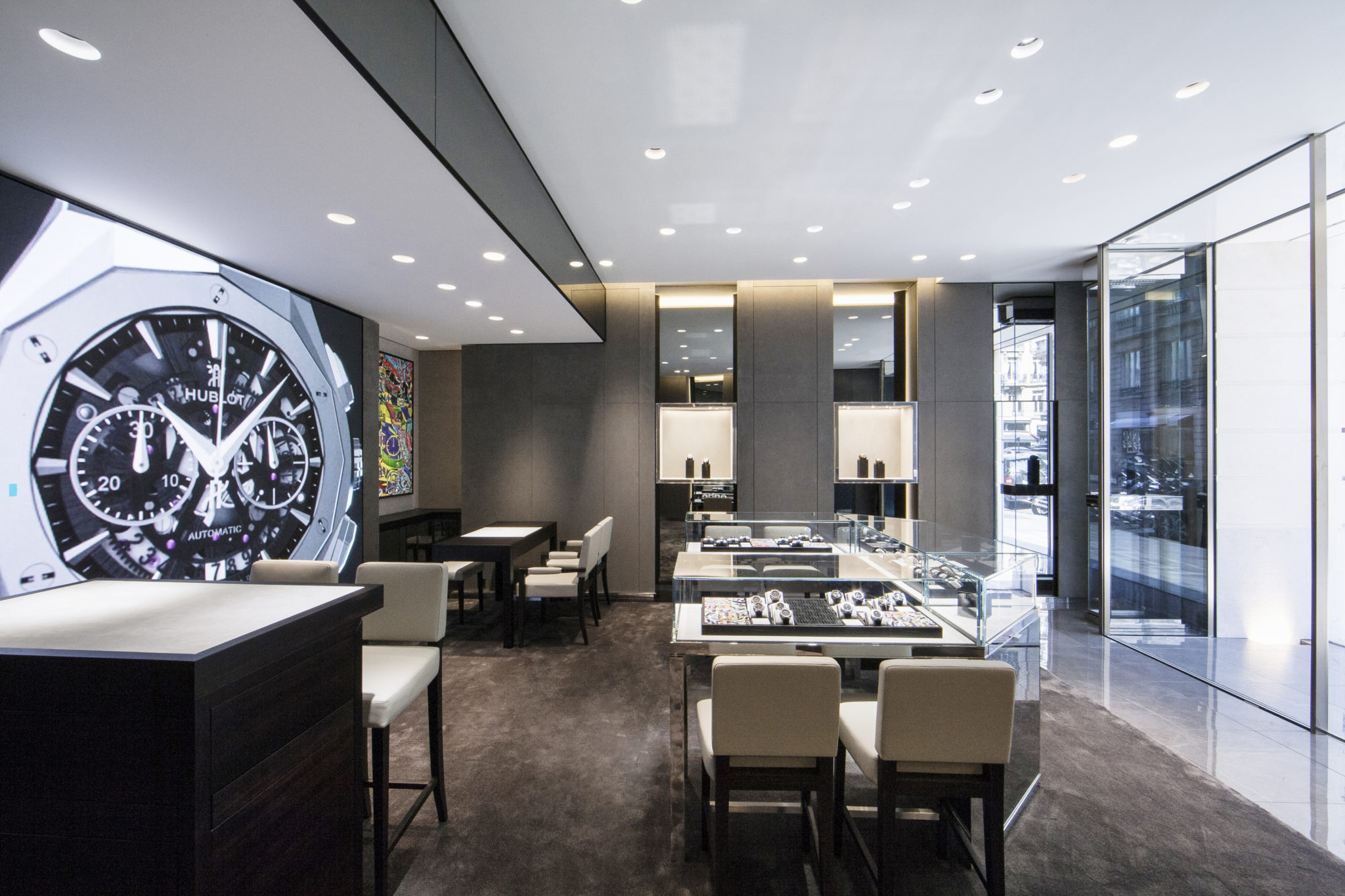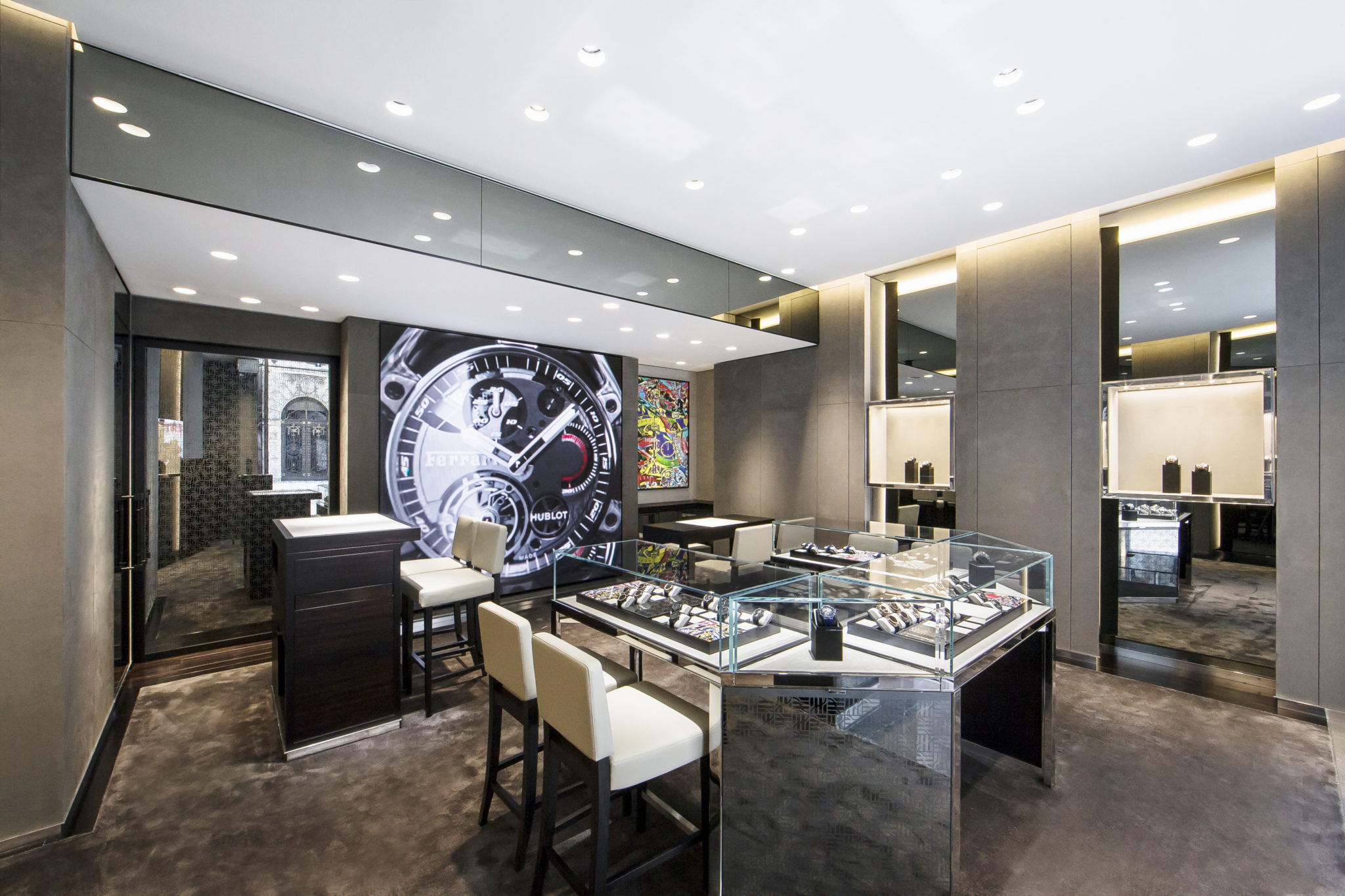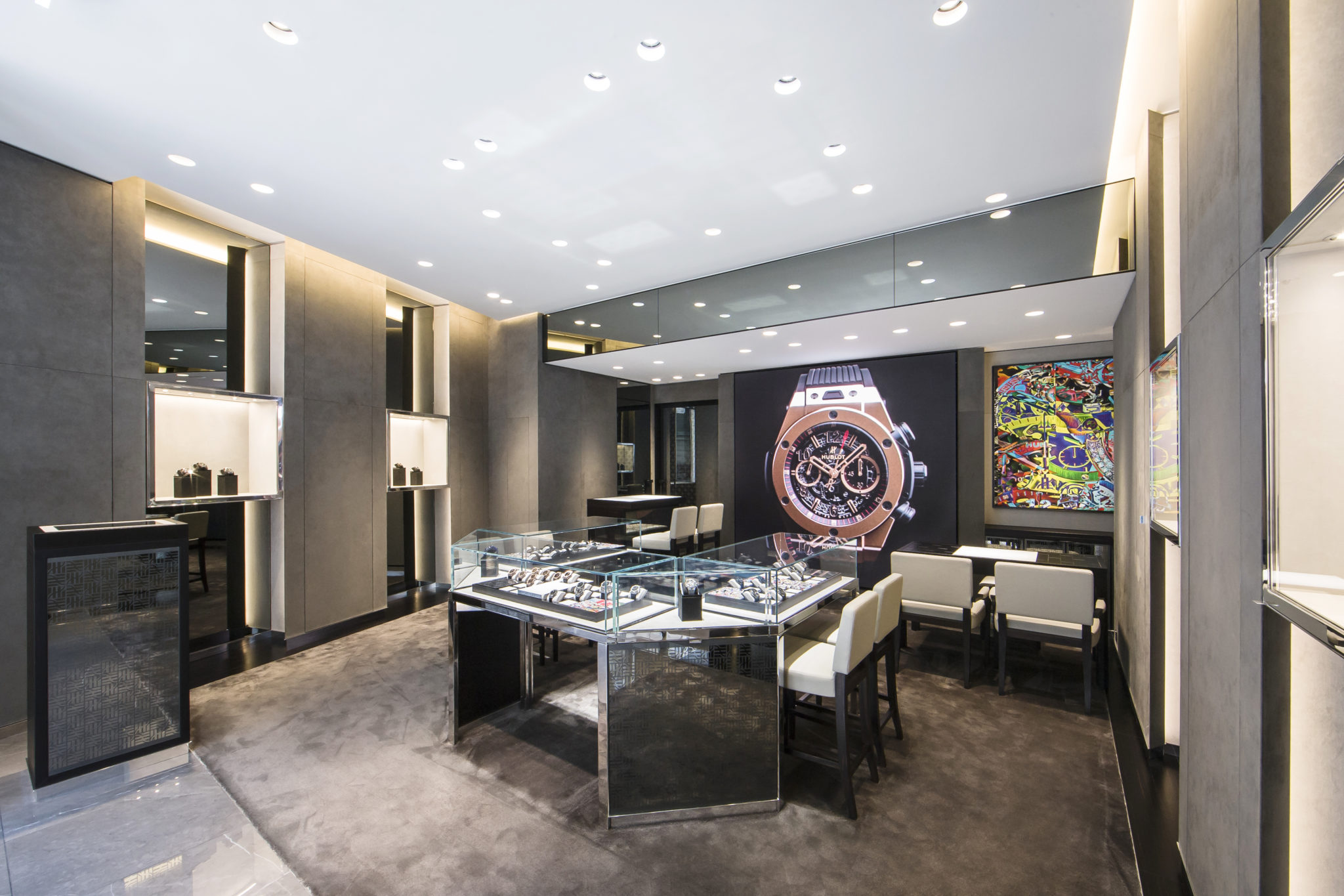 Á l’image du célèbre motto de Hublot « The Art of Fusion » ce nouvel espace d’une surface de 49m² associe luxe, modernité et innovation pour dévoiler les garde-temps de la Maison. La combinaison atypique de matériaux tels que l’alcantara gris, le verre et laiton poli offre à cette boutique une ambiance unique qui est propre à l’univers Hublot. Des touches de couleur de style Pop Art, librement inspirés des montres emblématiques de la Manufacture horlogère suisse, viennent agrémenter les vitrines de ce nouvel espace.