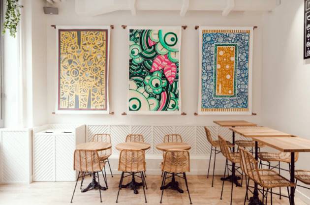 Afin de rappeler l’atmosphère des îles, ils s’associent à Modely Thibaud pour la décoration de leur restaurant aux tons clairs. Le jeune artiste peintre mauricien réalise ainsi un triptyque de kakémonos aux motifs floraux et exotiques pour illuminer la salle, tandis qu’en cuisine une frise aux motifs tribaux vient décorer les murs.