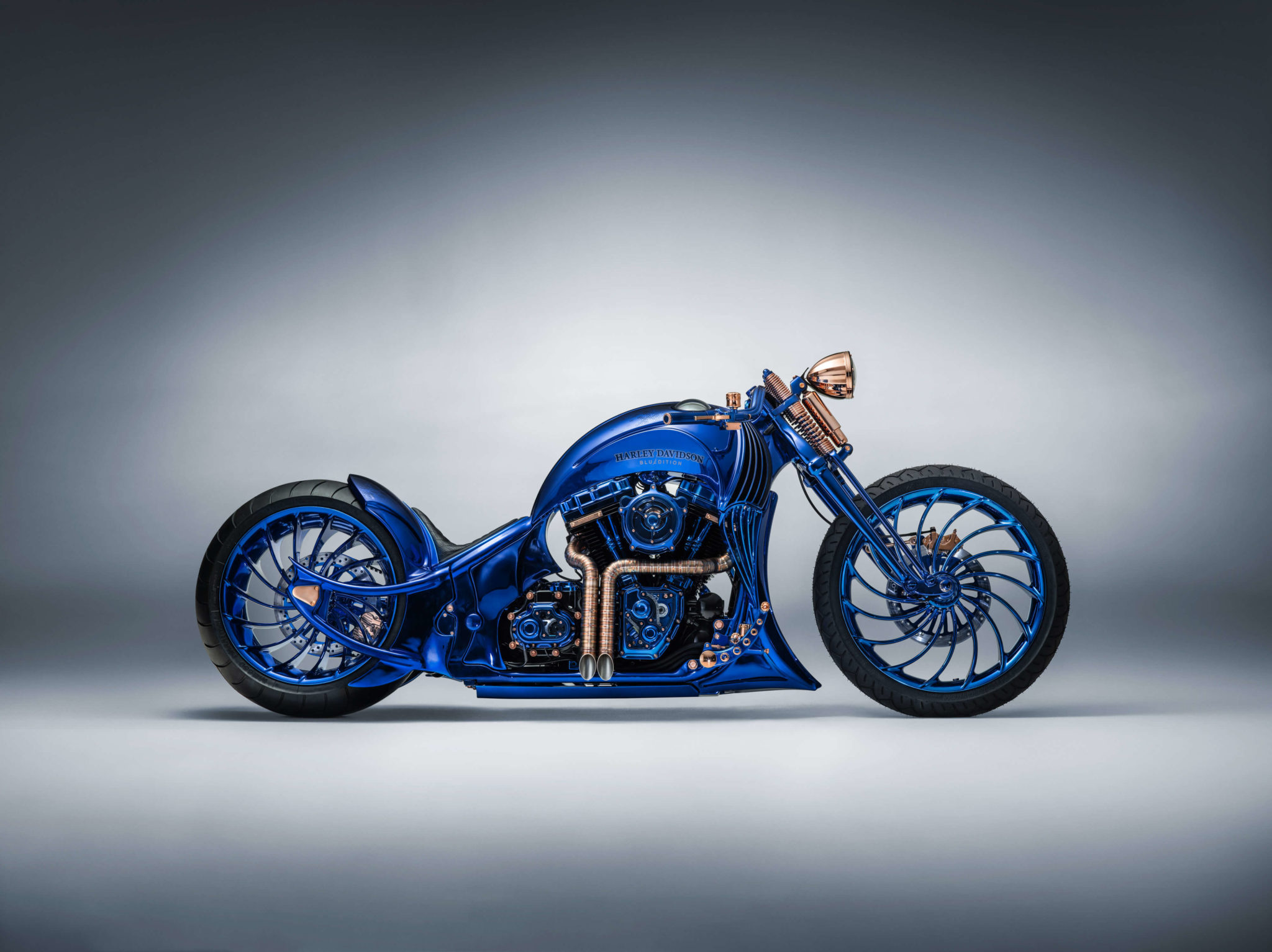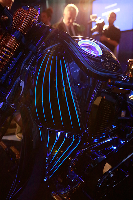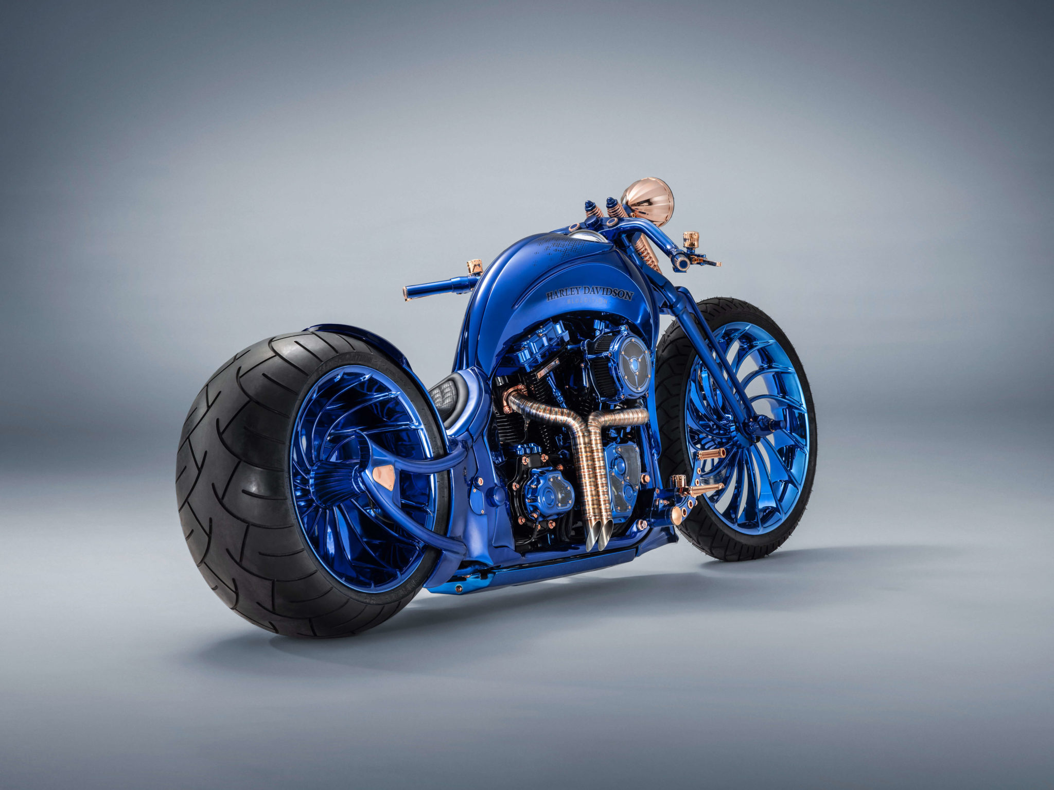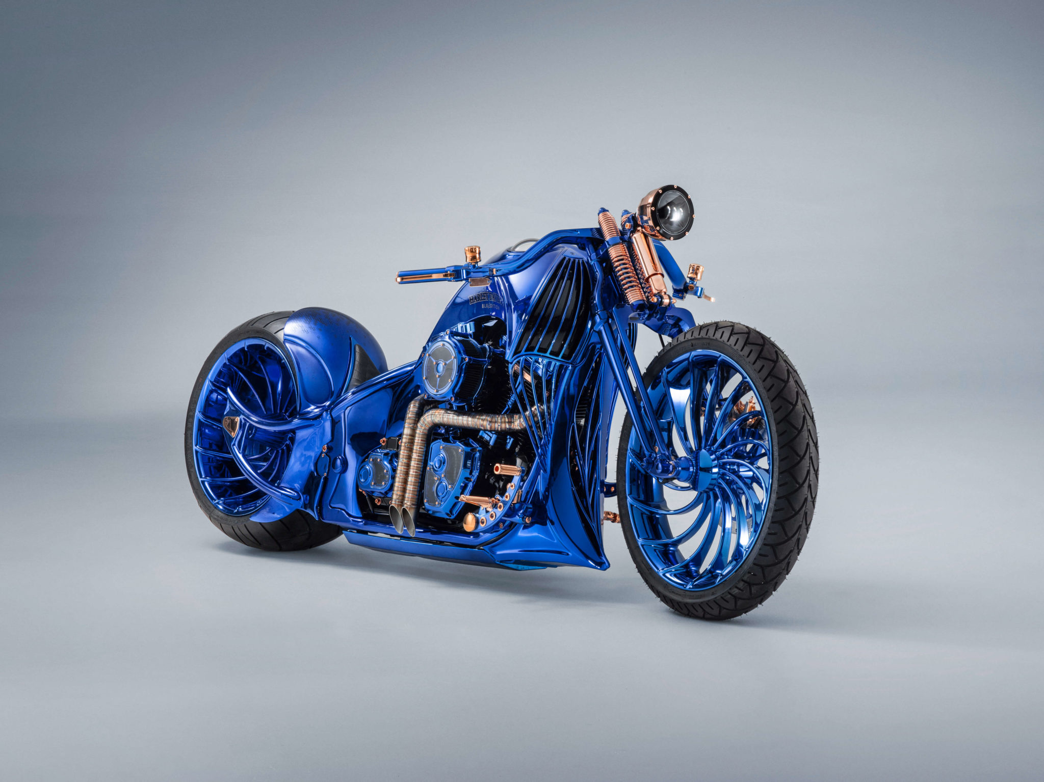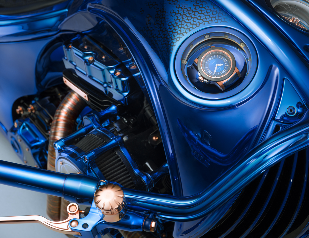 La Harley-Davidson BLUE EDITION est conçue sur la base d’une Harley Davidson Softail Slim S. Toutefois, ce modèle initial au style cool et vintage n’est plus guère reconnaissable. Chaque élément métallique a été confectionné, soudé, frappé, meulé et poli à la main spécialement pour cette pièce unique. Le cadre complet de la moto est constitué d’une seule pièce, sans la moindre soudure, et même les jantes ont été confectionnées sur mesure. Une fenêtre donnant sur le carter de l’arbre à cames permet d’observer la rotation de l’arbre à cames, la commande de vannes et le clapet d’étranglement doré. Des lampes LED à résistance thermiques éclairent ce spectacle. La Harley-Davidson BLUE EDITION est la première moto au monde à être dotée d’un moteur à éclairage interne. Diverses parties de la moto sont recouvertes d’or; quant à la selle en cuir bovin, elle a été cousue à la main en Suisse. Soulignons un détail particulier: la couleur irisée. Pour habiller la Harley-Davidson de ce bleu intense et lumineux, les artisans ont dû user d’une technologie spéciale. Après avoir argenté la moto tout entière, ils ont appliqué six couches de couleur selon un procédé de peinture secret.