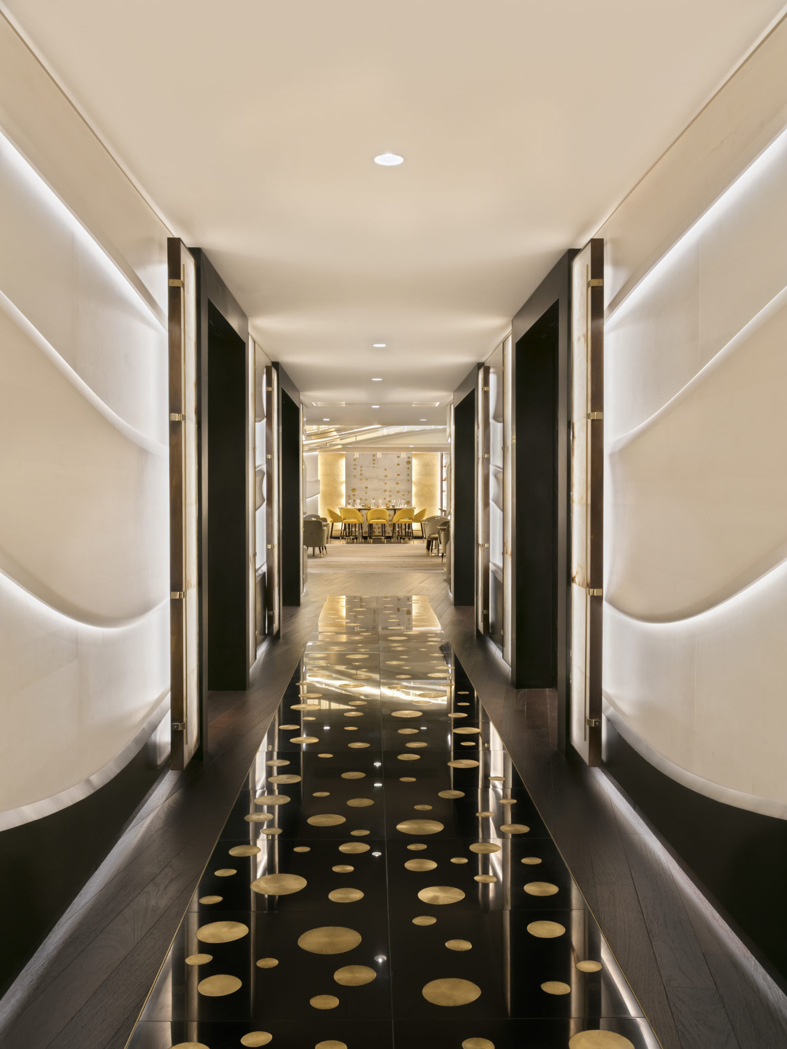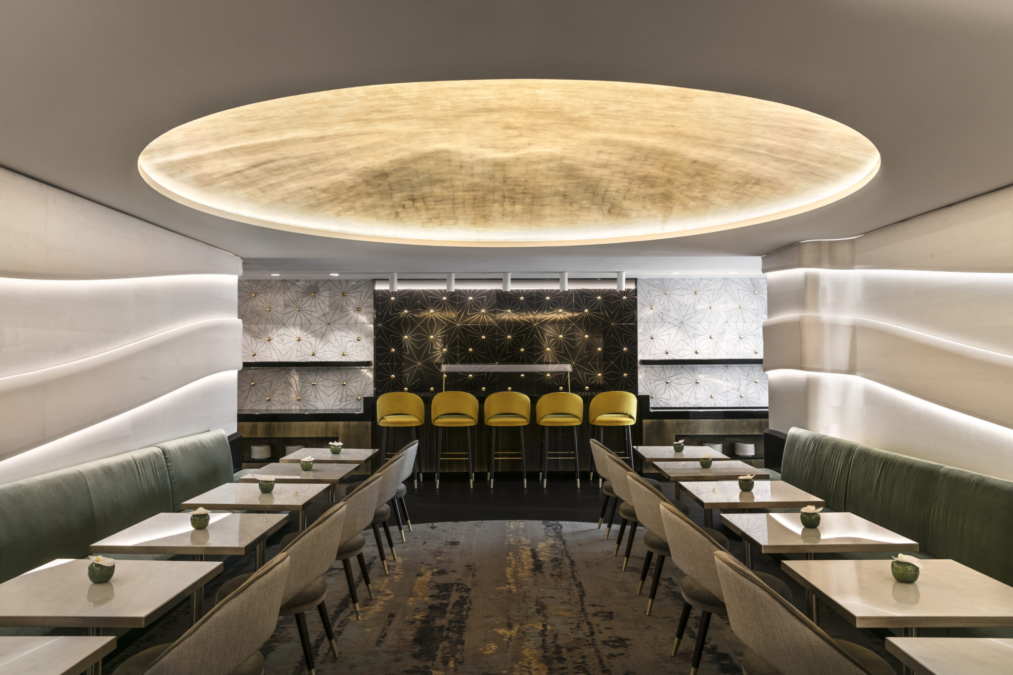 Dans cette atmosphère où l’on retrouve les notes Art Déco, les contrastes se multiplient pour donner à ce lieu une identité unique. Le marbre s’invite aux tables et le velours prend place sur les assises. Les formes géométriques se mêlent avec harmonie et les jeu de lumière se succèdent comme sur une partition. Les yeux se