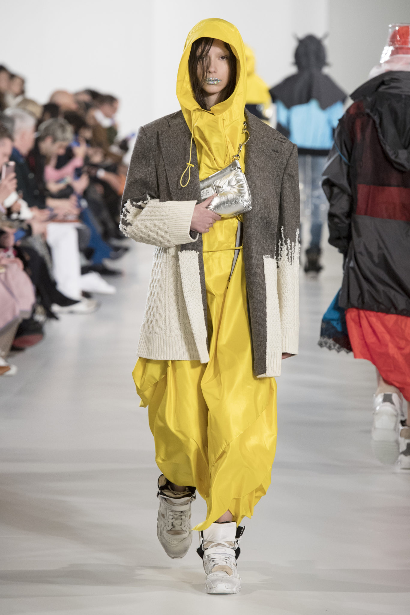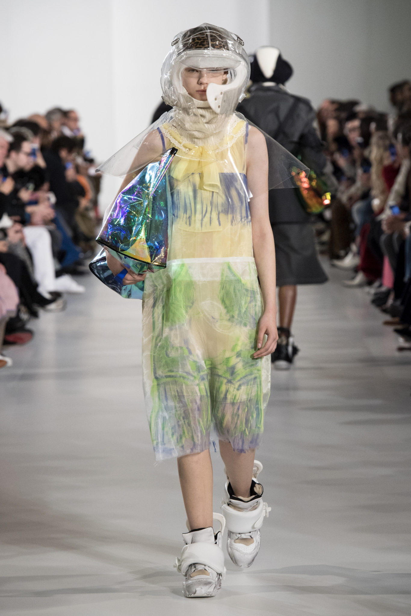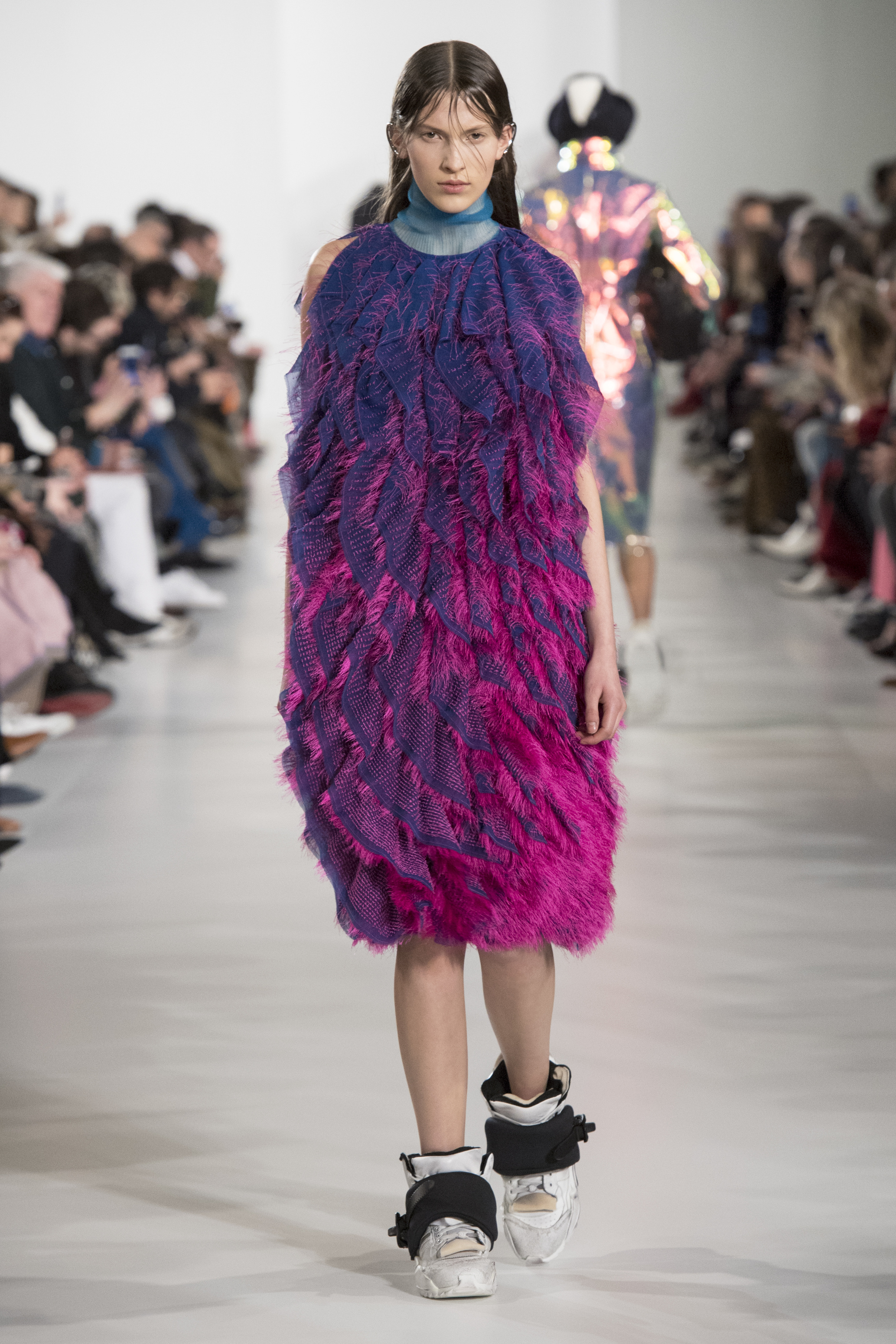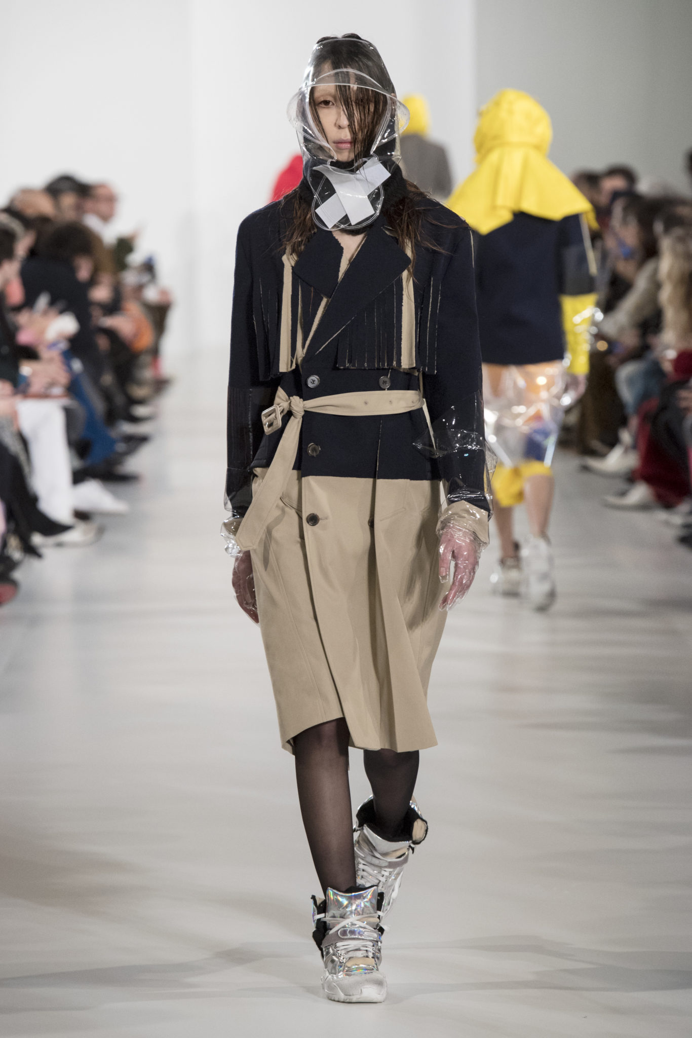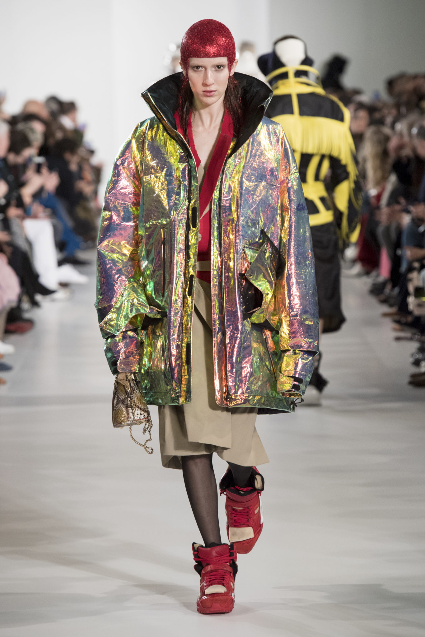 S’habiller à l’envers est une idée aussi subversive qu’un glamour décontracté : un trench-coat porté négligemment sous une robe, un pull jeté sur un blazer, ou l’aperçu d’un tricot de pêcheur sous une jupe transparente. Pour l’automne-hiver 2018, le directeur artistique John Galliano se penche sur la garde-robe inversée mise en place à la Maison Margiela. Les silhouettes de la Haute Couture sont précisées par des vêtements réalisés dans des volumes sculptés magnifiés. Les vêtements d’extérieur se transforment en robes lorsqu’ils sont mis à la hâte. C’est un manteau de nylon porté sous une veste en cuir décortiqué ou une salopette déconstruite posée sur un trench-coat. Séduire l’œil, les matériaux illusoires créent des souvenirs du familier. Un manteau d’hologramme transparent enveloppant des couches multicolores de franges de viscose, de tulle et d’organza évoque les codes du rodéo. Une veste décortiquée gris melange est incrustée du souvenir d’un tricot d’Aran moulé en caoutchouc. La fusion de garde-robes authentiques approprient l’inapproprié. Elles sont illustrées dans l’association d’un blazer à chevrons avec un tricot de pêcheur, ou dans une jupe en relief avec le souvenir d’une jupe de rodéo. Dans un jeu entre les couches, la transparence et la réflexion, les vêtements deviennent transformateurs et génèrent un sentiment de glamour inconscient.