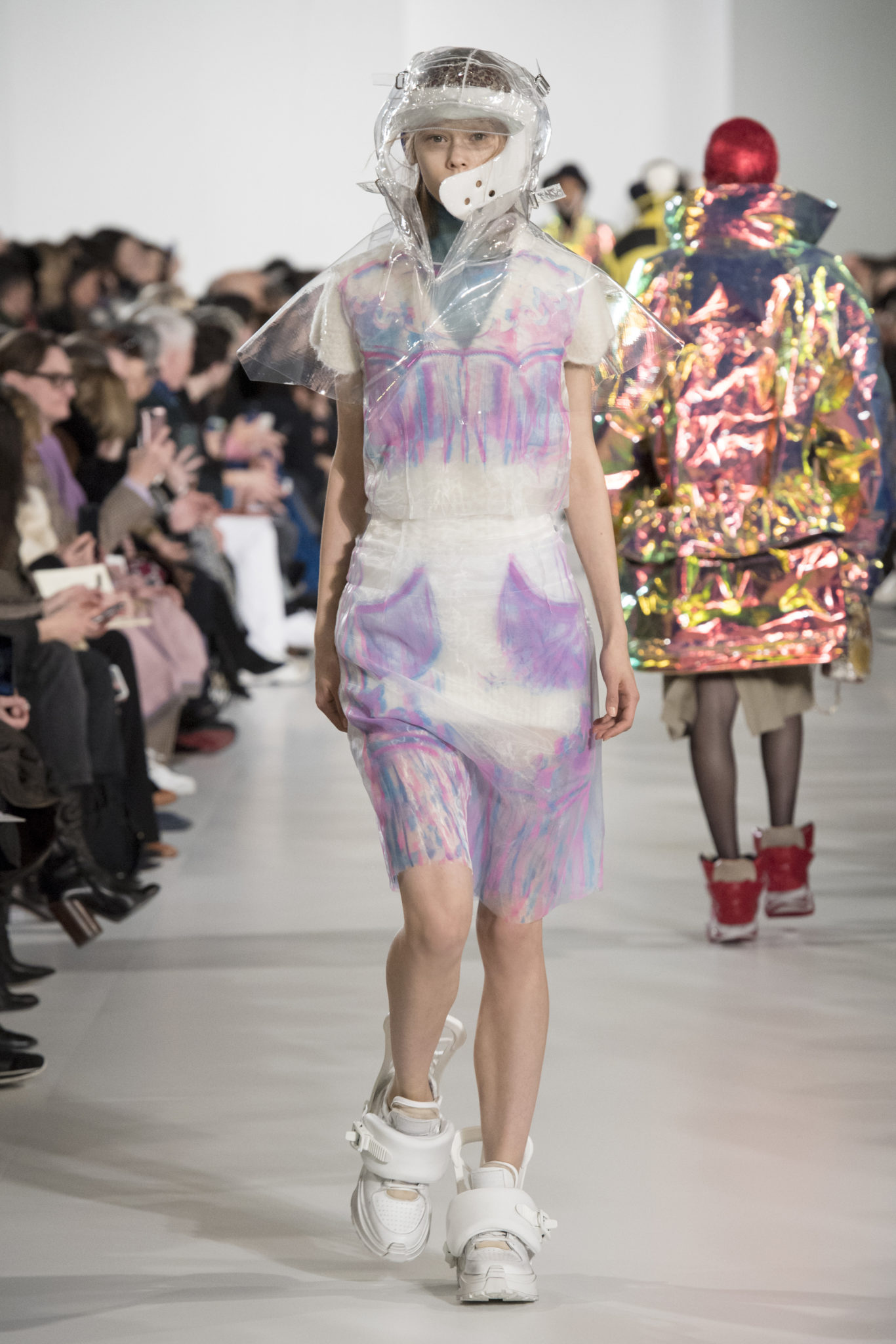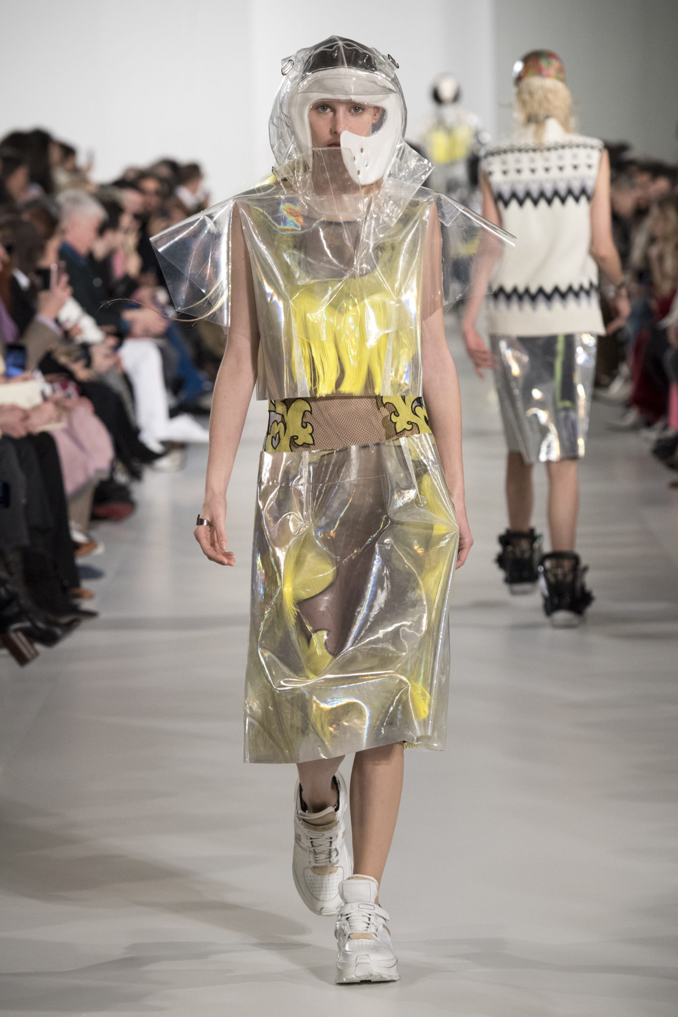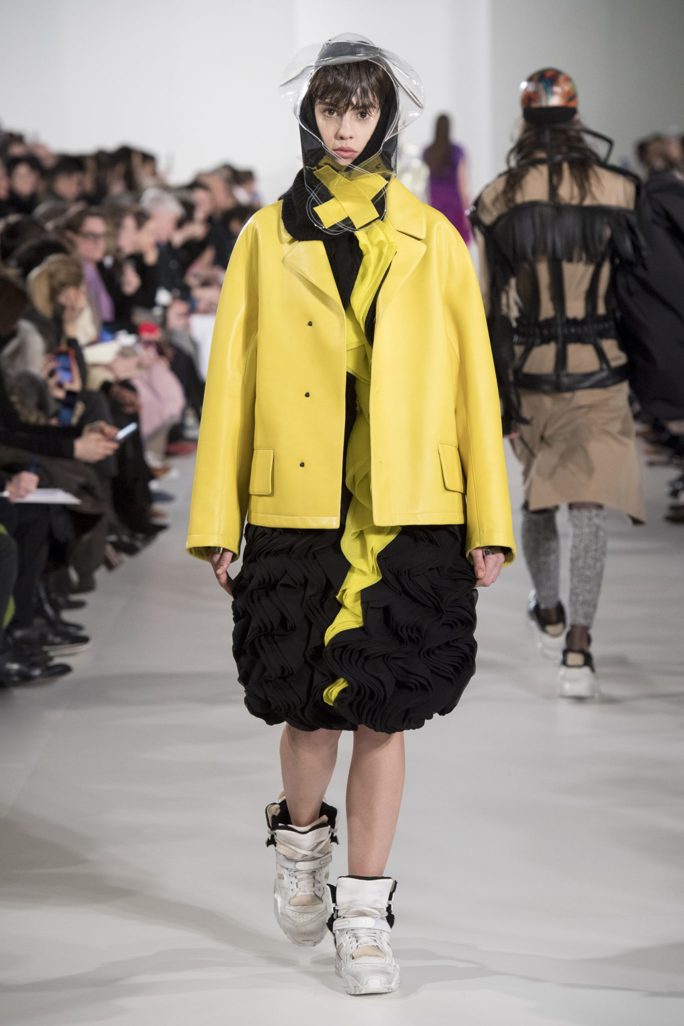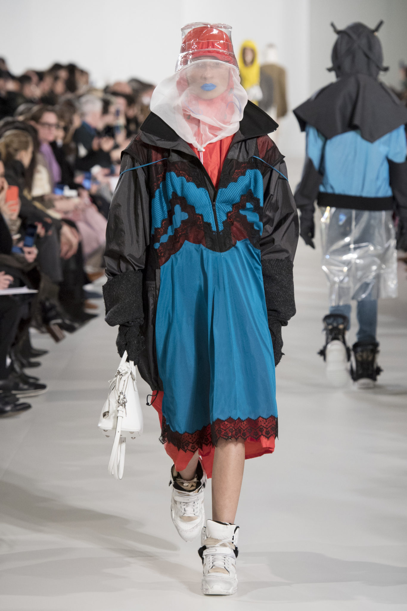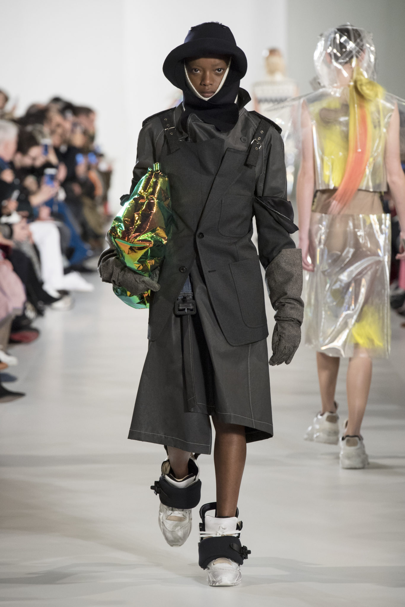 S’habiller à l’envers est une idée aussi subversive qu’un glamour décontracté : un trench-coat porté négligemment sous une robe, un pull jeté sur un blazer, ou l’aperçu d’un tricot de pêcheur sous une jupe transparente. Pour l’automne-hiver 2018, le directeur artistique John Galliano se penche sur la garde-robe inversée mise en place à la Maison Margiela. Les silhouettes de la Haute Couture sont précisées par des vêtements réalisés dans des volumes sculptés magnifiés. Les vêtements d’extérieur se transforment en robes lorsqu’ils sont mis à la hâte. C’est un manteau de nylon porté sous une veste en cuir décortiqué ou une salopette déconstruite posée sur un trench-coat. Séduire l’œil, les matériaux illusoires créent des souvenirs du familier. Un manteau d’hologramme transparent enveloppant des couches multicolores de franges de viscose, de tulle et d’organza évoque les codes du rodéo. Une veste décortiquée gris melange est incrustée du souvenir d’un tricot d’Aran moulé en caoutchouc. La fusion de garde-robes authentiques approprient l’inapproprié. Elles sont illustrées dans l’association d’un blazer à chevrons avec un tricot de pêcheur, ou dans une jupe en relief avec le souvenir d’une jupe de rodéo. Dans un jeu entre les couches, la transparence et la réflexion, les vêtements deviennent transformateurs et génèrent un sentiment de glamour inconscient.