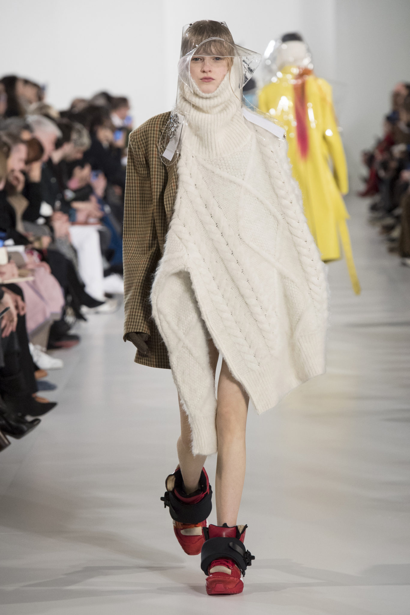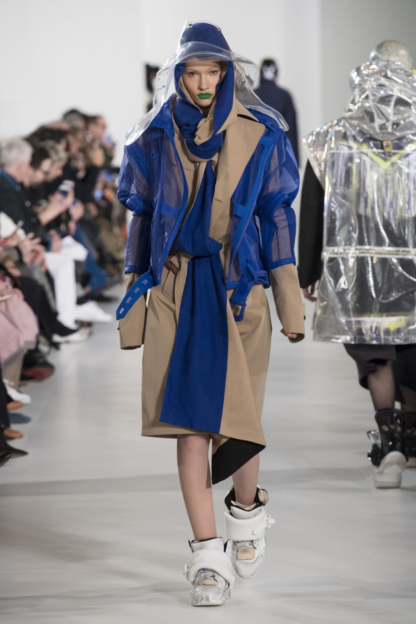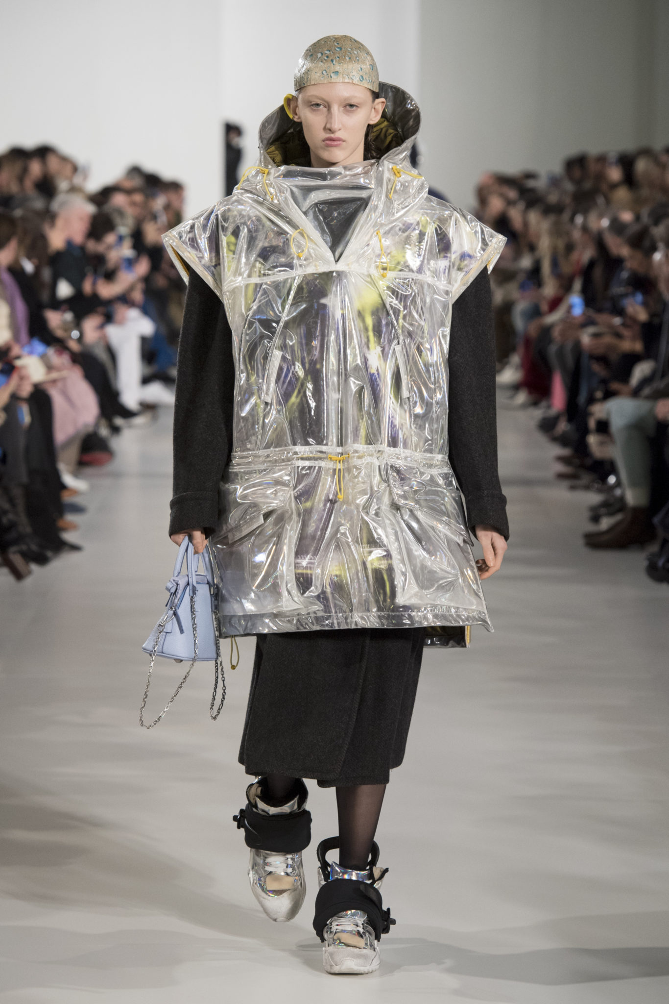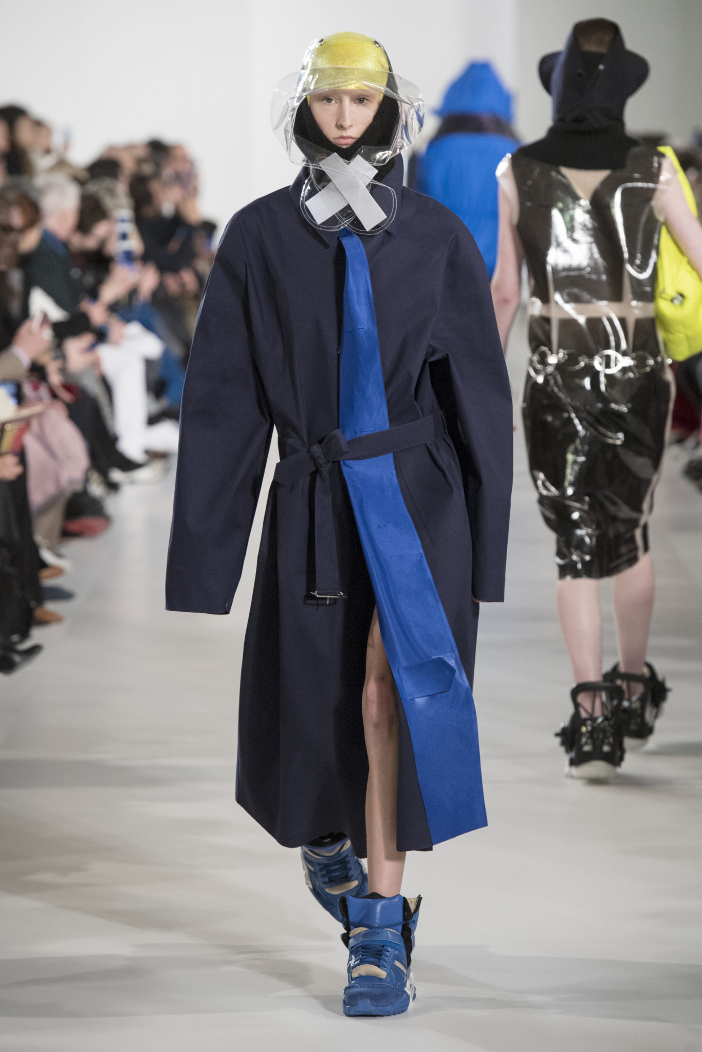 S’habiller à l’envers est une idée aussi subversive qu’un glamour décontracté : un trench-coat porté négligemment sous une robe, un pull jeté sur un blazer, ou l’aperçu d’un tricot de pêcheur sous une jupe transparente. Pour l’automne-hiver 2018, le directeur artistique John Galliano se penche sur la garde-robe inversée mise en place à la Maison Margiela. Les silhouettes de la Haute Couture sont précisées par des vêtements réalisés dans des volumes sculptés magnifiés. Les vêtements d’extérieur se transforment en robes lorsqu’ils sont mis à la hâte. C’est un manteau de nylon porté sous une veste en cuir décortiqué ou une salopette déconstruite posée sur un trench-coat. Séduire l’œil, les matériaux illusoires créent des souvenirs du familier. Un manteau d’hologramme transparent enveloppant des couches multicolores de franges de viscose, de tulle et d’organza évoque les codes du rodéo. Une veste décortiquée gris melange est incrustée du souvenir d’un tricot d’Aran moulé en caoutchouc. La fusion de garde-robes authentiques approprient l’inapproprié. Elles sont illustrées dans l’association d’un blazer à chevrons avec un tricot de pêcheur, ou dans une jupe en relief avec le souvenir d’une jupe de rodéo. Dans un jeu entre les couches, la transparence et la réflexion, les vêtements deviennent transformateurs et génèrent un sentiment de glamour inconscient.
