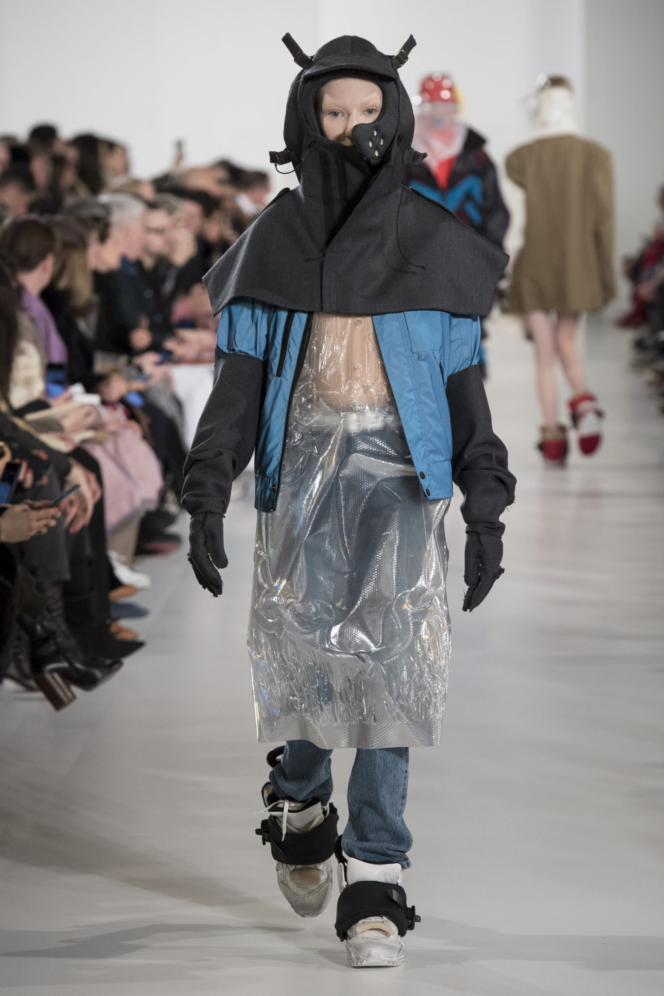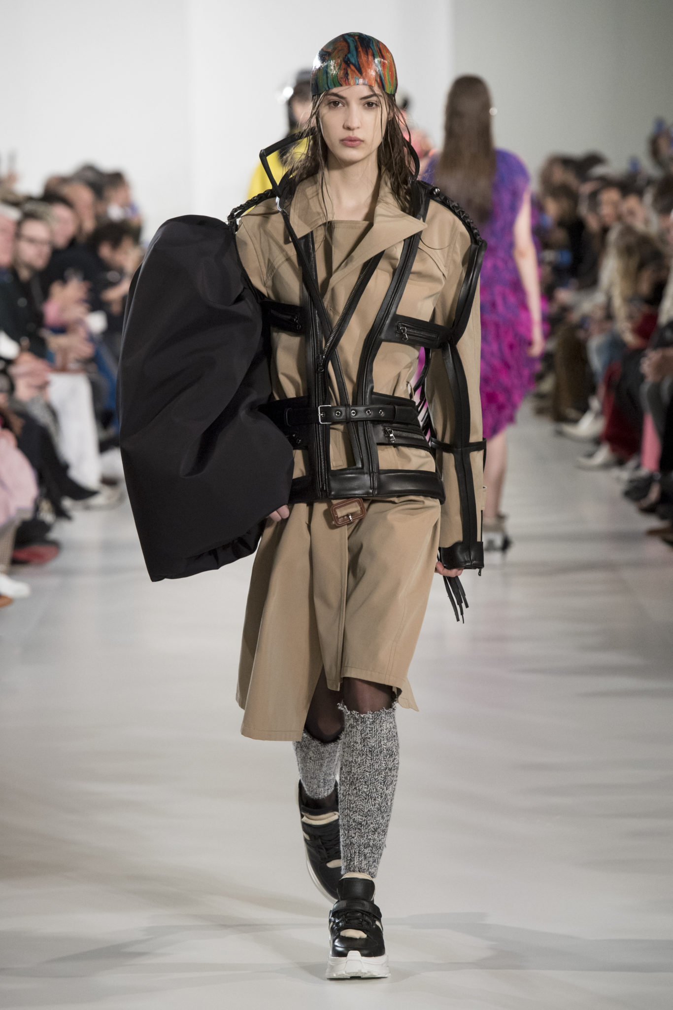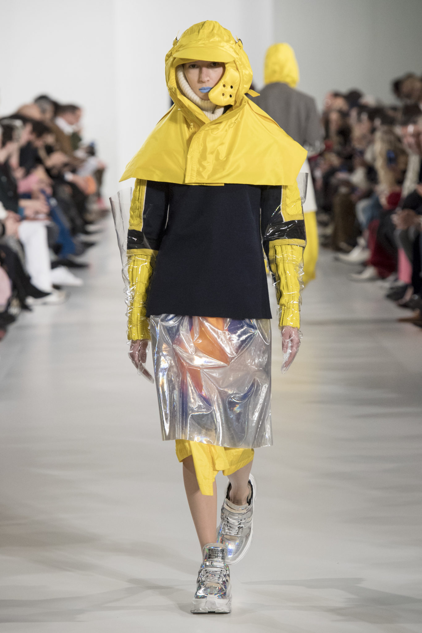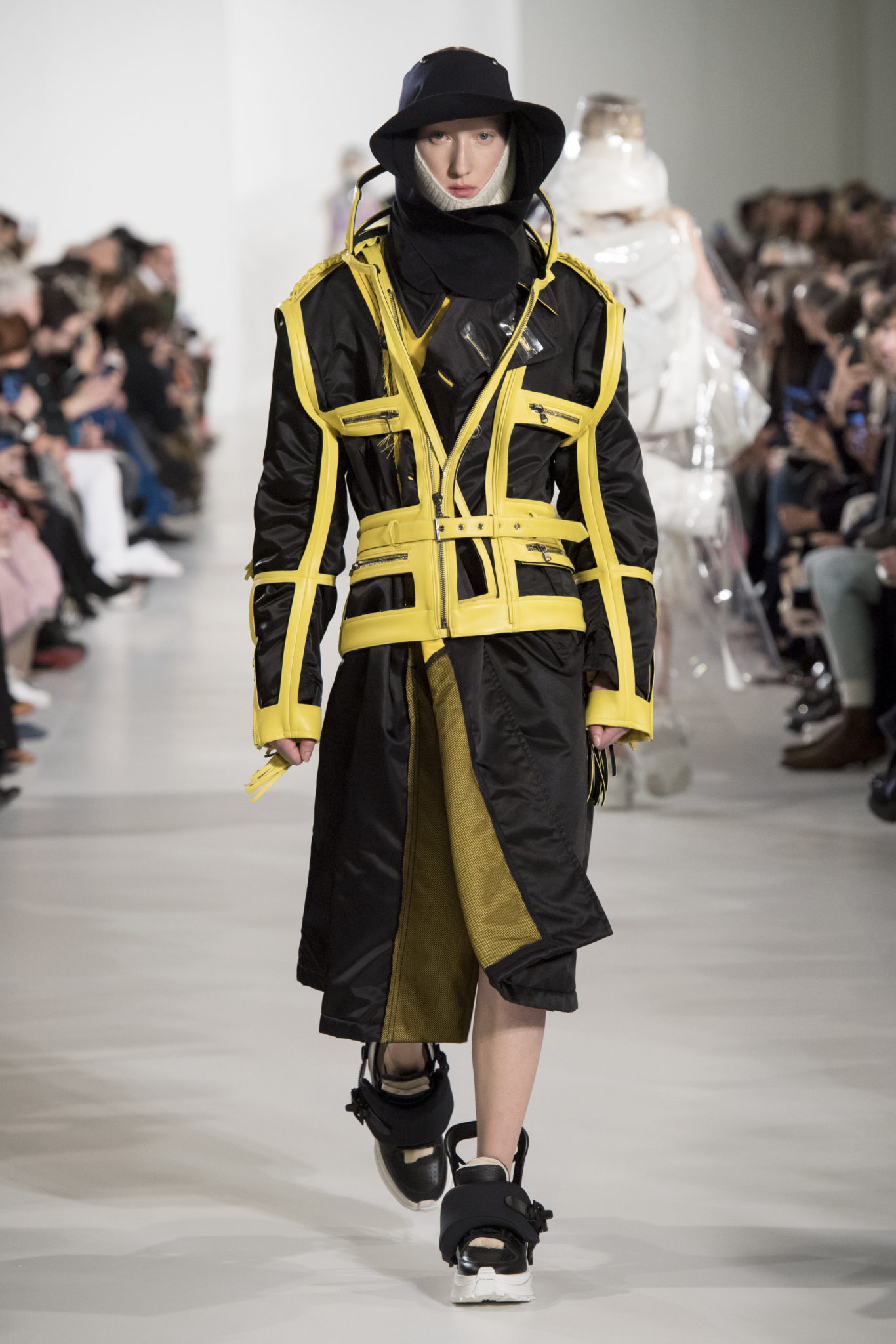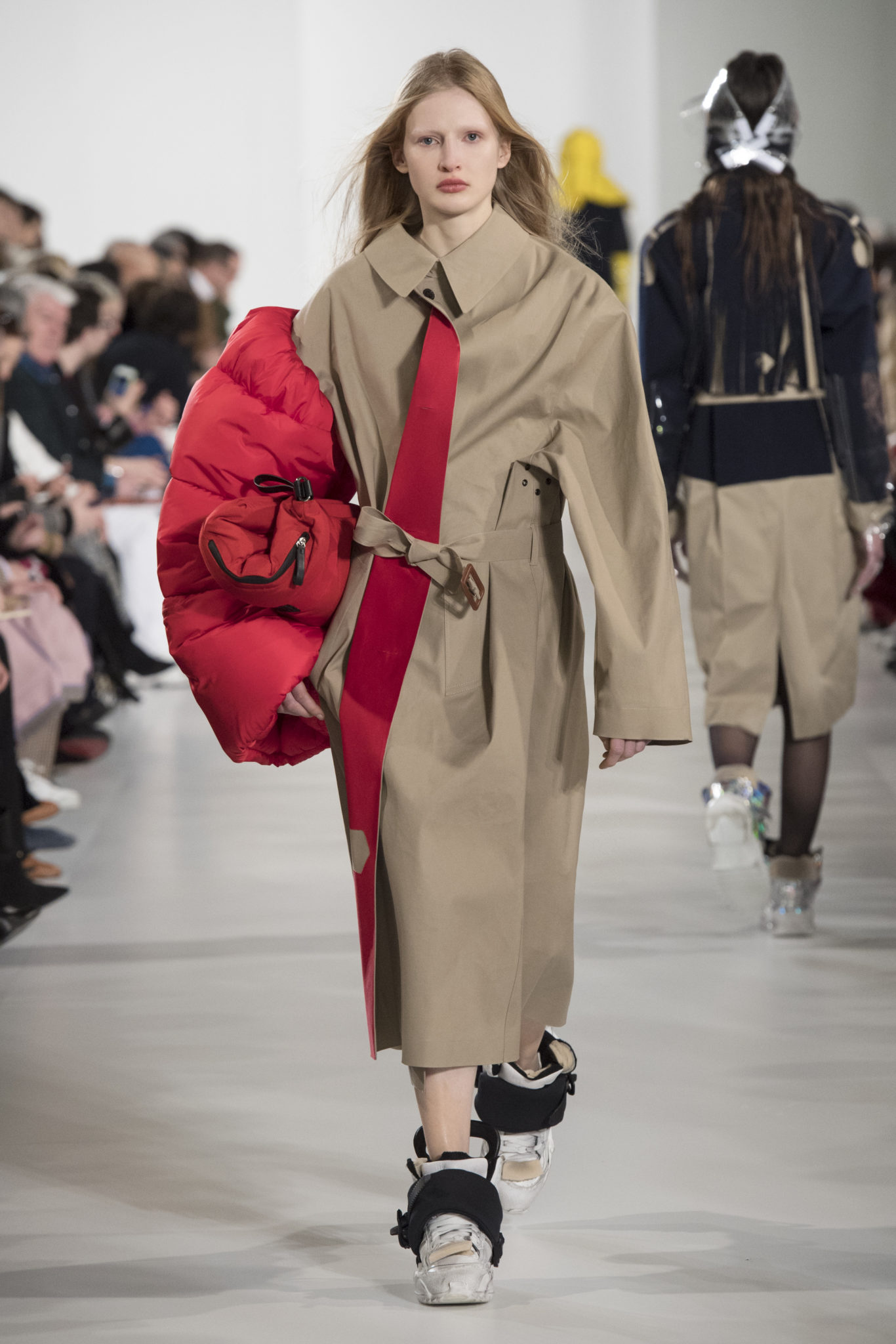 S’habiller à l’envers est une idée aussi subversive qu’un glamour décontracté : un trench-coat porté négligemment sous une robe, un pull jeté sur un blazer, ou l’aperçu d’un tricot de pêcheur sous une jupe transparente. Pour l’automne-hiver 2018, le directeur artistique John Galliano se penche sur la garde-robe inversée mise en place à la Maison Margiela. Les silhouettes de la Haute Couture sont précisées par des vêtements réalisés dans des volumes sculptés magnifiés. Les vêtements d’extérieur se transforment en robes lorsqu’ils sont mis à la hâte. C’est un manteau de nylon porté sous une veste en cuir décortiqué ou une salopette déconstruite posée sur un trench-coat. Séduire l’œil, les matériaux illusoires créent des souvenirs du familier. Un manteau d’hologramme transparent enveloppant des couches multicolores de franges de viscose, de tulle et d’organza évoque les codes du rodéo. Une veste décortiquée gris melange est incrustée du souvenir d’un tricot d’Aran moulé en caoutchouc. La fusion de garde-robes authentiques approprient l’inapproprié. Elles sont illustrées dans l’association d’un blazer à chevrons avec un tricot de pêcheur, ou dans une jupe en relief avec le souvenir d’une jupe de rodéo. Dans un jeu entre les couches, la transparence et la réflexion, les vêtements deviennent transformateurs et génèrent un sentiment de glamour inconscient.