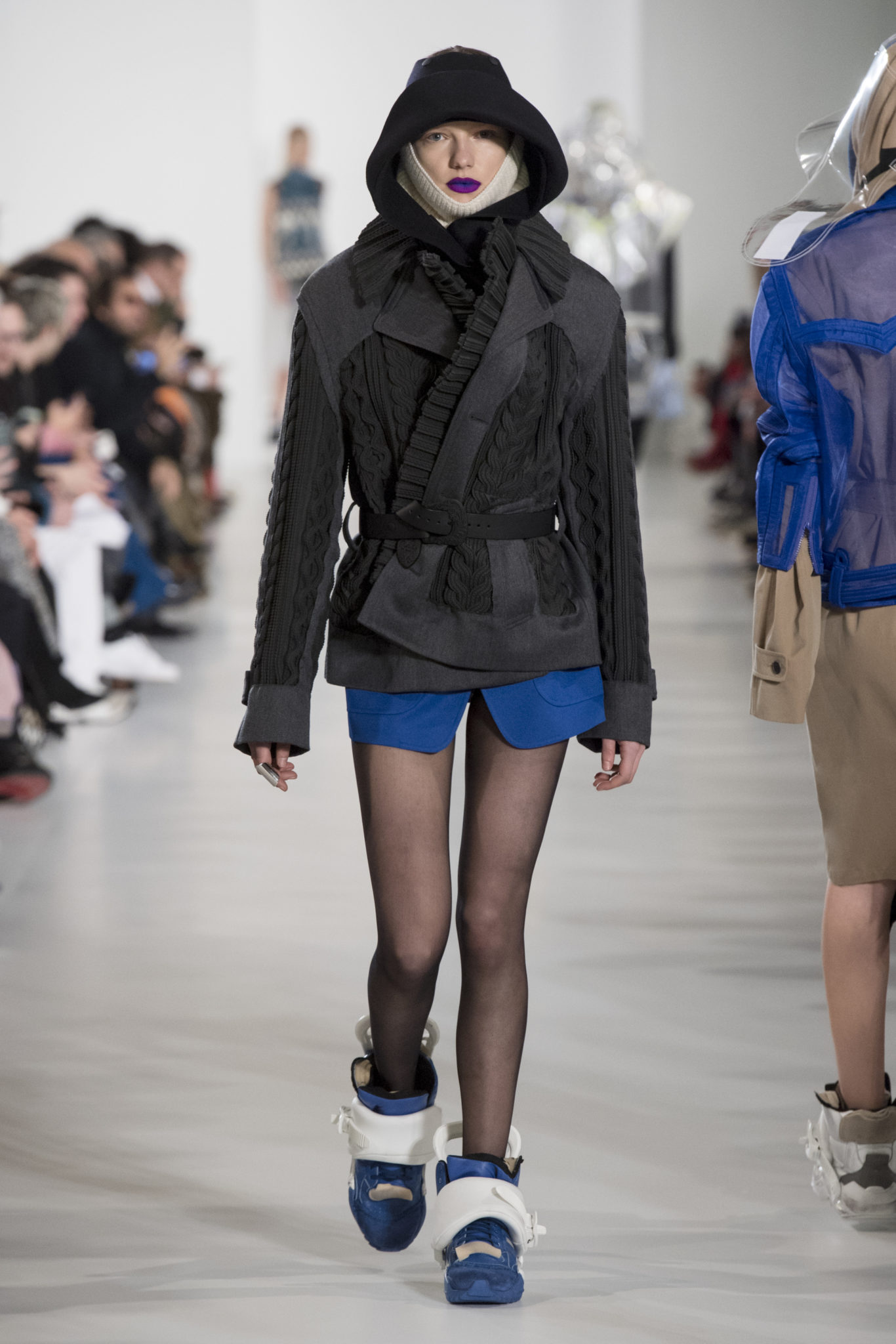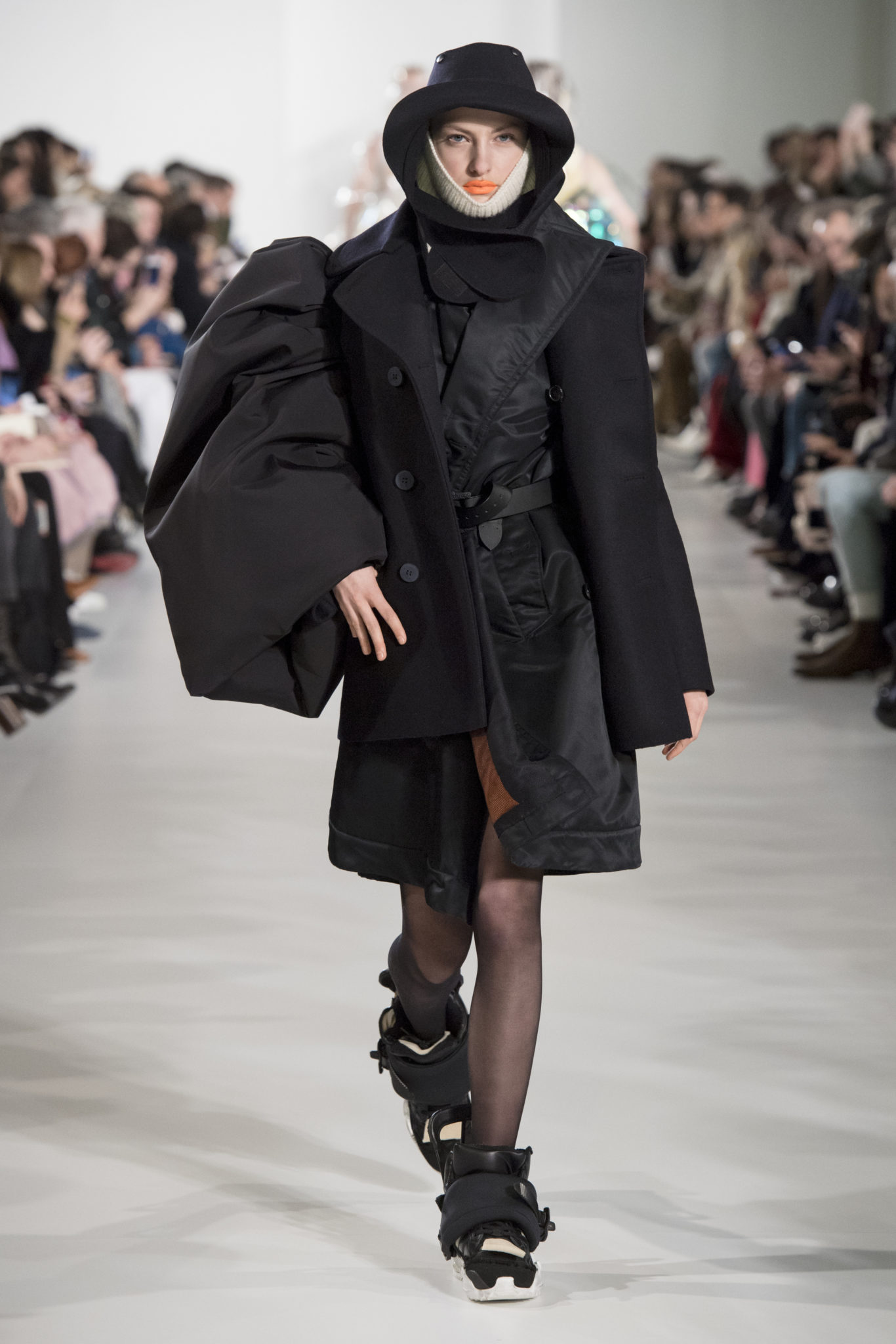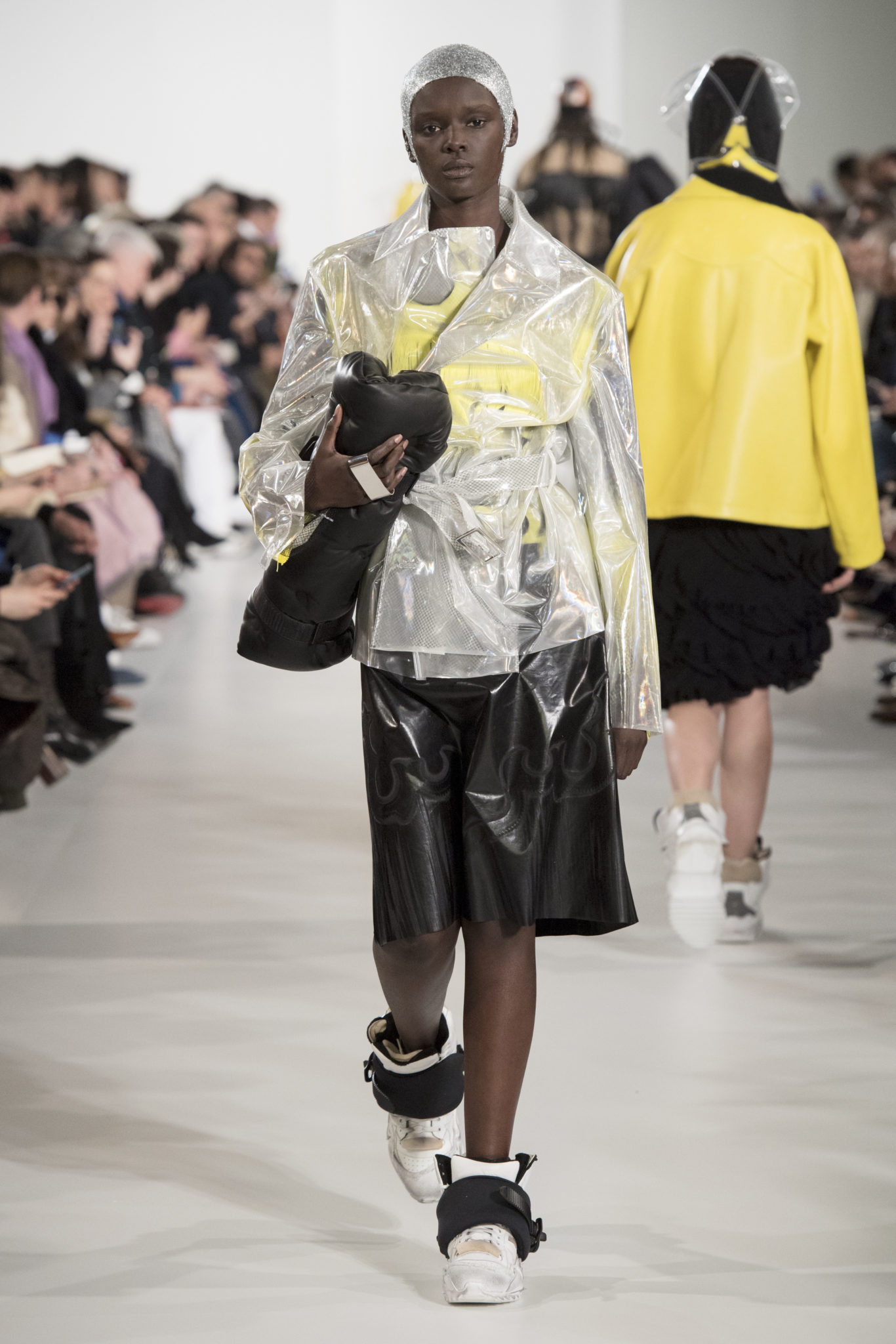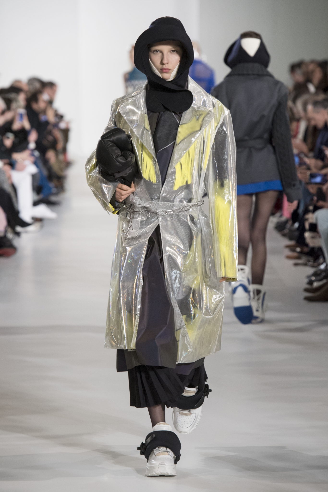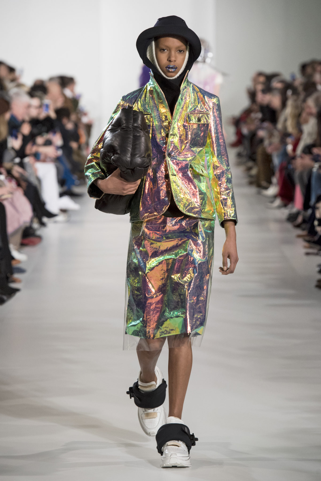 S’habiller à l’envers est une idée aussi subversive qu’un glamour décontracté : un trench-coat porté négligemment sous une robe, un pull jeté sur un blazer, ou l’aperçu d’un tricot de pêcheur sous une jupe transparente. Pour l’automne-hiver 2018, le directeur artistique John Galliano se penche sur la garde-robe inversée mise en place à la Maison Margiela. Les silhouettes de la Haute Couture sont précisées par des vêtements réalisés dans des volumes sculptés magnifiés. Les vêtements d’extérieur se transforment en robes lorsqu’ils sont mis à la hâte. C’est un manteau de nylon porté sous une veste en cuir décortiqué ou une salopette déconstruite posée sur un trench-coat. Séduire l’œil, les matériaux illusoires créent des souvenirs du familier. Un manteau d’hologramme transparent enveloppant des couches multicolores de franges de viscose, de tulle et d’organza évoque les codes du rodéo. Une veste décortiquée gris melange est incrustée du souvenir d’un tricot d’Aran moulé en caoutchouc. La fusion de garde-robes authentiques approprient l’inapproprié. Elles sont illustrées dans l’association d’un blazer à chevrons avec un tricot de pêcheur, ou dans une jupe en relief avec le souvenir d’une jupe de rodéo. Dans un jeu entre les couches, la transparence et la réflexion, les vêtements deviennent transformateurs et génèrent un sentiment de glamour inconscient.