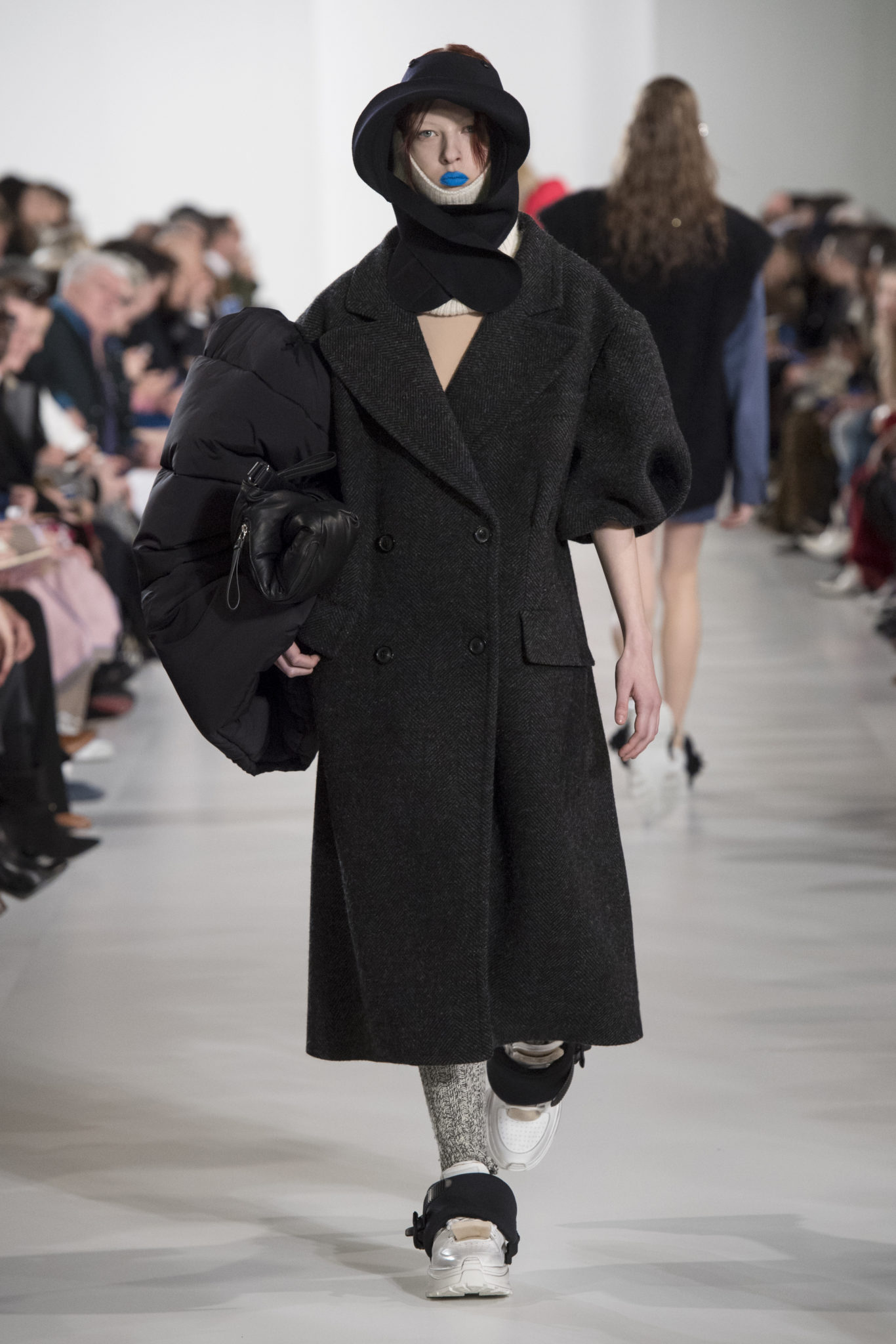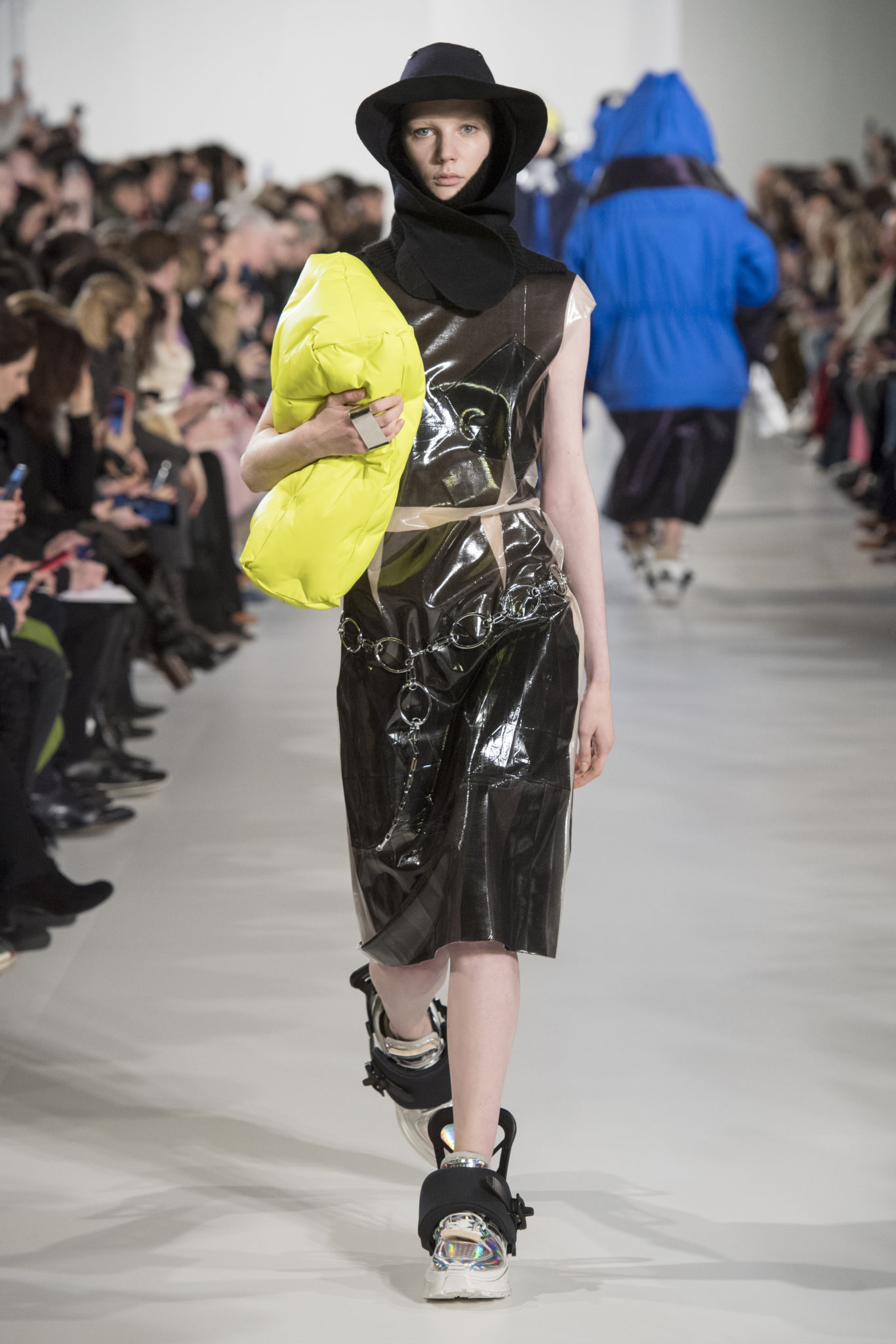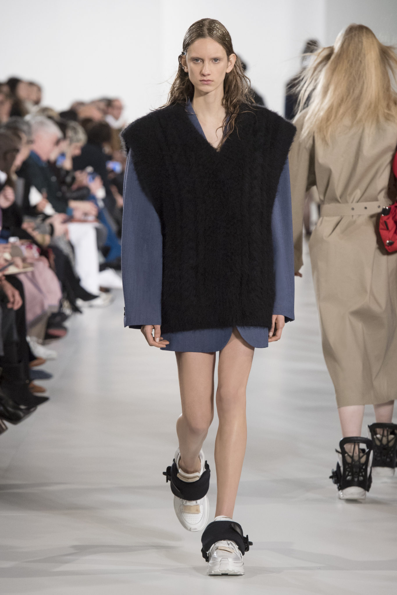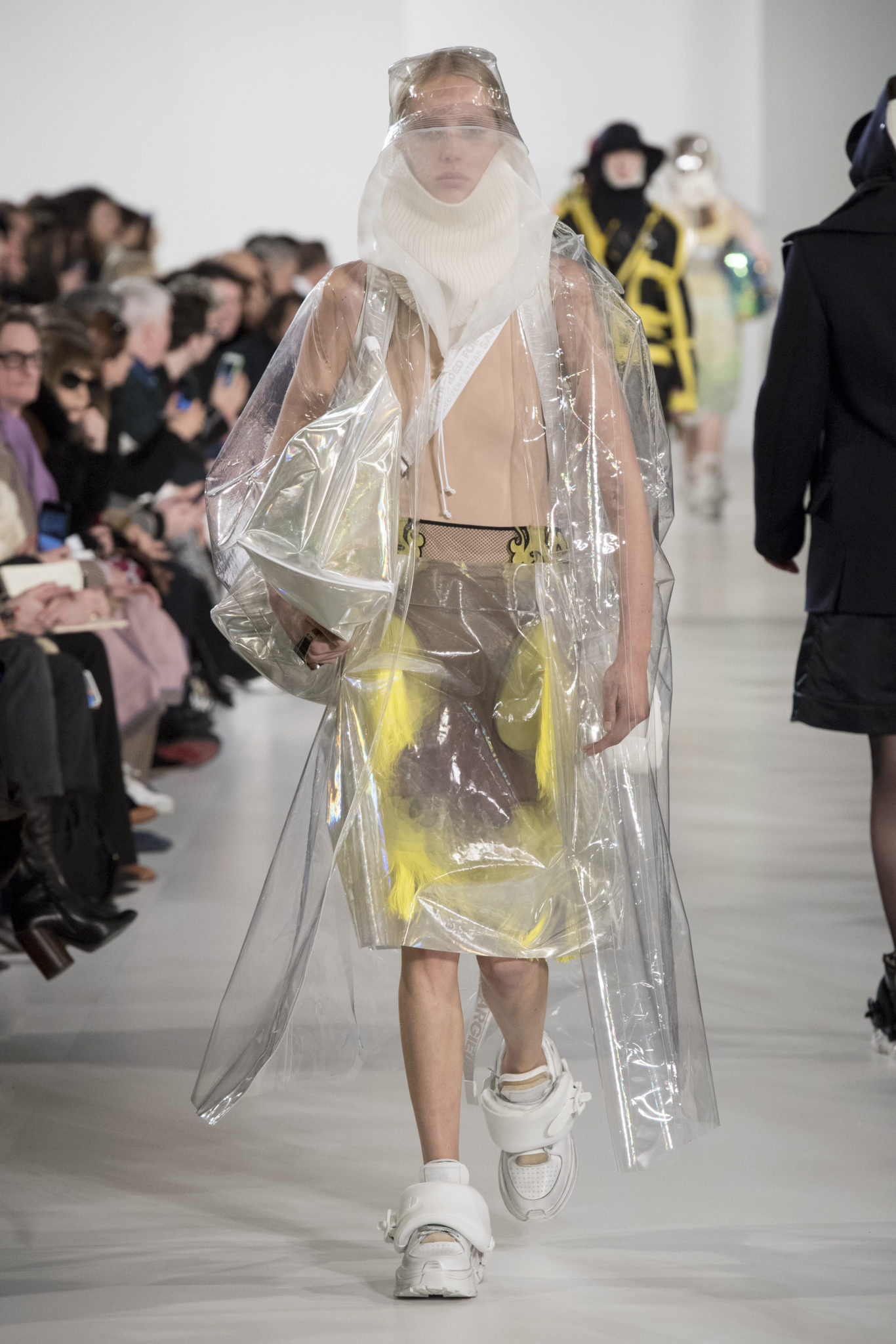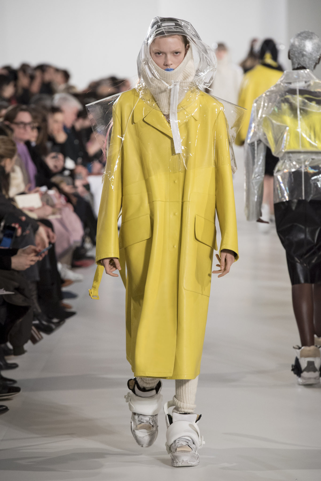 S’habiller à l’envers est une idée aussi subversive qu’un glamour décontracté : un trench-coat porté négligemment sous une robe, un pull jeté sur un blazer, ou l’aperçu d’un tricot de pêcheur sous une jupe transparente. Pour l’automne-hiver 2018, le directeur artistique John Galliano se penche sur la garde-robe inversée mise en place à la Maison Margiela. Les silhouettes de la Haute Couture sont précisées par des vêtements réalisés dans des volumes sculptés magnifiés. Les vêtements d’extérieur se transforment en robes lorsqu’ils sont mis à la hâte. C’est un manteau de nylon porté sous une veste en cuir décortiqué ou une salopette déconstruite posée sur un trench-coat. Séduire l’œil, les matériaux illusoires créent des souvenirs du familier. Un manteau d’hologramme transparent enveloppant des couches multicolores de franges de viscose, de tulle et d’organza évoque les codes du rodéo. Une veste décortiquée gris melange est incrustée du souvenir d’un tricot d’Aran moulé en caoutchouc. La fusion de garde-robes authentiques approprient l’inapproprié. Elles sont illustrées dans l’association d’un blazer à chevrons avec un tricot de pêcheur, ou dans une jupe en relief avec le souvenir d’une jupe de rodéo. Dans un jeu entre les couches, la transparence et la réflexion, les vêtements deviennent transformateurs et génèrent un sentiment de glamour inconscient.