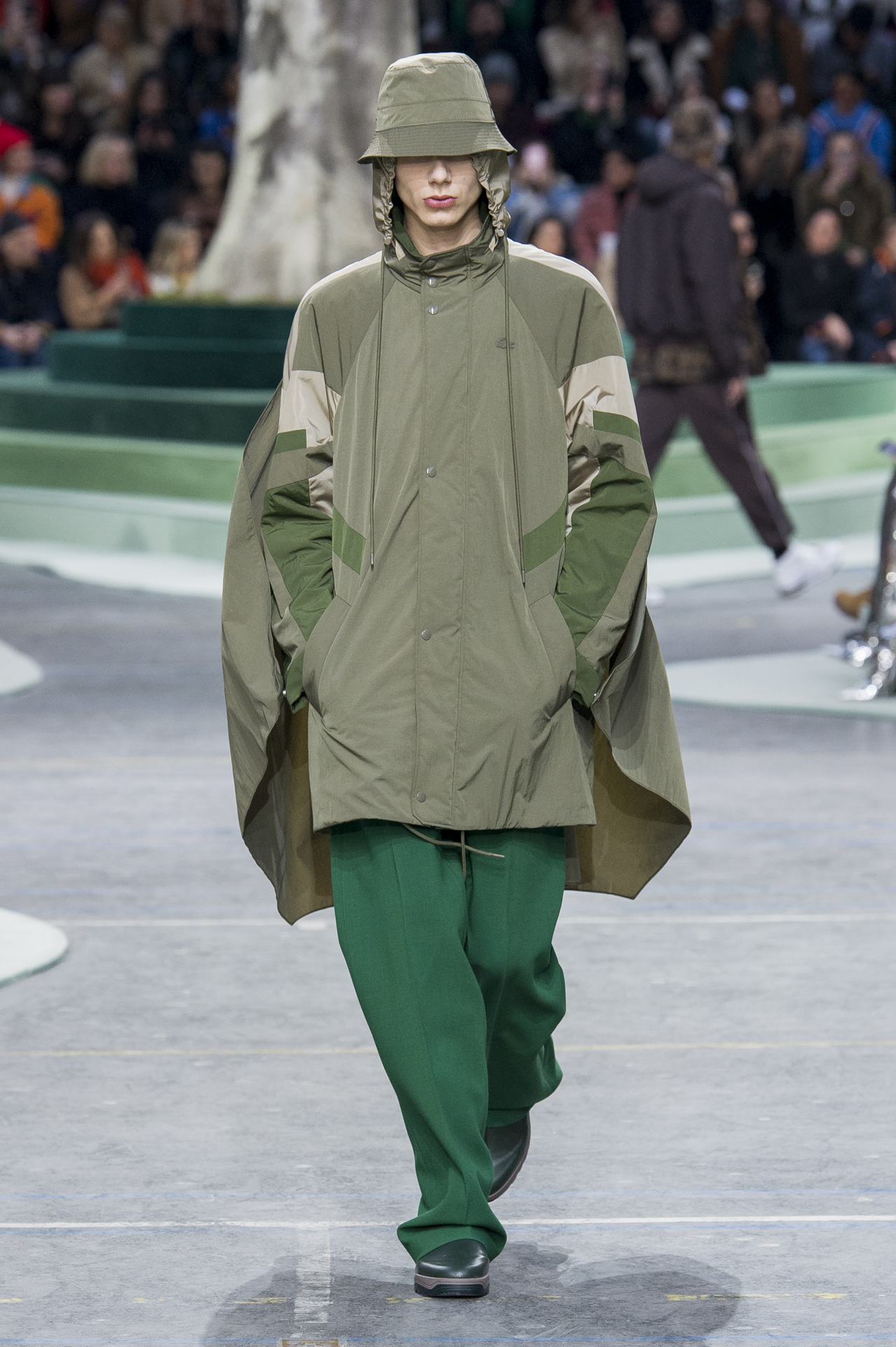 Un golfeur la taille d’un timbre Poste s’apprête à faire un swing. Un sapin se tient droit comme un pic au coeur d’un bois minimaliste. Des cartes postales vintage documentent Chantaco ou un Saint-Jean-de-Luz passé. Des estampes botaniques délinéent la feuille d’un chêne rouvre dans ses moindres détails. Les archives des années 80 et 90 de la maison, notamment ses vêtements de golf, habillent la collection d’un souffle forestier. Imprimés pastoraux en all-over, sweatshirts graphiques et verdoyants, pull-overs oversize aux illustrations enfantines : les motifs pictographiques agissent comme une boutique de souvenirs, au kitsch assumé, sublimé, repensé, sorte de carte postale géante de l’époque chez Lacoste, où hier fait écho à demain.