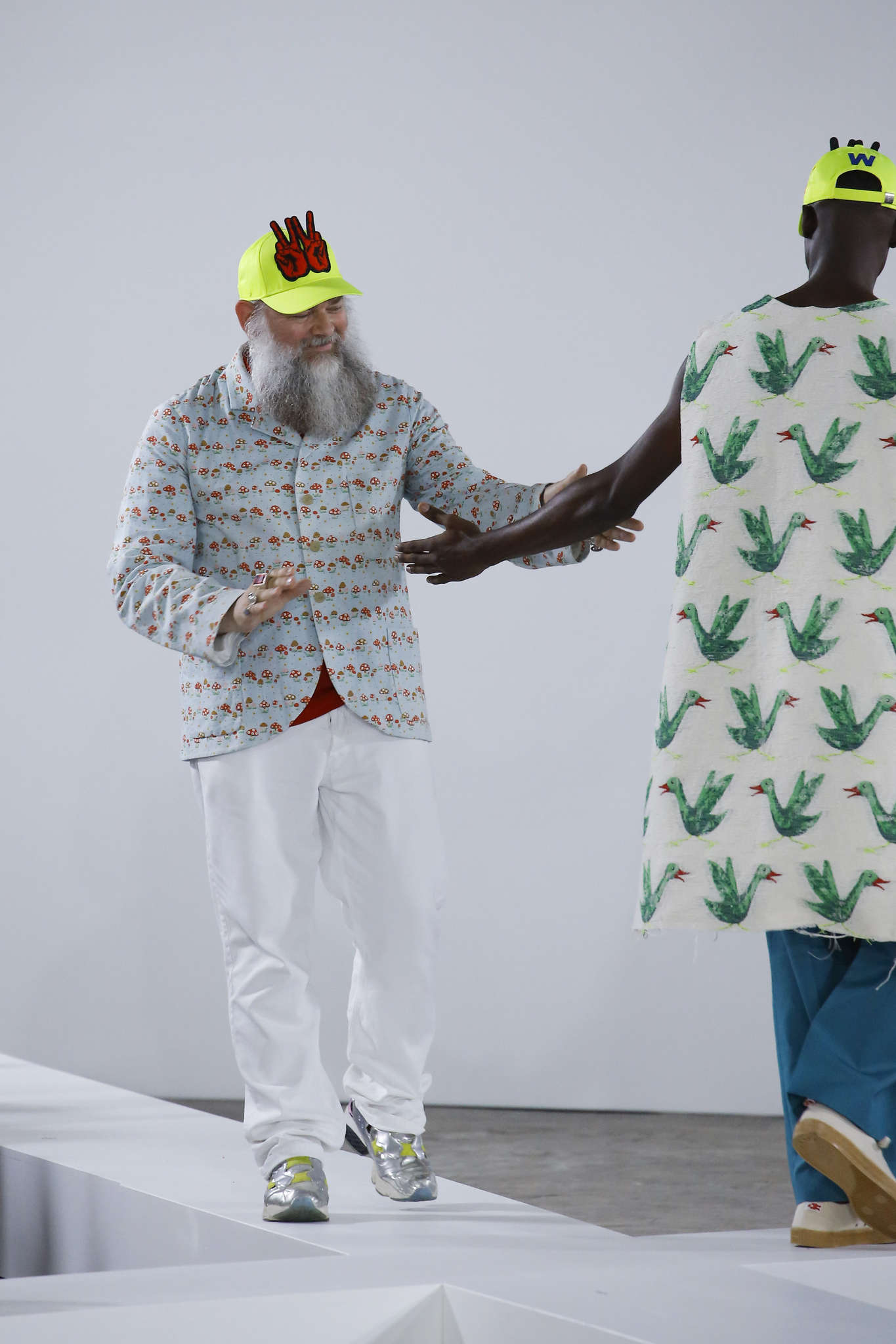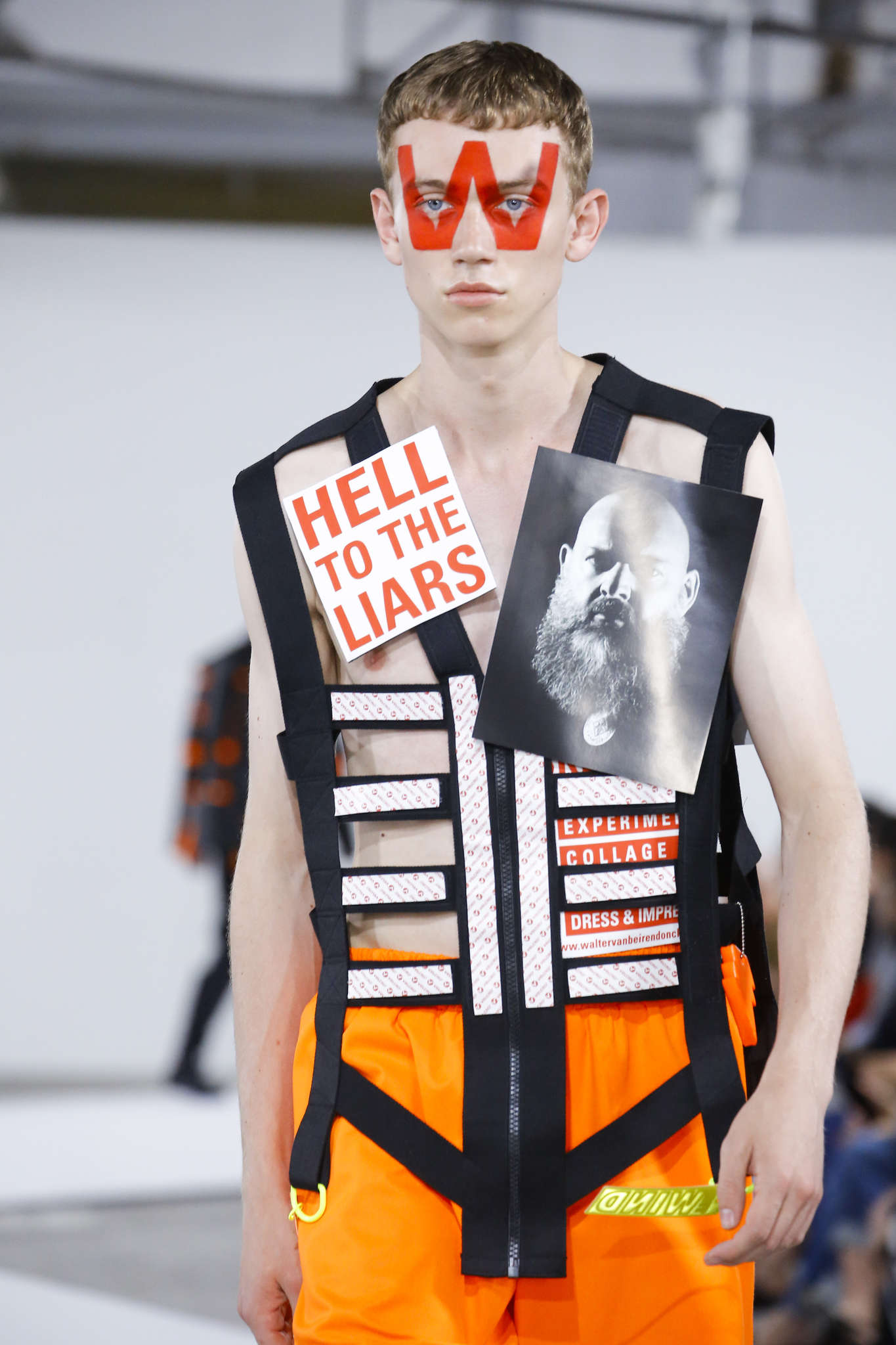 Par définition, le scandale est un ressort marketing éphémère. Il vise a créer du sensationnel à base de « théorie du complot » et titres racoleurs. Le schéma commun veut que la star, ou toutes personnes atteintes, mette fin aux rumeurs pour empêcher tous commérages. Mais Walter Van Beirendonck reprend la une. Il met en scène sa popularité en transformant le corps des mannequins en étendard à slogans. Des signes « Peace » s’hybrident aux casquettes. Un méta scandale: le créateur se réaproprie la cadence des événements. Il tue l’aspect frénétique du buzz en joignant silhouettes aux couleurs criardes et musiques lentes, silences et plumes de paons. Le vent l’emportera, tout disparaîtra … ( une autre victime des scandales). La fiction du scandale devient un dessin animé. Soit une histoire que l’on raconte aux enfants pour apprendre à distinguer le bien du mal. Le défilé aurait pu se limiter à un jeu de provocation, mais les dernières tenues montrent que les choses les plus fascinantes sont celles qui ont la capacité de transcender les attentes. Contrairement au scandale, dont les schémas séducteurs sont bien connus.
