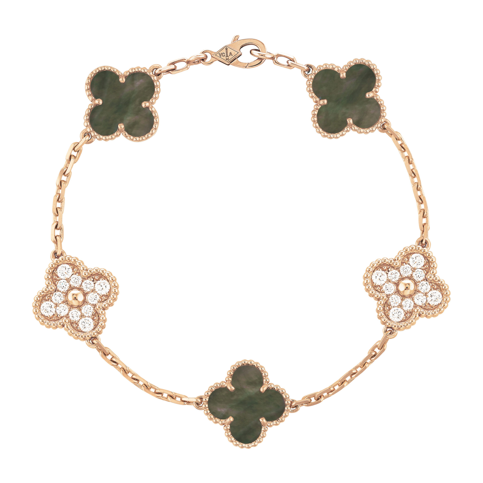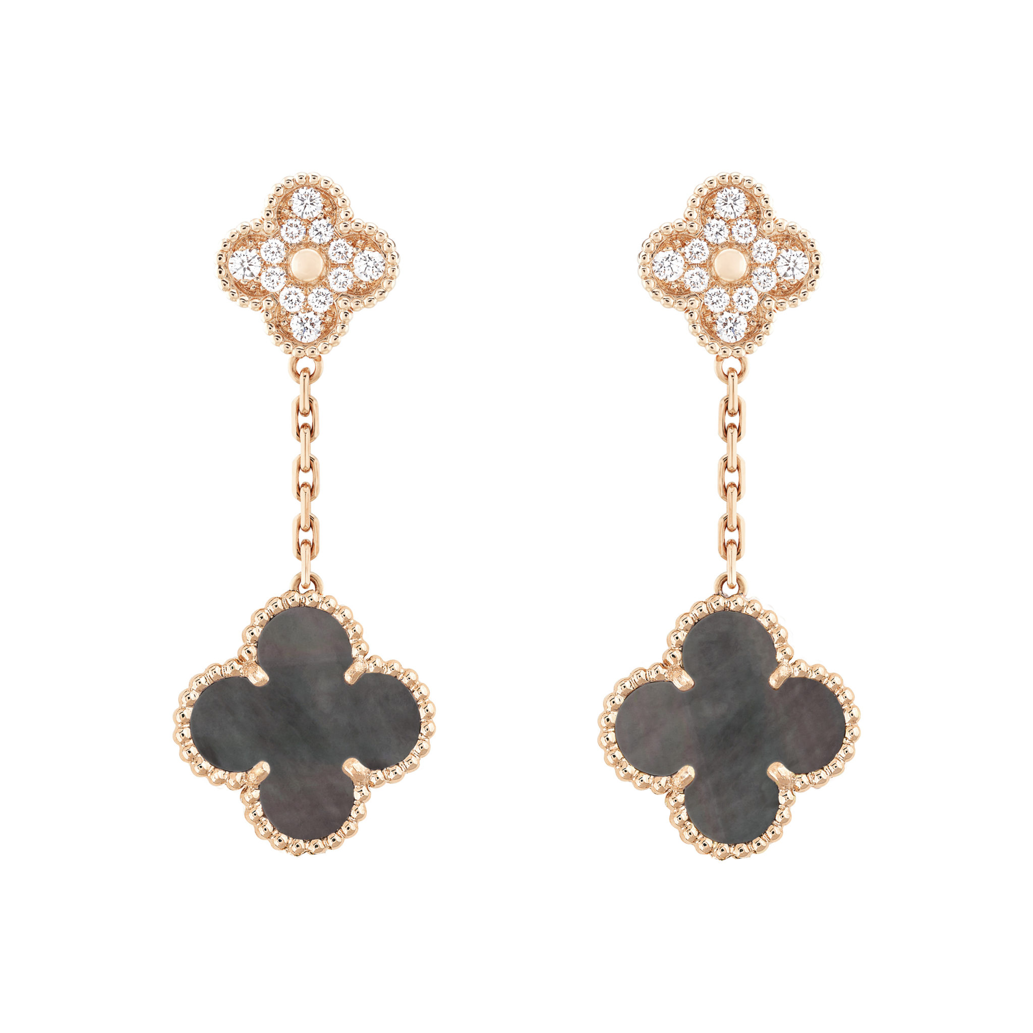 Cinquante ans après la création du premier sautoir Alhambra, la Maison célèbre cette création iconique à travers de nouveaux modèles qui enrichissent la collection permanente. Sur un sautoir et un bracelet Vintage Alhambra, accompagnés de motifs d’oreilles Magic Alhambra, les reflets de la nacre grise et le scintillement des diamants se marient à l’or rose, dans un doux camaïeu de nuances. Reprenant la même alternance de motifs, un sautoir et un bracelet Vintage Alhambra se parent d’onyx, contrastant avec l’éclat des diamants et de l’or blanc. Fidèles à l’esthétique d’origine de la collection Alhambra, les motifs s’ornent d’un délicat contour perlé, selon le savoir-faire emblématique de Van Cleef & Arpels, ainsi que d’une perle d’or centrale – sur les versions serties – tout en rondeur et brillance.