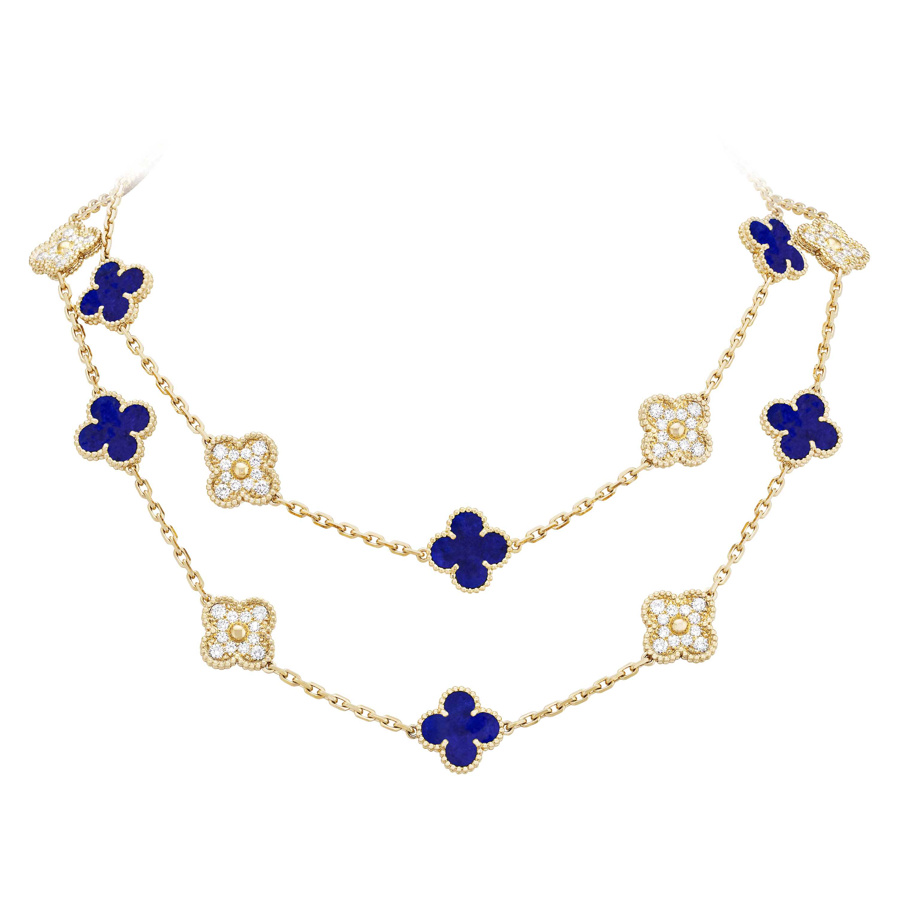 Afin de rendre hommage à la palette de matières qui a enrichi la collection Alhambra au fil du temps, la Maison dévoile deux éditions exceptionnelles, disponibles en quantités restreintes. Les différents modèles en or jaune mettent en lumière le lapis-lazuli et les diamants d’une part, et le cristal de roche d’autre part. Composées d’un sautoir et d’un bracelet Vintage Alhambra, ces éditions révèlent deux esthétiques différentes, jouant sur le contraste ou sur une limpide clarté. Le bleu profond du lapis-lazuli est ainsi sublimé par le rayonnement solaire de l’or jaune et la pureté des diamants, tandis que le cristal de roche suscite de subtils jeux de transparence, illuminés par l’or jaune.