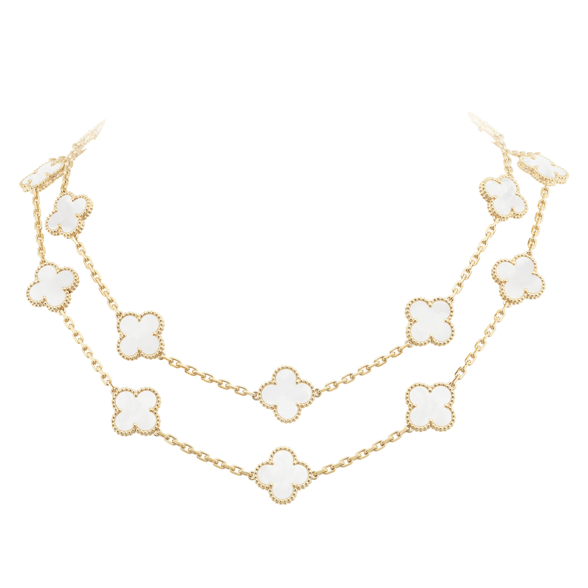 En 1968, la Maison crée le premier sautoir Alhambra inspiré de la forme du trèfle à quatre feuilles. Tel un harmonieux porte-bonheur, il se compose de 20 motifs en or jaune froissé, délicatement bordés de perles d’or. Ce symbole connaît un succès immédiat, s’établissant à travers le monde comme une icône de chance, emblématique de Van Cleef & Arpels.