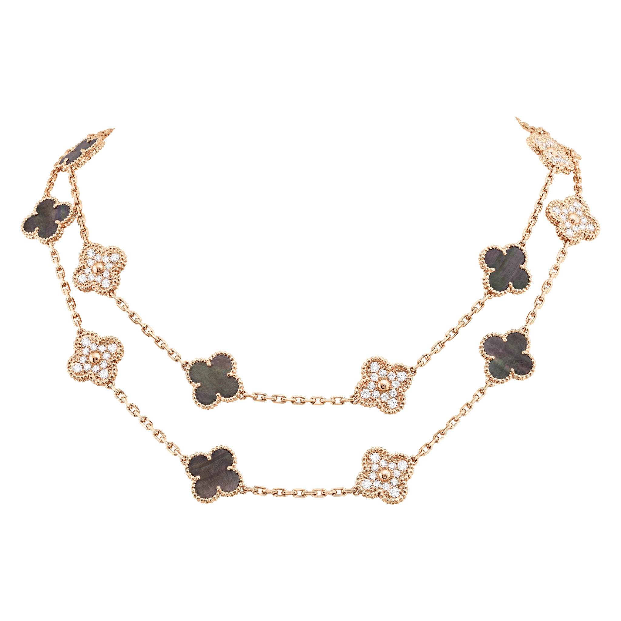 En 1968, la Maison donnait naissance à une véritable icône de chance : la collection Alhambra®. Inspiré du trèfle à quatre feuilles, son motif a traversé les époques, reflétant le style intemporel de Van Cleef & Arpels et l’excellence de ses savoir-faire. Cinquante ans après la création du premier sautoir Alhambra, la Maison dévoile de nouvelles créations mettant à l’honneur la fluidité et l’élégance de ce porté. Les reflets de la nacre grise répondent à la brillance du diamant et à la douceur de l’or rose, tandis que l’onyx d’un noir profond se conjugue à l’or blanc et aux diamants. À ces associations éclatantes de matières s’ajoutent deux éditions exceptionnelles respectivement ornées de lapis-lazuli et de cristal de roche, en hommage à la beauté des pierres qui ont paré la collection au fil de son histoire.