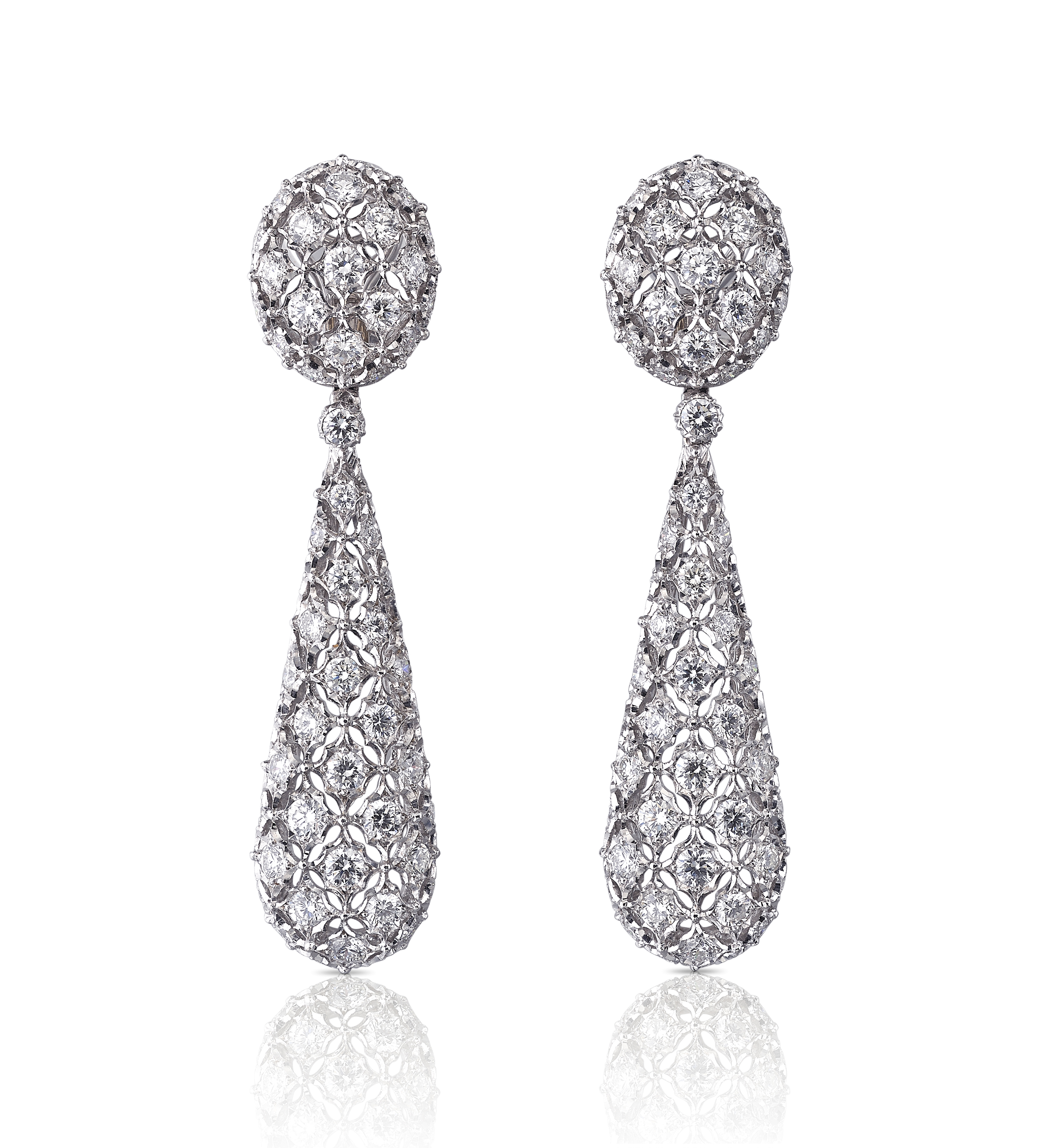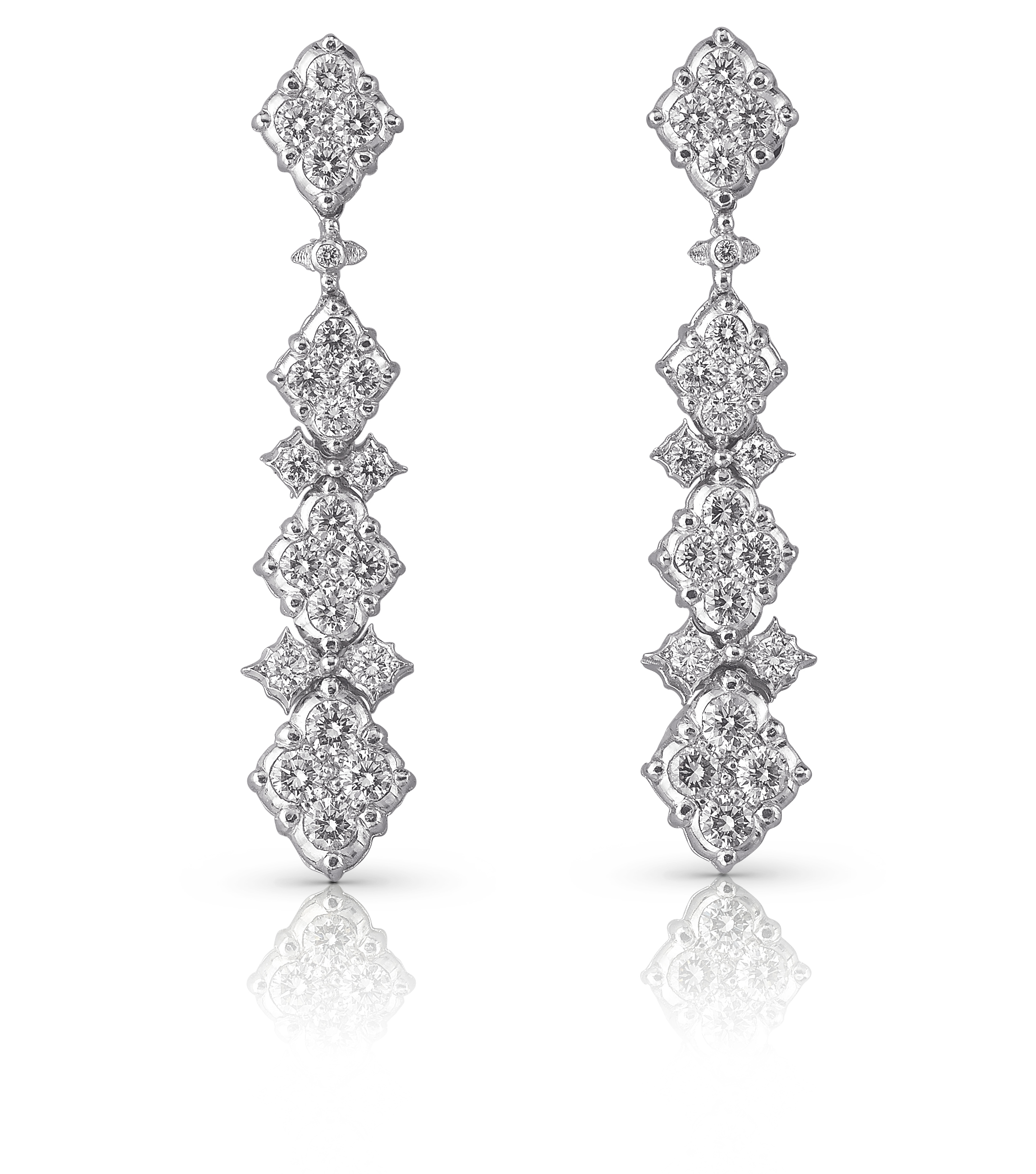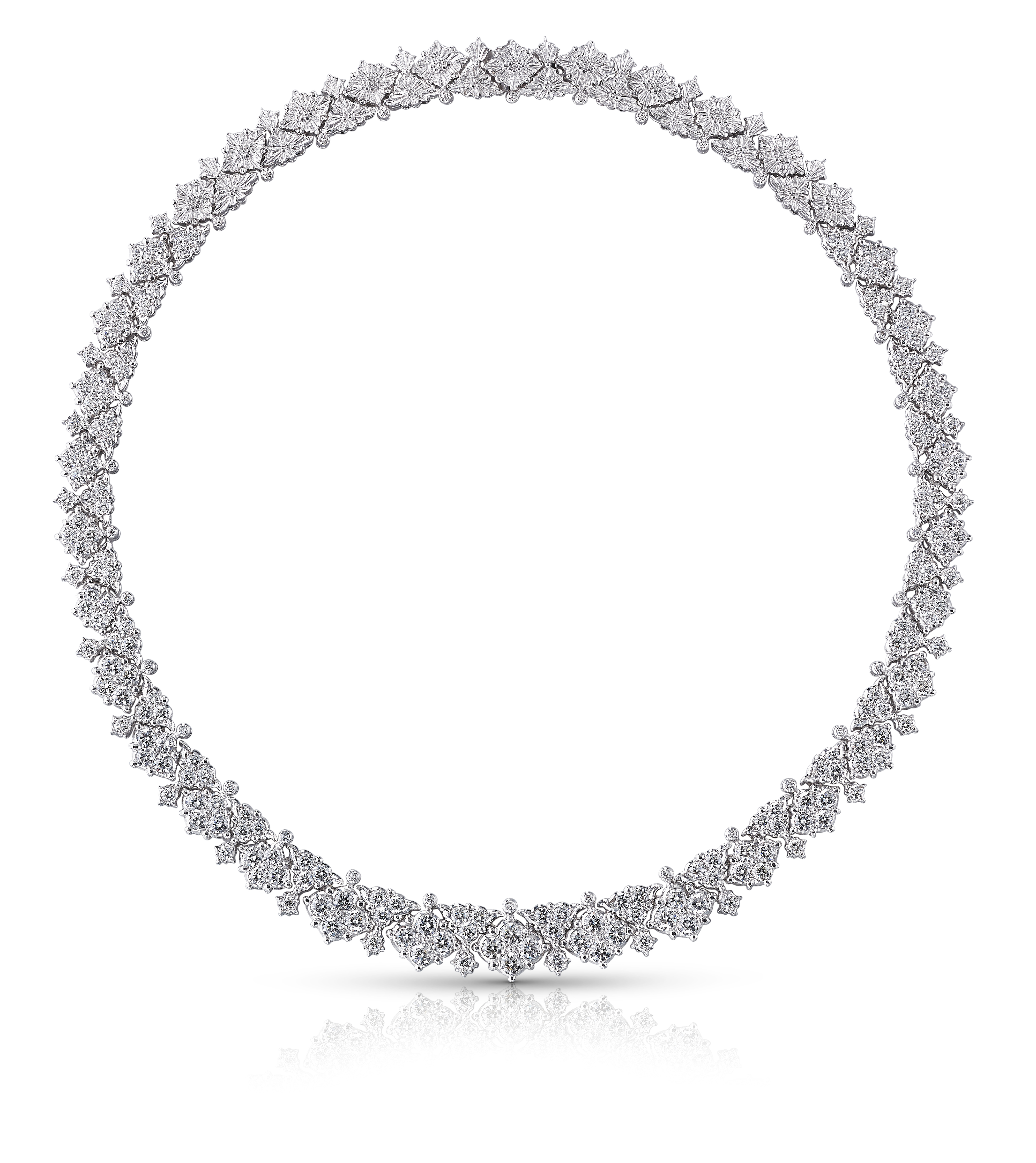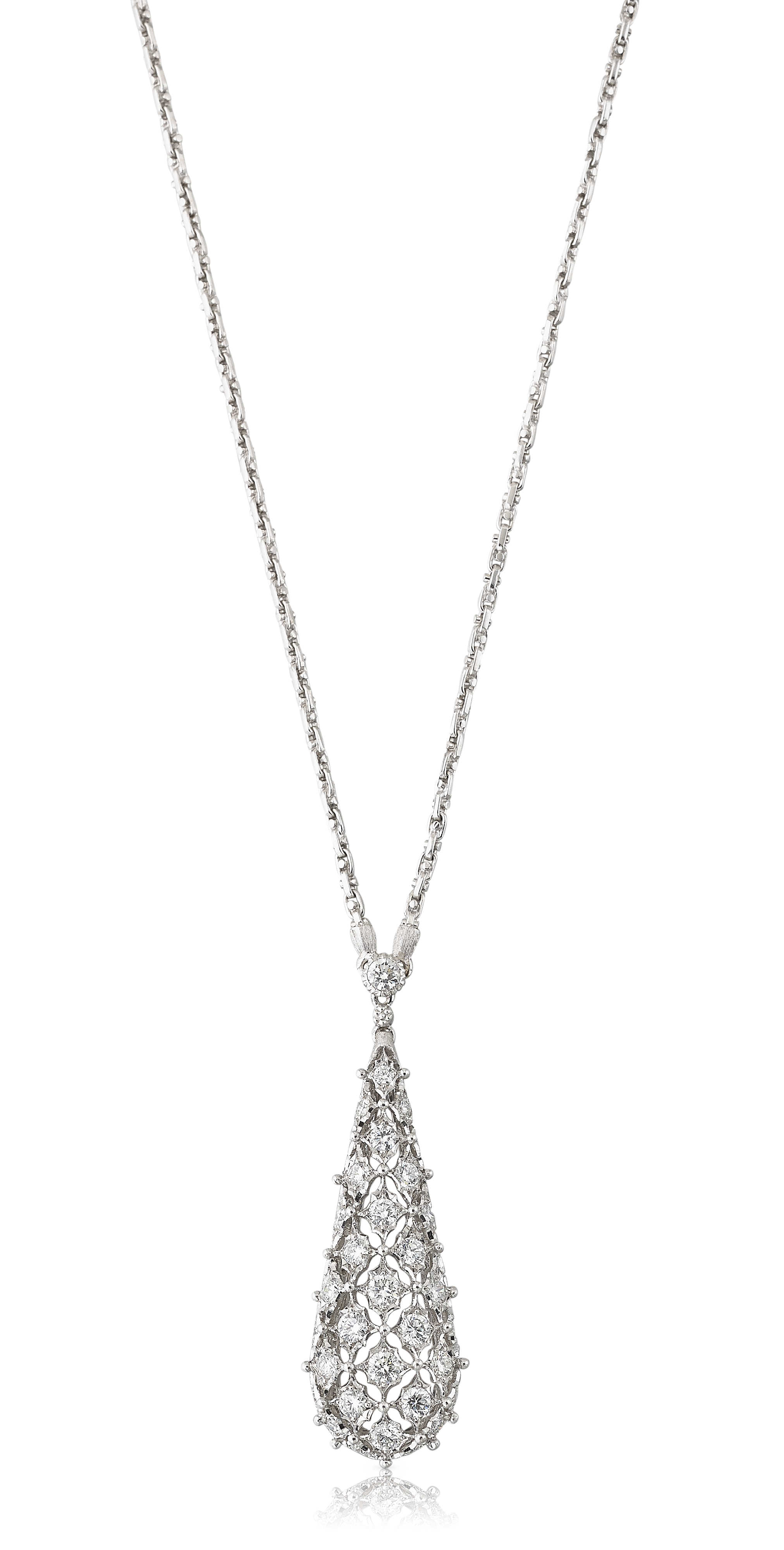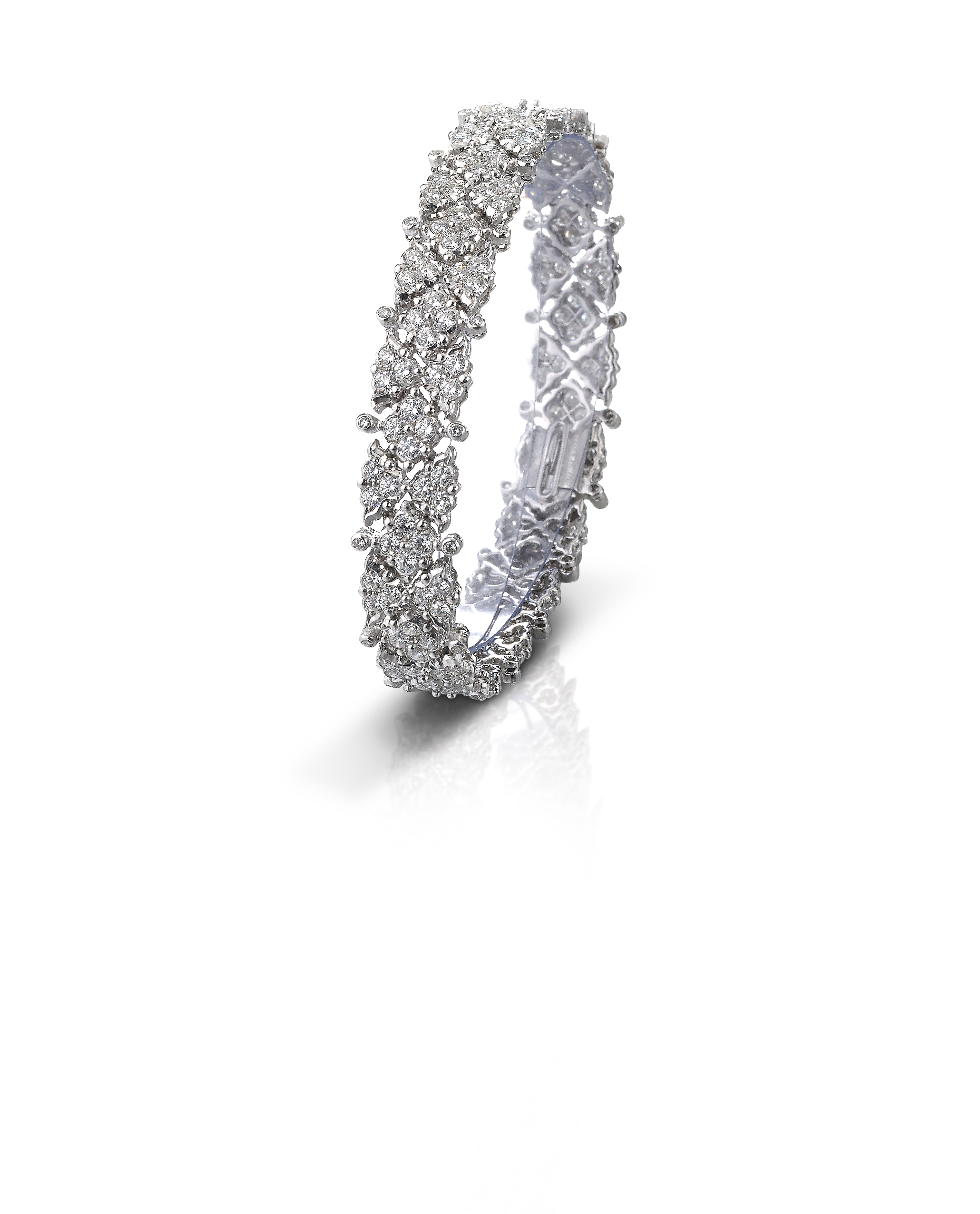 Collection Romanza déclinée de boucles d’oreilles, pendentif, colliers et bracelets en or blanc gravé et sertis de diamants blancs