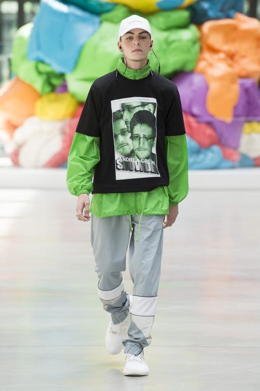 Avant d’écrire des tribunes sur le féminisme dans les quotidiens, Catherine Millet parlait des virages dans l’art contemporain. Elle explique qu’en réponse à l’abstraction des années 50, les années 70 se sont réfugiées dans l’art conceptuel : un art qui réfléchit sur lui-même. Résultat visuel : » un art qui se réduit à des propositions formelles tellement arides qu’on ne pouvait guère aller plus loin. » ( Cathrine Millet, L’art contemporain).Si la mode se théorise, alors elle n’a pas hérité de la recherche formelle des années 70. Une profusion de couleurs, d’imprimés, de jeans, de soie nous explosent à la figure. C’est dans le Yellow submarine sous prozac des Beatles que l’industrie de la mode à assister à cette cinquième journée. Atmosphère enfantine et ludique, qui laisse place à un cours théorique: la mode a parlé d’elle-même. De son histoire, de son rapport aux genres, au numérique, à la transmission. Les mélanges de tissus et d’imprimés chez Sacai ou Etudes rappellent la constante ouverture de la mode sur les autres cultures. Chez Andrea Crews c’est une ouverture paradoxalement cloisonnante qui est mise en scène. Des écouteurs greffés dans les oreilles, les mannequins arborent des t-shirts à l’effigie d’Edward Snowden. Nous vivons dans un monde sous surveillance. Le hic : nous livrons nous-mêmes nos propres informations. L’exigence d’exposition est intégrée à nos habitudes. Nous sommes nos propres médias. Une peur? Une chance? Une chose est sûr, cela oblige tout le système de la mode à se repenser.