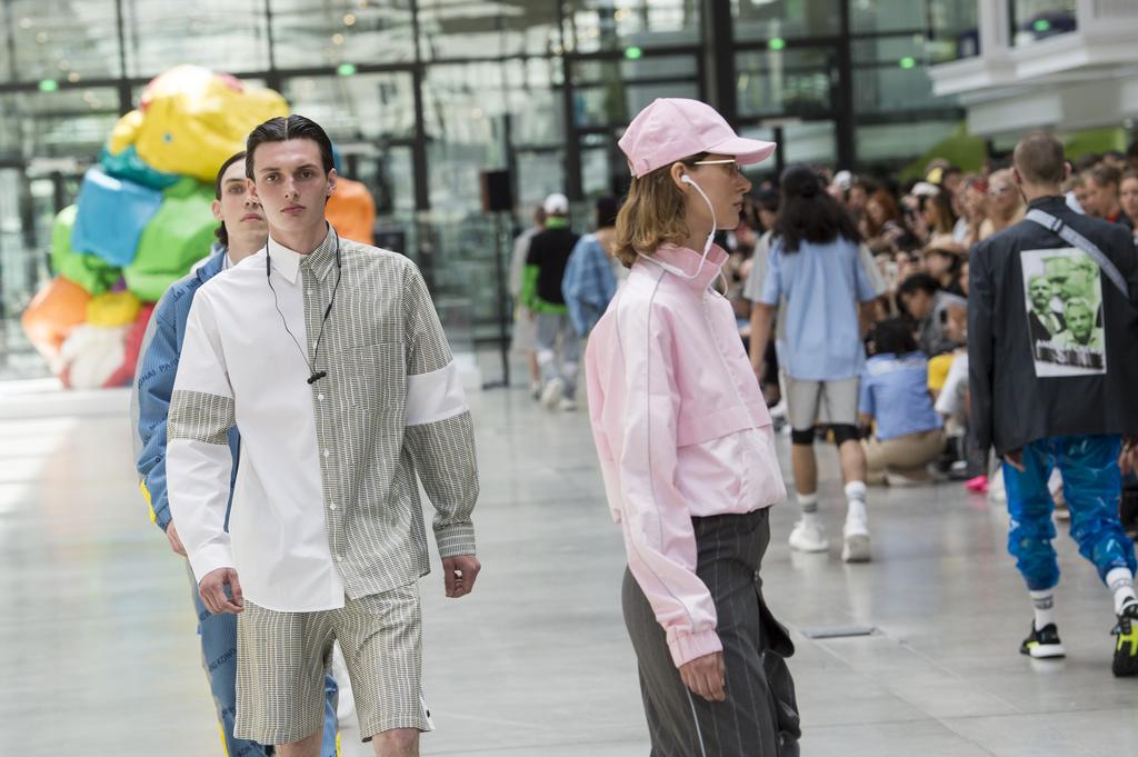 Ce n’est pas pour filtrer les rayons UV, mais les flashs des téléphones que Thom Browne proposait de visionner son défilé avec des lunettes de soleil. Verres jaunes : apparemment la couleur qui rend joyeux et plonge dans un dessin-animé surréaliste ou tout le monde fini heureux, deux par deux comme dans l’arche de Noé. Sauf que chez Thom Browne, les couples ne sont pas formés avec l’impératif de perpétuer la planète en cas de cataclysme : ils sont rassemblés par couleur. Qui se ressemble s’assemble, whatever le genre. Couleurs Teletubbies pour une collection qui est loin d’être niaise. Une réaction supplémentaire au besoin de déconnexion. Les petits nains tondent patiemment la pelouse, et cultivent un jardin extraordinaire, en quête d’une esthétique harmonieuse. Une mise en abîme du travail de Thom Browne qui prend le temps de travailler chaque détail. Un luxe.
