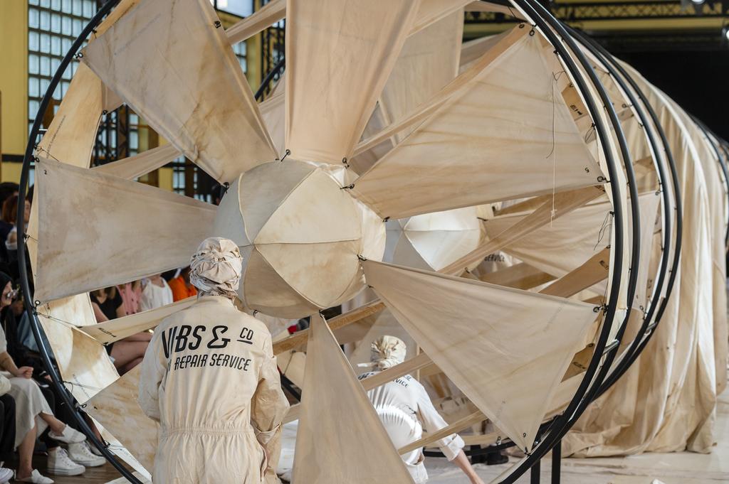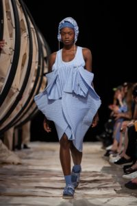 Problèmes climatiques et apparition de la scène mode japonaise en France dans les années 80 : toutes ces histoires se superposaient dans la collection Henrik Vibskov. Le travail de volume sur le robes criait : Issey Myake, Rei Kawakubo. En puissant dans les archives stylistiques de la scène japonaise, Vibskov construit un discours sur l’environnement. Il convoque l’amour européen des rites, du cérémoniel japonais pour dire stop à la pollution. Une rhétorique qui revêtit des imprimés vichy bleu, des chemises à rayures légères, des pyjamas de soie et des costumes arrachés d’une histoire d’« adulte« . Le tout avec un hommage non dissimulé à Margiela dont le nom ne s’affiche pas seulement sur les affiches de musée.
