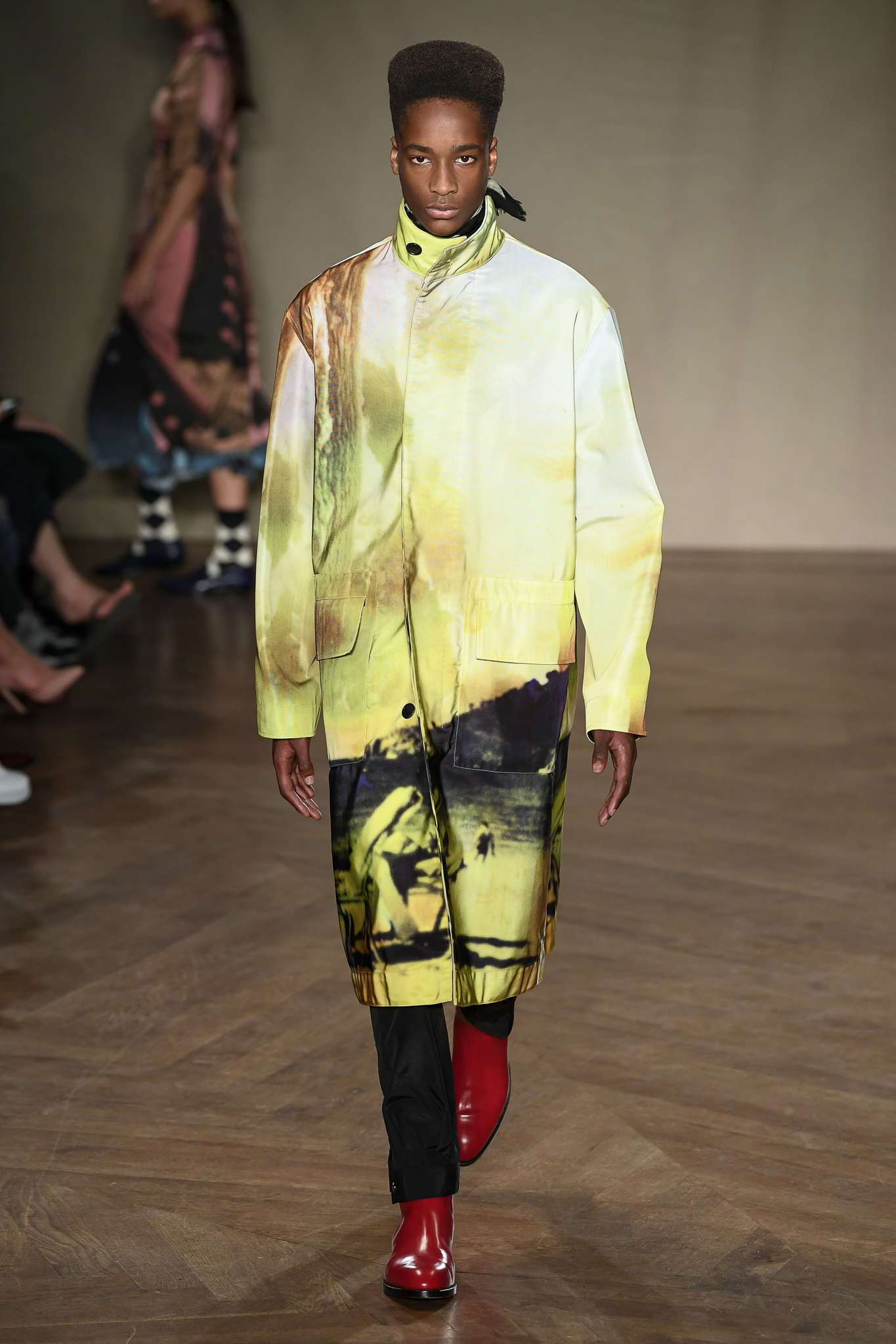 Immortaliser le passé : tout un enjeu. Une volonté de figer, de capturer des instants. Mais les êtres vivent. Ils glissent et s’en vont. Même les drônes ne peuvent les rendre éternelles. Chez Christian Dada les corps s’évaporent dans de longues capes, des parkas imprimés des photographies de Nobuyoshi Araki. Masanori Morokawa crée un Christian Dada de costumes blancs aux coupes amples- une filiation avec le Japon. Mais pas n’importe quel Japon: celui du temps long, des rites. Les mannequins défilent: certains portent sur leurs visages les marques du temps- peu importe tous ont les mêmes silhouettes longilignes vaporeuses. Le vêtement efface le temps ?