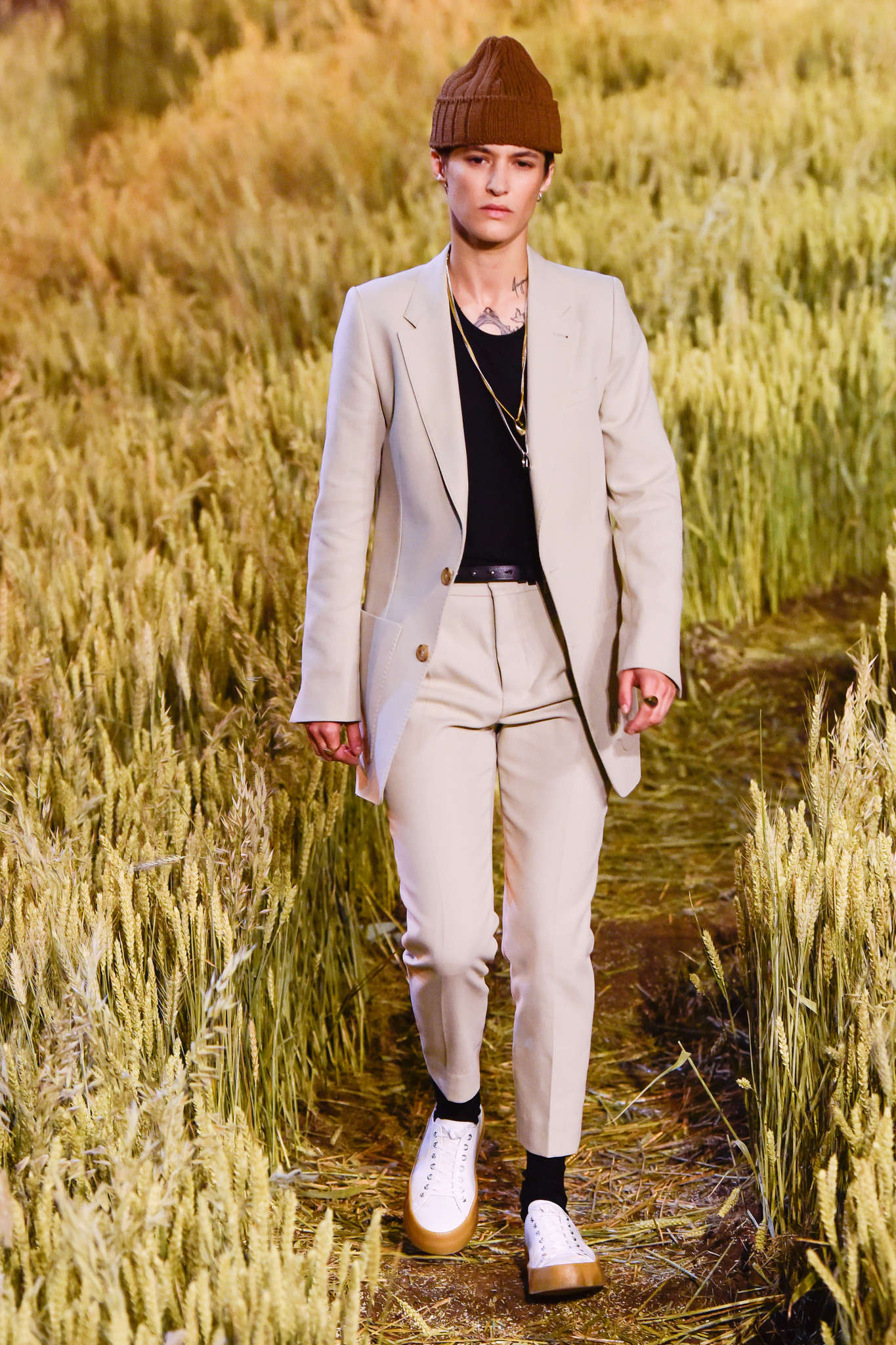 La masculinité citadine s’oppose à une » masculinité populaire » adulant les Rambo et Schwarzennger. L’homme aux champs est le nouvel exotisme de la saison. Les fantasmes autour du chapeau de paille permettent d’entrevoir le récit des choses « simples » et « authentiques ». Pourtant ce ne sont pas des habits paysans que revêtissent les hommes enfantins de cette saison. Ils conservent le tailoring, mais un tailoring moins Wall Street. Le retour au bac à sable et à la campagne se fait avec des tissus fin et léger.Ils deviennent les armes de la simplicité ornementale. Un homme qui ne met pas la main à la terre, mais aime se promener sur ses terres. La classe moyenne, vivant hors des villes est-elle privée de mode ?