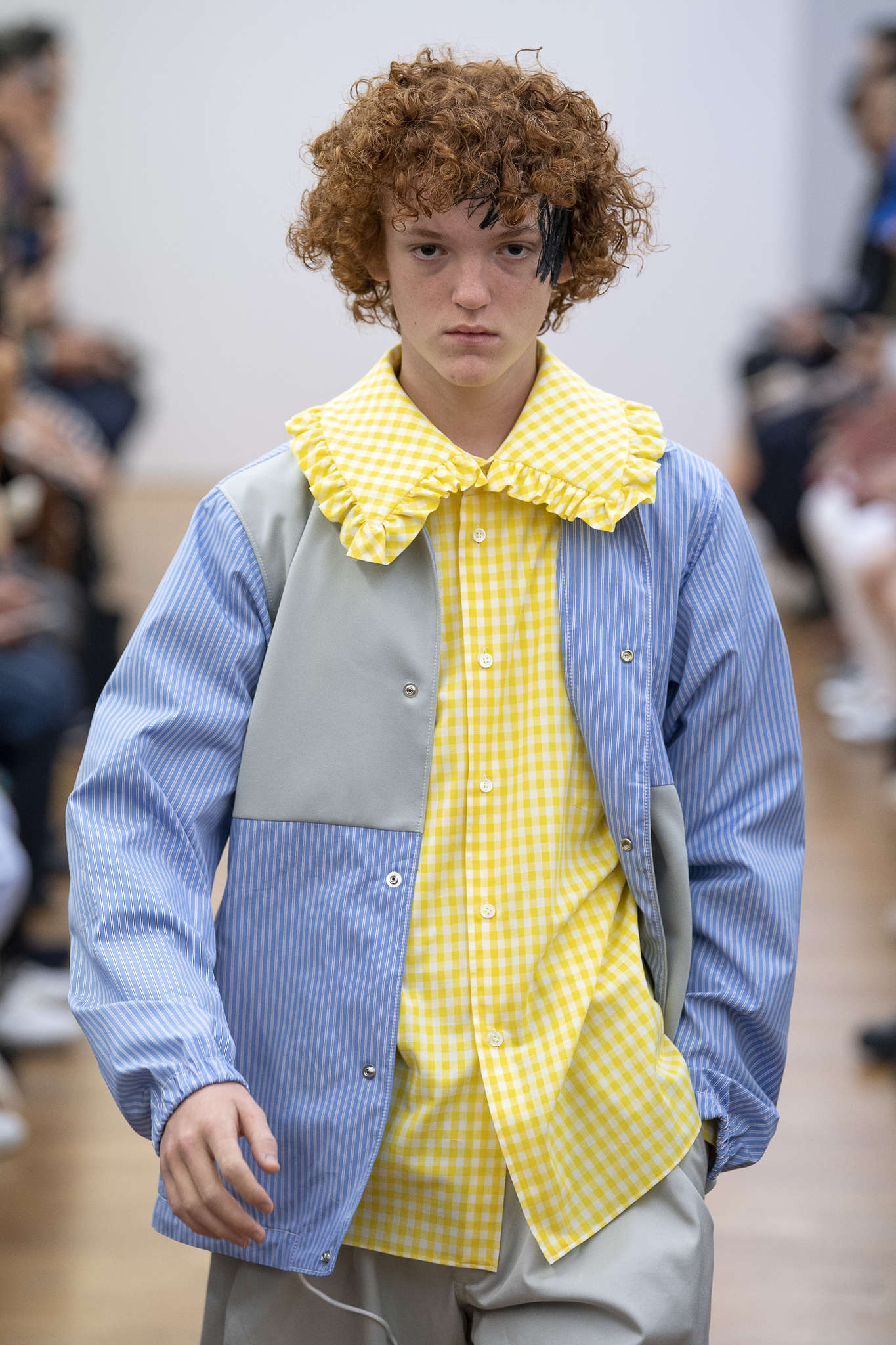 En janvier dernier, l’introduction de la sensibilité masculine était déjà une idéologie qui gagnait du terrain. Après le défilé du créateur espagnol Gomez Paloma, le mot Genderless était sur toutes les lèvres. Sans savoir vraiment son sens, ni les structurations de pouvoirs derrière ce terme, la sensibilité masculine est de nouveaux mise en avant pour l’été 2019. Exagération, mise en scène théâtrale. Revêtir des habits c’est comme enfiler différents costumes de genres: l’idée de performance est là, elle crie. Elle permet de penser le genre comme une construction sociale et culturelle, pas un déterminisme biologique (c’est tout le travail de De Lauretis ou Butler). Pourtant cette saison, les couleurs pastels, les pulls roses, l’utilisation de la broderie poussent à applaudir une « sensibilité masculine » tout bonnement féminine. Le problème de ce discours : sous l’égide de la libération de l’homme et le couplet d’un rejet de la virilité; bien mérité, la sensibilité convoquée est genrée. Elle est rose bonbon, enfantine et lascive- « On emprunte à la femme sa sensibilité » -car, oui, si l’homme est sensible c’est grâce à des caractère féminins. À chacun son domaine de compétence. Vive l’évolution ?!