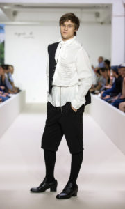 Un garçon au féminin, une fille au masculin… Et si la chanson était un peu plus complexe ? La remarque de Gaultier pousse à regarder en arrière. Avant le drame de la codification genrée du vêtement, la recherche de l’élégance par une élite avait le mérite de débinariser. Les costumes féminins et masculins sont semblables. Agnès B. nous fait une piqûre de rappel. Toile de Jouy, pantalons en orgenza blanc, dentelles : il fut un temps ou tout cela n’était pas uniquement la part des femmes. Plutôt celle d’une élite. Au XIXe siècle de nombreux philosophes et artistes vouent un culte à la mode, notamment les dandys, mais aussi les romantiques et des écrivains comme Balzac- en somme des hommes éduqués. En 1975, le sociologue Pierre Bourdieu signe un texte sur la haute-couture ( pas le prêt-à-porté, attention) avec Yvette Delsault,