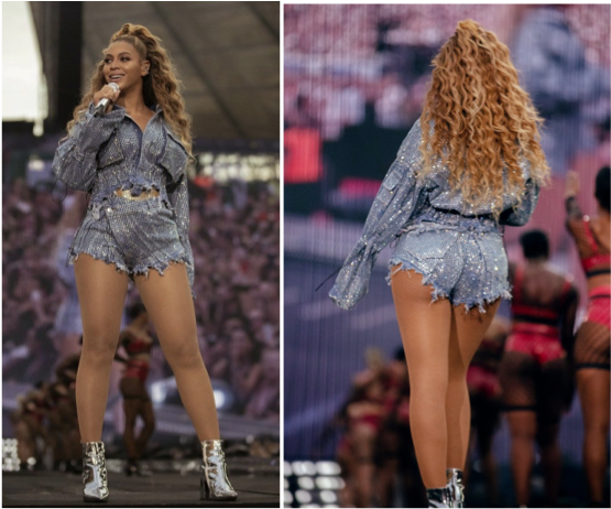 BEYONCÉ porte une veste et un short en denim déchiré paré de cristaux OTTOLINGER à l’occasion du passage de sa tournée On The Run II à l’Olympiastadion Berlin le 28 juin 2018 à Berlin en Allemagne.