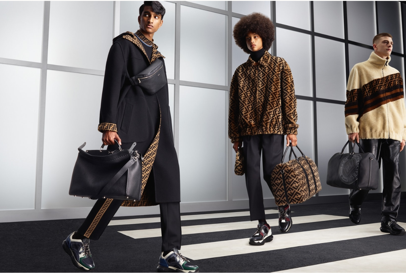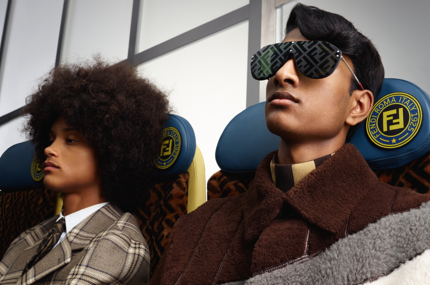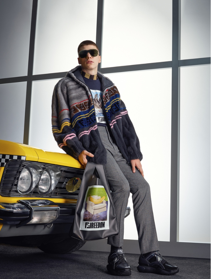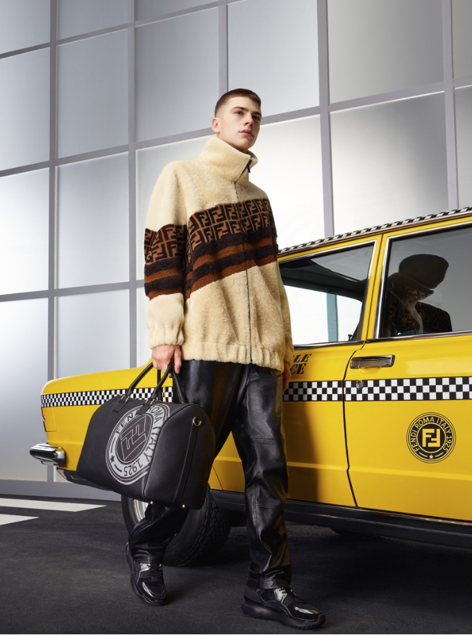Voici la nouvelle campagne homme Automne / Hiver 2018-19 qui rappelle fortement le défilé : un taxi jaune, un passage piéton et des sièges d’avions qui montre l’homme FENDI près à partir en voyage pour Rome de l’aéroport.
