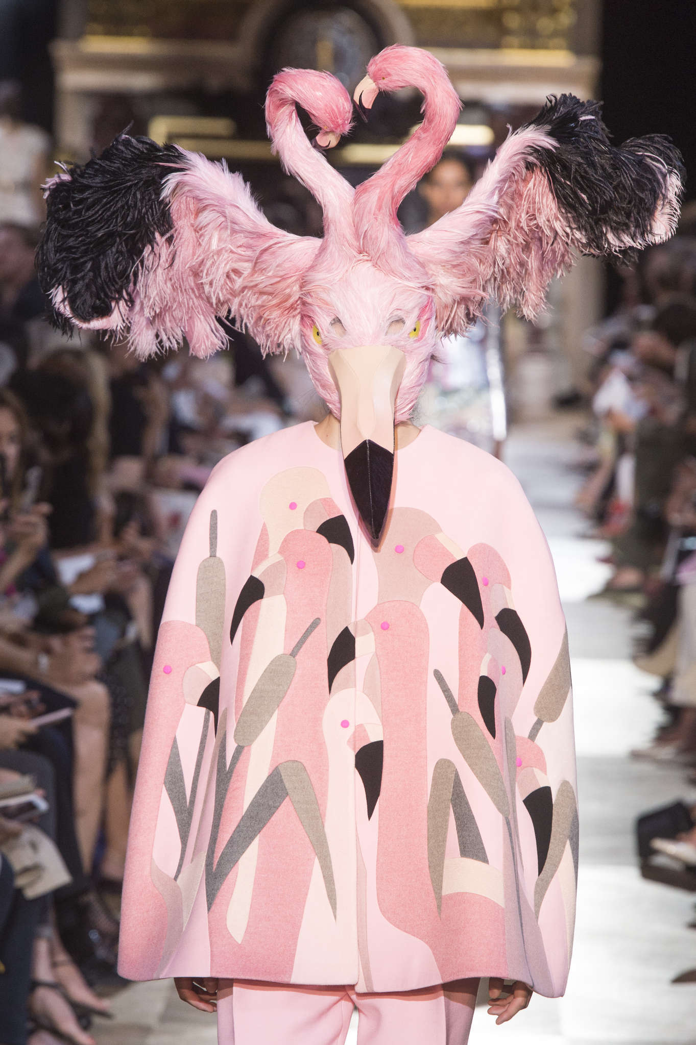 Entre pénombres sous-marines et lumières tropicales, la femme Haute-couture n’est plus qu’un faisceau, une longueur d’onde. Une sorte de corps lumière : un variateur d’ambiance. Elle se fond dans un paysage animal. Les pièces ne se contentent pas d’évoquer la faune à travers des imprimés. Les mannequins sont littéralement métamorphosées en créatures sauvages. Chez Schiaperalli, Bertrand Guyon puisse dans les archives de la maison en rendant hommage aux créatures surréalistes qu’Elsa Schiaperalli protégeait. Entre temps, le flamant Rose a éparpillé ses plumes un peu partout. Si sa couleur évoque à la fois le bonheur, la féminité , l’homosexualité, l’érotisme il a perdu de sa vigueur chez Dior. Un retour de la panoplie « élégante en tailleur ». Un « rétro fantasme » peu fantasque, paradoxalement vu sur des écrans 4.0. La technologie nous bouffe ? Une énième panique morale, qui fait suite à tant d’autres. Le temps s’accélère et le luxe ultime est d’atteindre l’a-temporalité. Quelque chose d’inaltérable, qui prend du temps a être confectionné et reste.