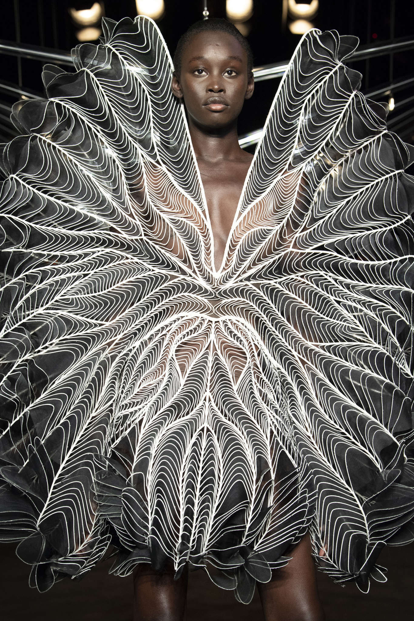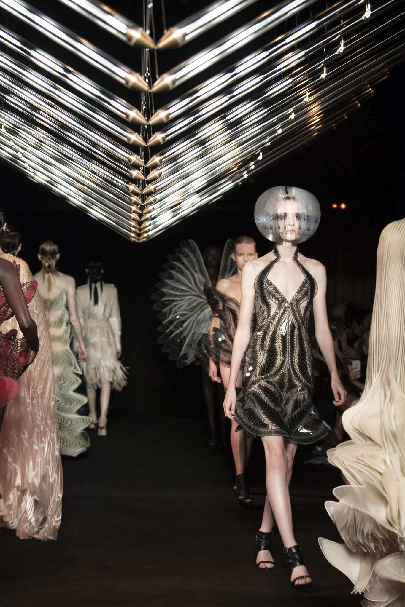 Chaque saison, le travail d’ Iris Van herpen est scruté. En introduisant la technologie au coeur de l’expérience couture, elle travaille avec virtuosité les limites entre la nature et la technique. Une véritable Donna Haraway ( sociologue, féministe auteur du manifeste Cyborg ) de la couture. Si ses créations sont affublées de l’adjectif futuriste, elles sont tout simplement le récit de la condition humaine au présent. Les cyborgs ne sont pas l’avenir de l’humain. Nous sommes des organismes qui vivons dans un rapport nécessaire à la technique. Et ce depuis toujours. Le robes d’Iris Van Herpen dotent l’humain de ce que la nature a négligé. La « syntopia » s’achève par une parade de paon. Un symbole d’immortalité.