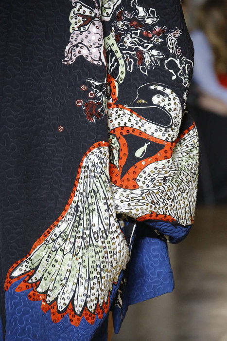 La première tactique politique du défilé Fendi : marquer la rupture en changeant de nom. Il ne s’agit plus de Fendi Fourrure, mais Fendi Couture. Si certains manteaux semblent être en vison, ce n’est qu’un habile trompe l’oeil, orchestré par Karl Largerld et Silvia Fendi. « 80 % de ces vêtements ne sont même pas en fourrure ». Là on touche un autre versant de ce plan de renouvellement : Fendi se détache de la tradition fourrure de son Italie nationale pour toucher une nouvelle élite transnationale dont l’attachement à la peau de bête morte et beaucoup moins évident. En rompant avec la tradition nationale, Fendi entre dans le cours de la bourse Mondiale. Dans le Palais Brogniart, soit l’ancienne place de la Bourse française, l’ordre Fendi prend des allures de ménagères mondaines des sixties, amoureuse de Robert Delaunay. Tout un refrain mondain : le troisième acte du plan de renouvellement. Si certains codes trop liés à une élite poussiéreuse sont à éradiquer, certains deviennent les fermants du discours de l’exception « Fendienne ».