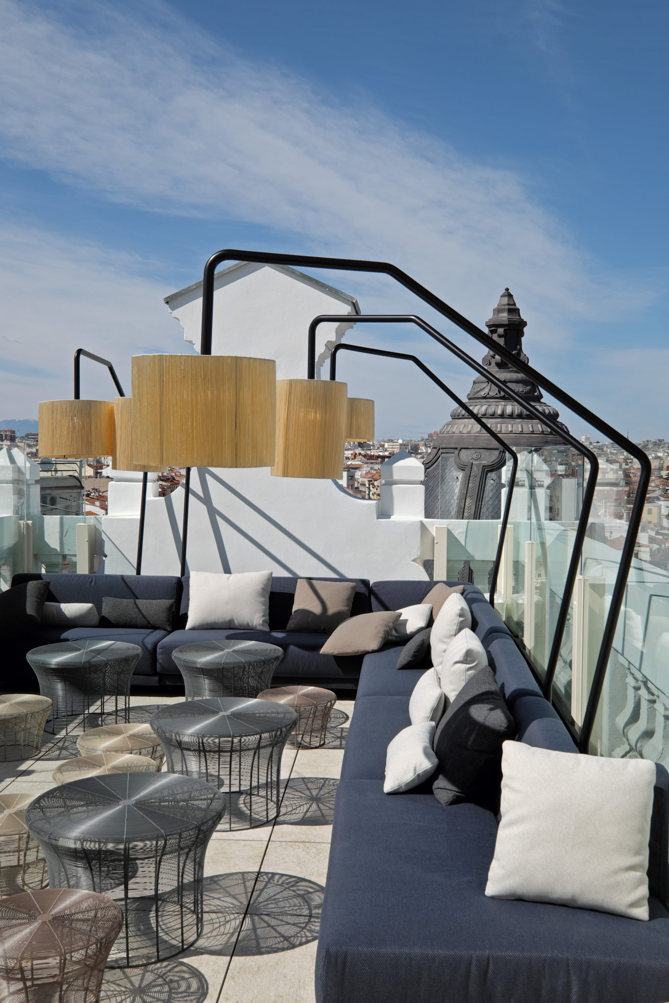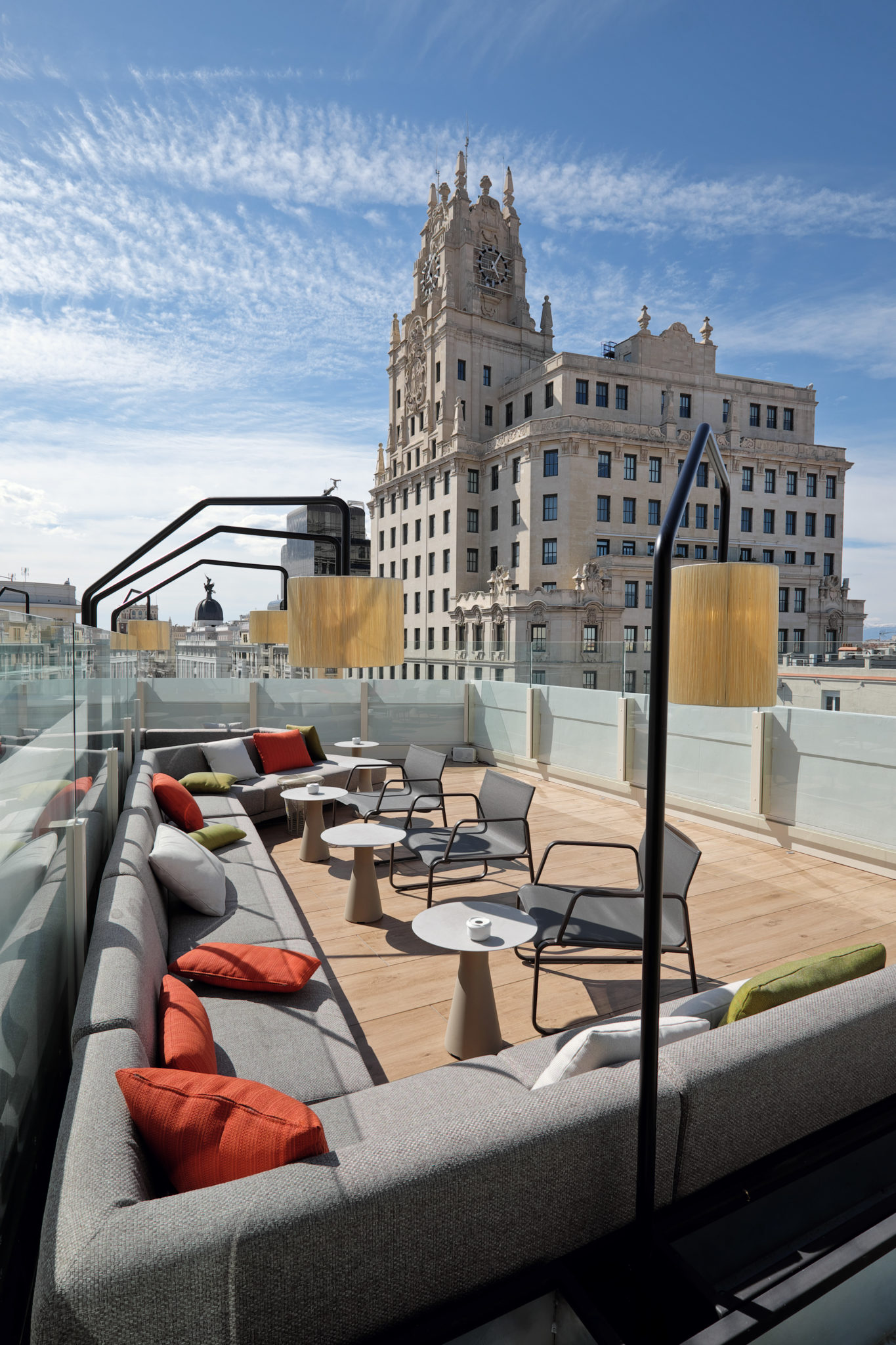 Situé au neuvième et dernier étage, le toit-terrasse ‘Tanqueray Sky Garden’ de l’hôtel offrant une vue à 360° sur Madrid et la Gran Vía. Il est composé de plusieurs terrasses et constitue l’endroit idéal pour se détendre et profiter de soirées exclusives autour des cocktails conçu par le bangladais Joel Jamal.