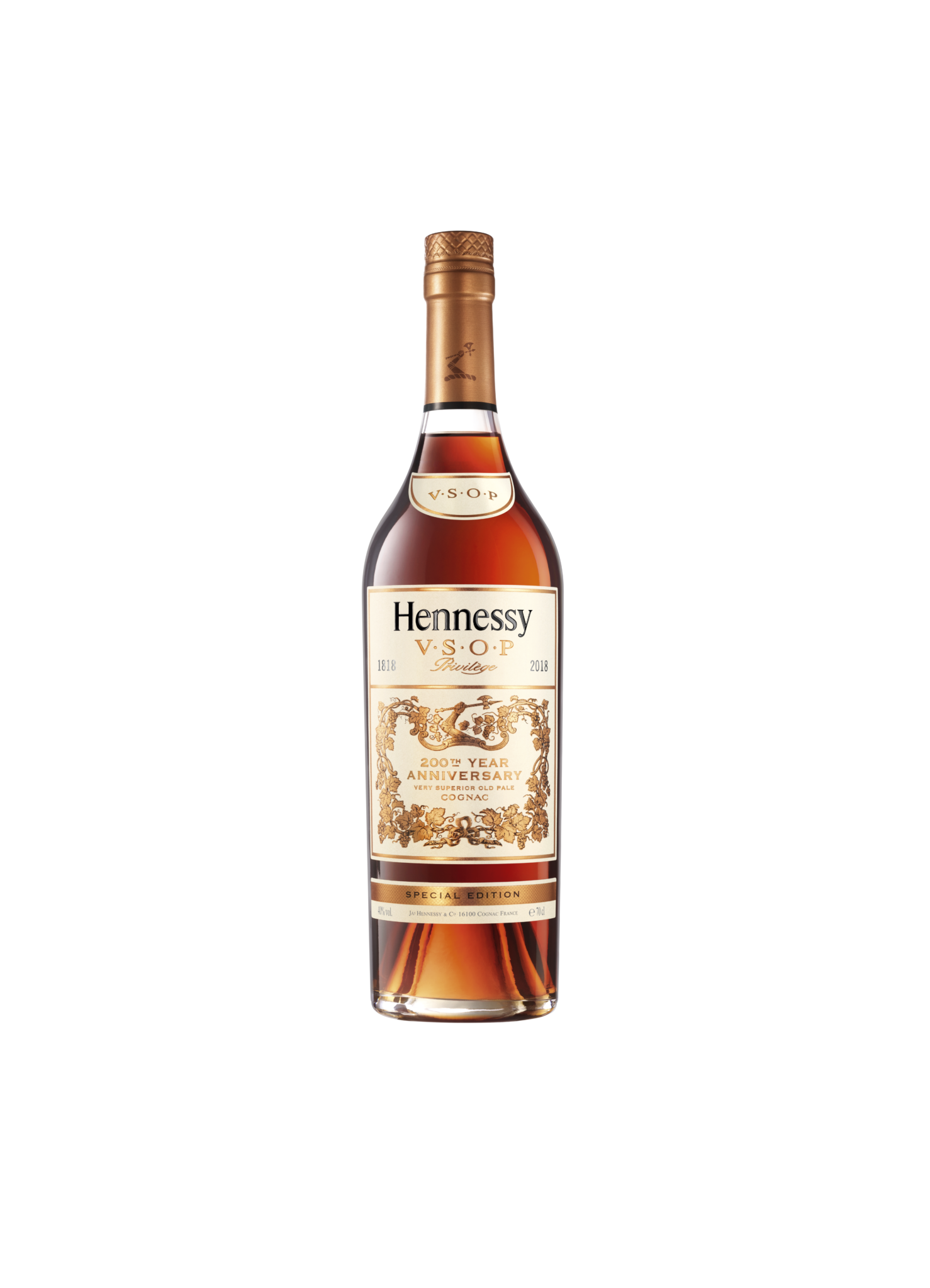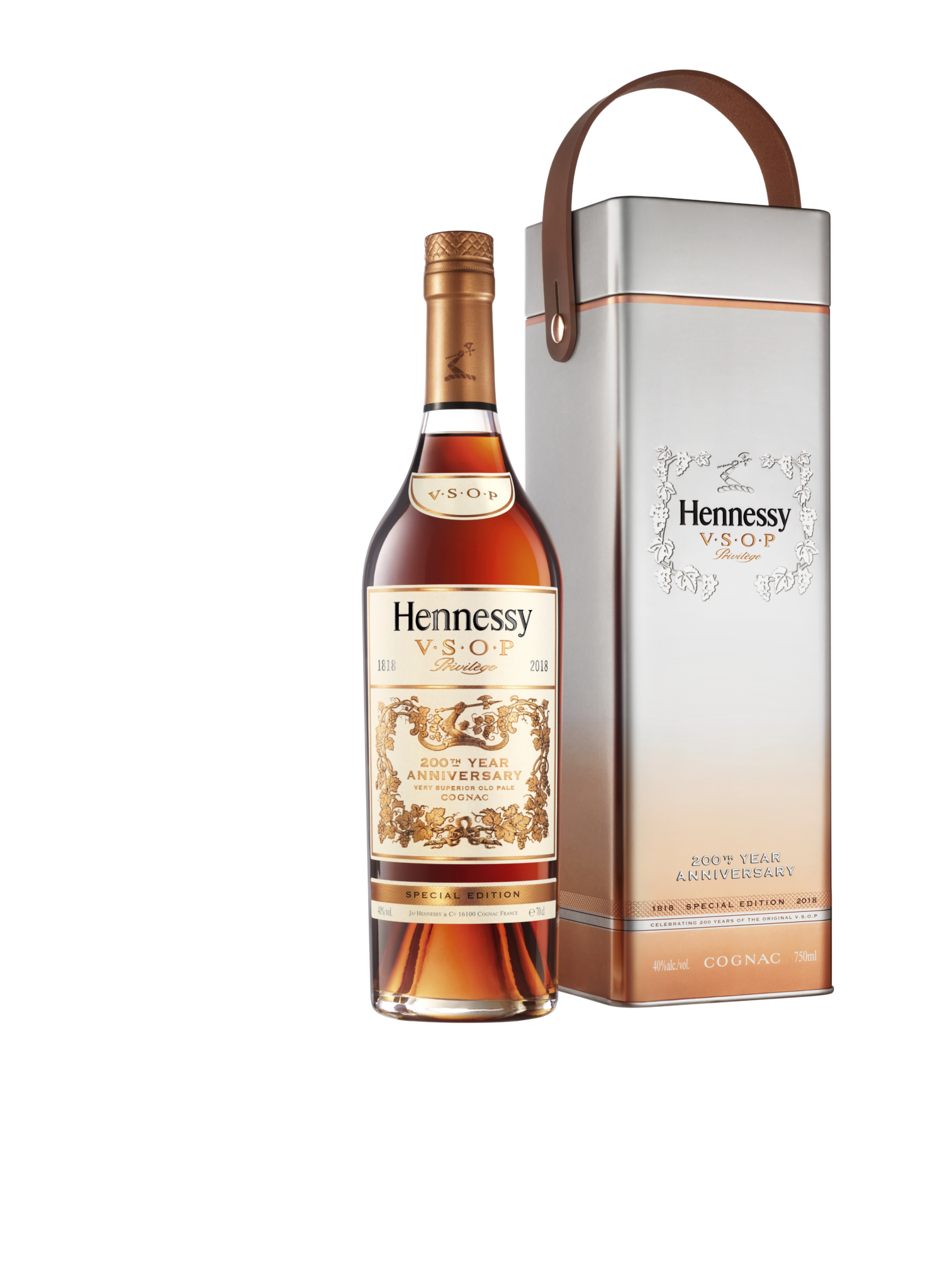 Pour le 200ème anniversaire de Hennessy V.S.O.P Privilège, la Maison met à l’honneur son héritage avec un design s’inspirant de la bouteille du milieu du XIXe siècle, connue sous le nom de “charentaise”. Plusieurs éléments d’archives, notamment le motif de la feuille de vigne et les timbres vintage, ont inspiré cette édition limitée.