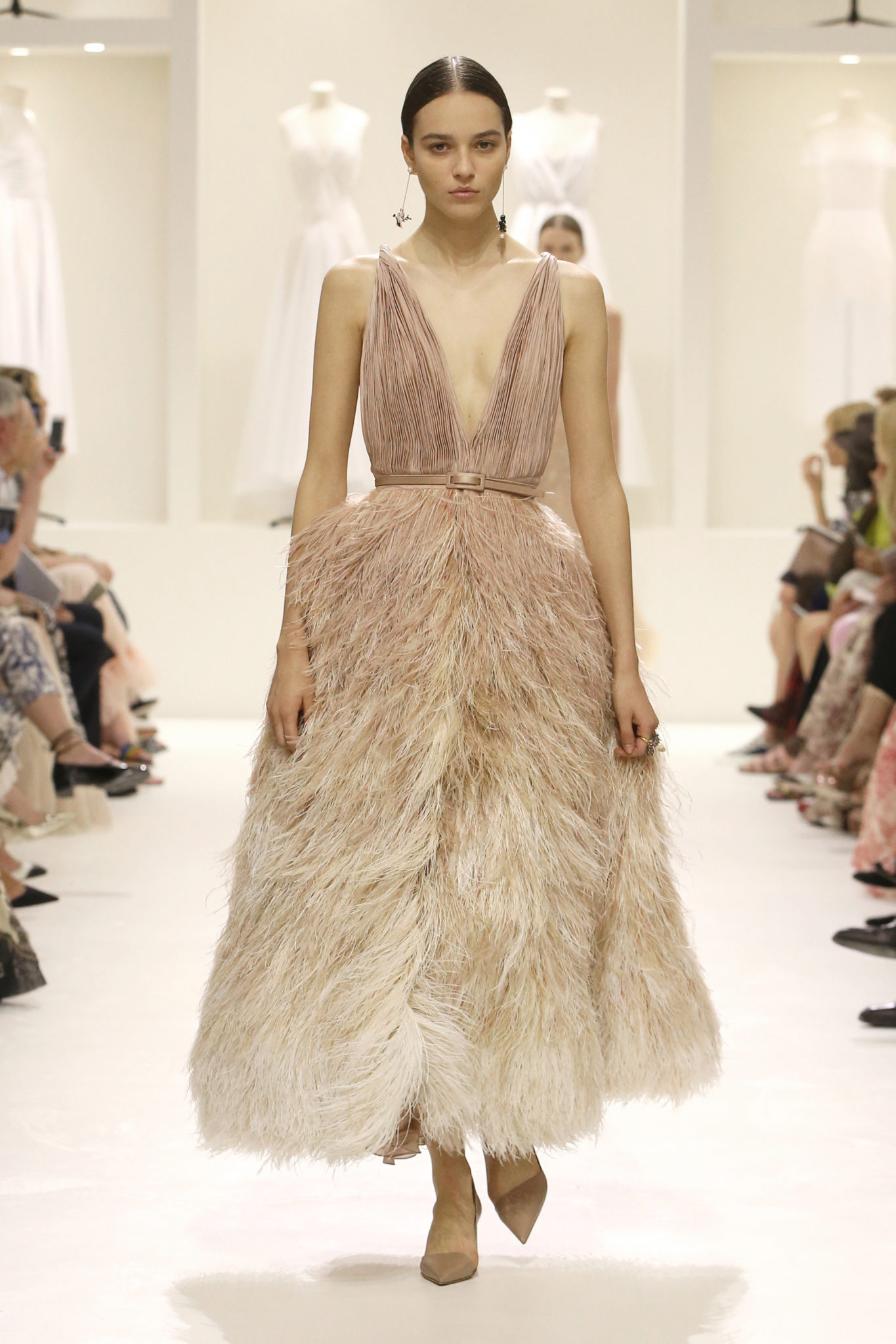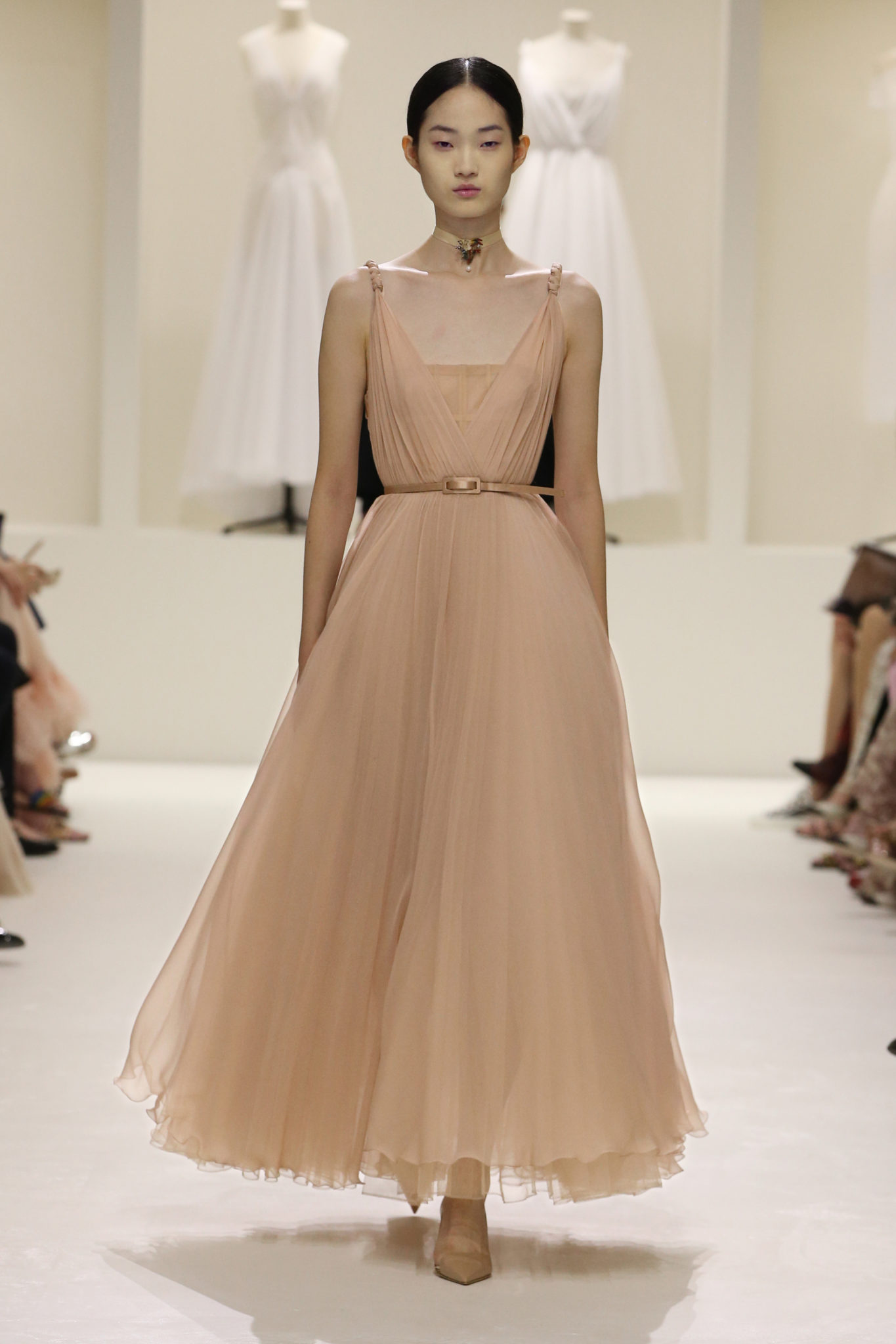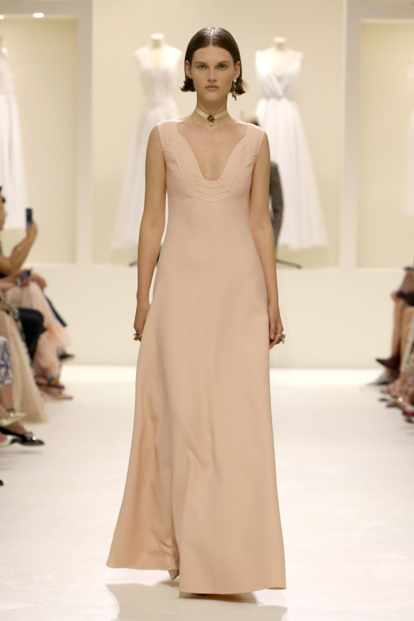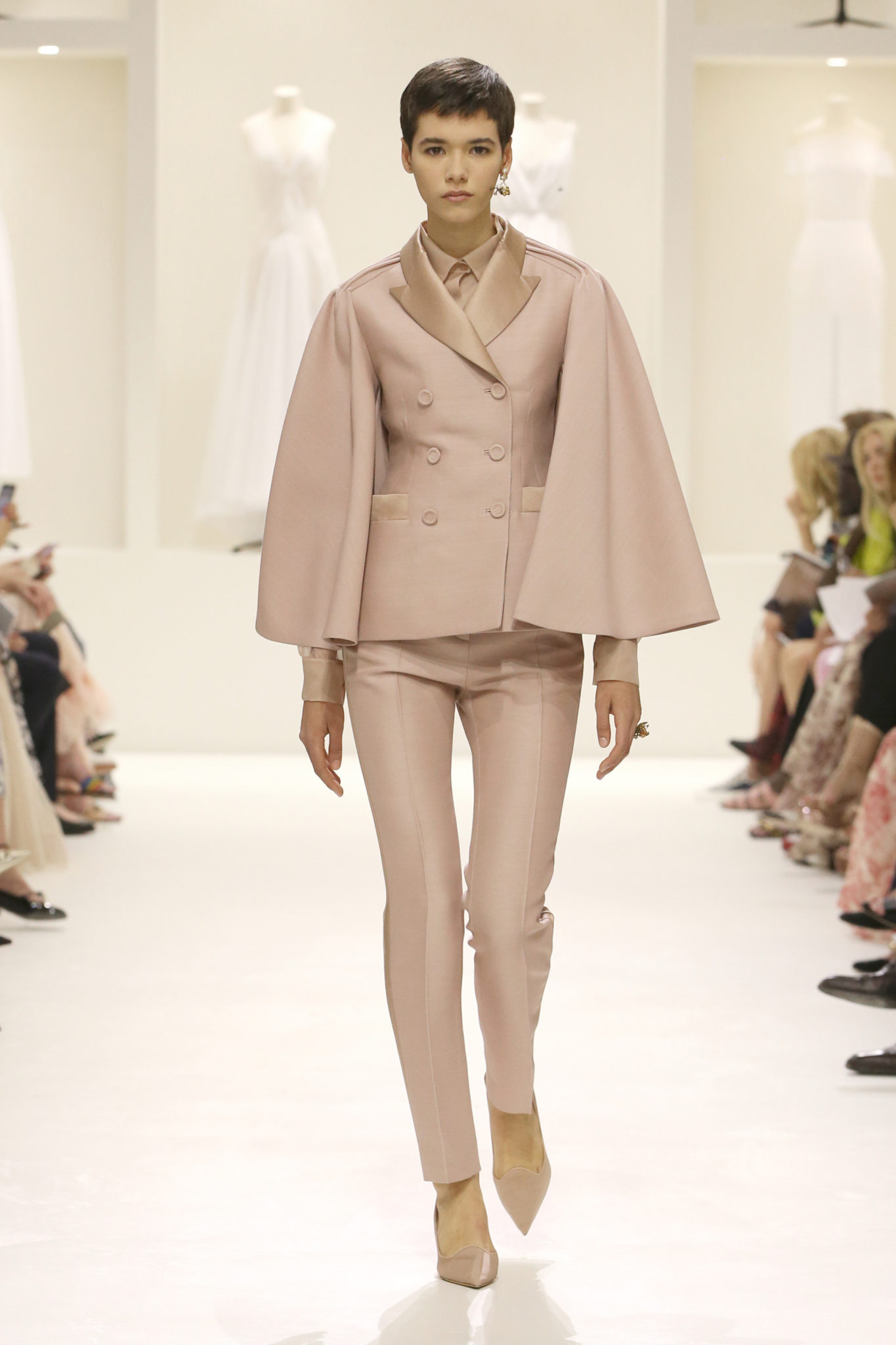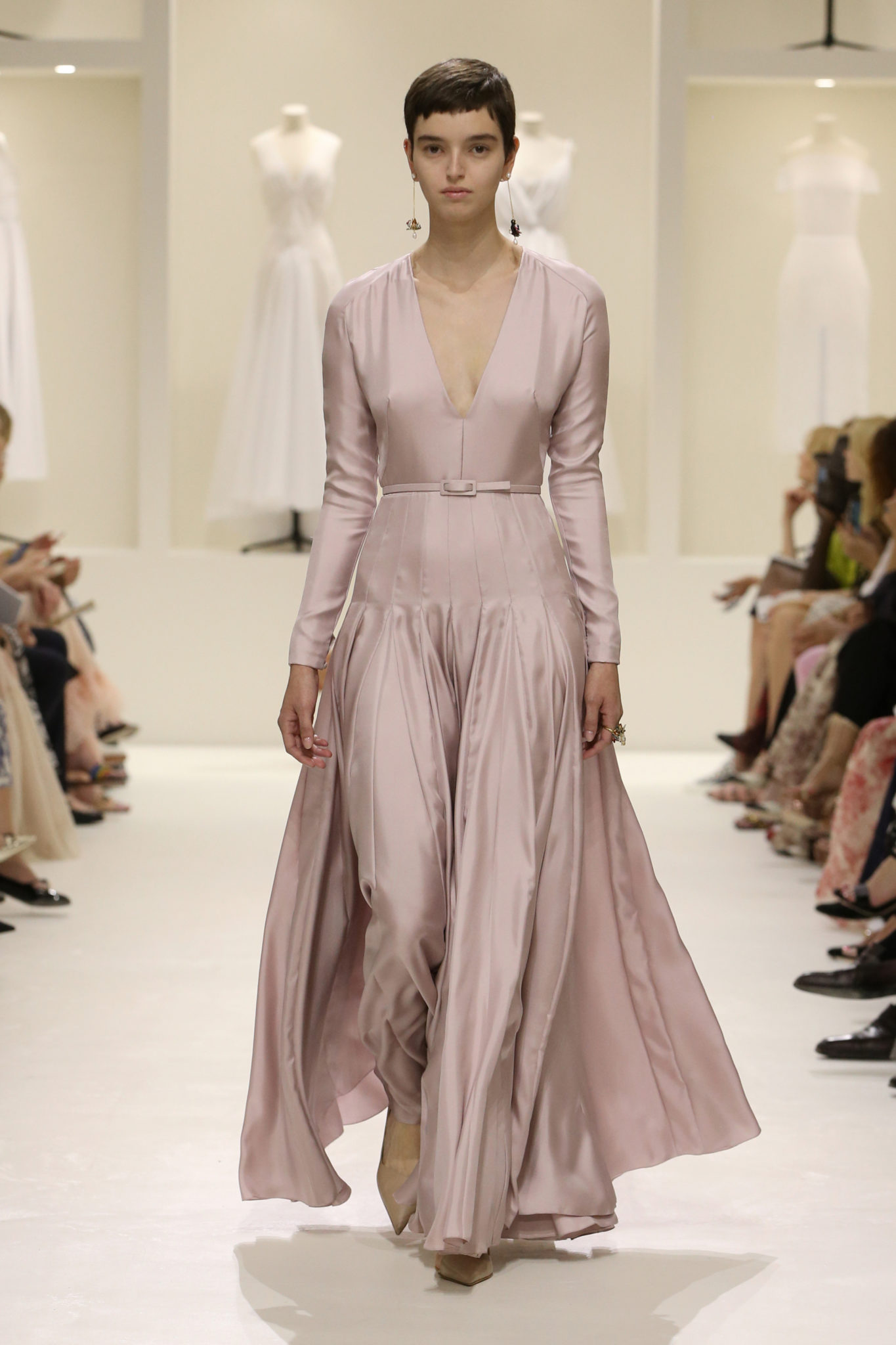 «Curieusement, c’est peut-être le désordre inhérent au désir et à la subjectivité qui rend la psychanalyse lacanienne et l’art d’avant-garde si remarquablement radicaux, faisant de tous deux des idéaux pour une négociation des créations étranges de la couture.» Alison Bancroft*Est-il possible de célébrer la haute couture tout en faisant une lecture critique de celle-ci ? Est-il possible d’être fidèle aux règles strictes édictées par la Chambre syndicale de la haute couture** tout en les décomposant pour créer un ordre nouveau ? Ce sont ces interrogations que Maria Grazia Chiuri a soulevées pour cette collection haute couture automne-hiver 2018-2019, à l’issue de l’exposition Christian Dior, couturier du rêve, qui a mis en lumière, au musée des Arts décoratifs, les créations de la haute couture en rendant hommage à ce lieu sacré et intemporel : l’atelier. Les ateliers sont des temples, gardiens de la pensée. C’est au cœur de cette mémoire de la couture – cette série d’images, de formes, de couleurs et d’attitudes – que se déploie la vision créative de Maria Grazia Chiuri. La couture est une instance de l’avant-garde, une forme d’art qui se développe grâce à l’imagination. Une réflexion qui cultive l’audace de répéter des gestes codifiés tout en cherchant à les enfreindre. Car la couture est aujourd’hui, avant tout, un geste conceptuel. A l’image d’un ready-made de Marcel Duchamp. Ce sont parfois des tissus qui guident le projet, qui sont travaillés dans d’anciennes manufactures qui ne peuvent produire que quelques mètres à la fois et auxquelles on a demandé d’introduire un élément inhabituel ou un nouveau savoir-faire ; chaque matière pouvant subir des modifications qui accentuent ses effets de manière inattendue. D’autres fois, l’idée première vient de la volonté de reconstruire le rituel et la façon de s’habiller au gré des occasions qui rythment une journée. La haute couture, c’est la possibilité de porter une qualité unique, d’adapter l’œuvre parfaite à son propre corps. Maria Grazia Chiuri revient aux fondamentaux et imagine des tailleurs dans lesquels les manches de la veste Bar deviennent des ailes de chauve-souris. La véritable transgression étant de se référer aux règles d’usage tout en détournant leur syntaxe. La palette des couleurs poudrées (brique, vert, rose ou orange), en dialogue avec le Nude, colore les vêtements, mais aussi les accessoires – bijoux fantaisie raffinés, voilettes et chapeaux – telle une continuité complémentaire du corps que la couture met à l’honneur. Les robes du soir, éblouissantes par leurs différents plissés, ou par leurs jeux de superpositions, contrastent avec des bustiers simples qui offrent une dissonance surprenante. La forme sculpturale d’une robe de soie rouge cousue d’une seule pièce ouvre la voie à une série de créations majestueuses et intimes, à la fois retenues et explosives : la couture devient alors un lieu psychologique de résistance féminine. Alison Bancroft assimile, dans un sens lacanien, la couture au mode d’expression des avant-gardes : réappropriation de pratiques séculaires rejetées par le désir de nouveauté et réinterprétation des traditions par des valeurs contemporaines. C’est par cette rencontre entre un système de règles établies et la créativité la plus libre que, pour Maria Grazia Chiuri, la couture devient rébellion : une sorte de « guérilla » idéologique qui explose aux frontières d’une tradition ancrée, sans jamais les outrepasser.