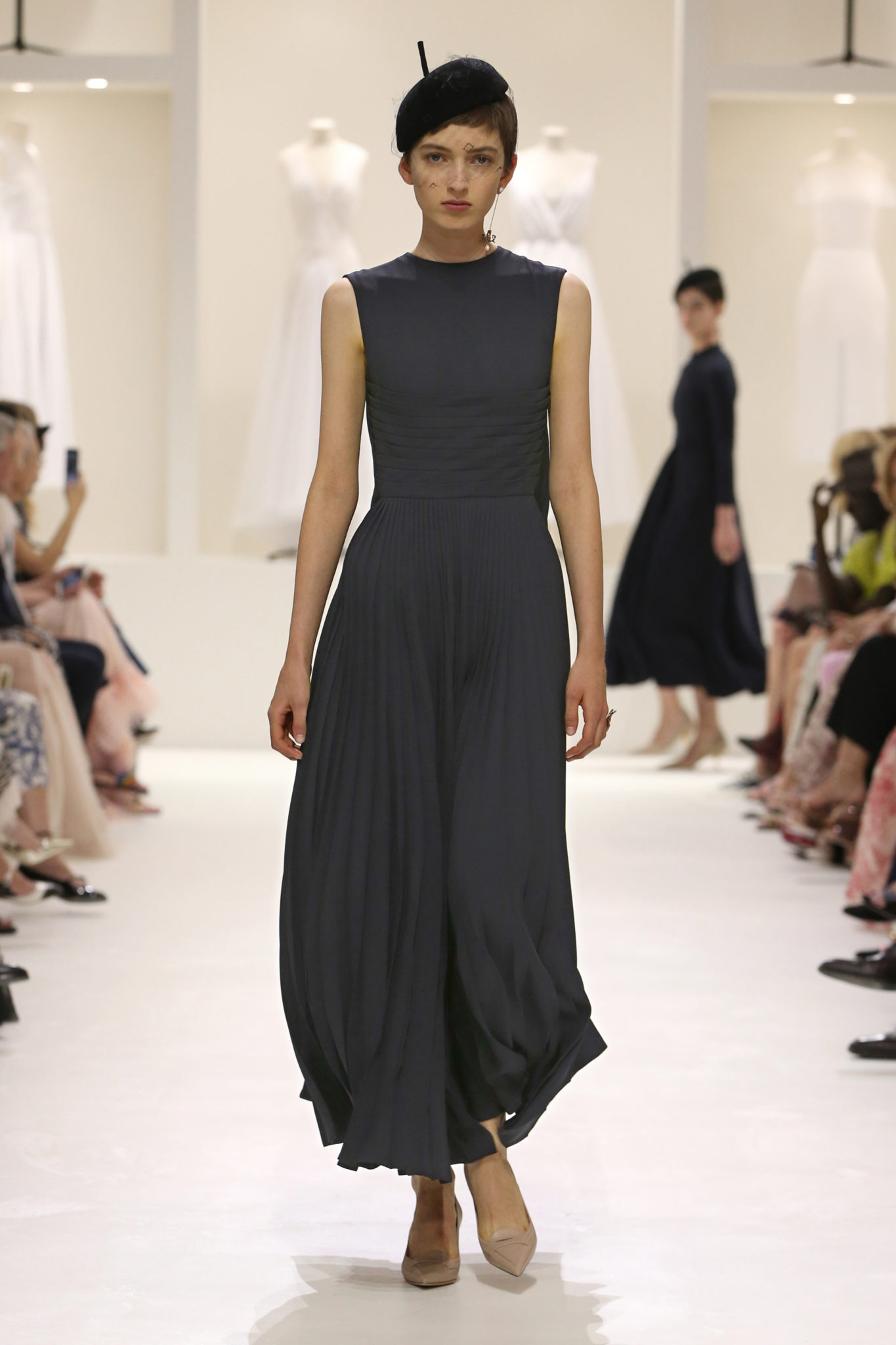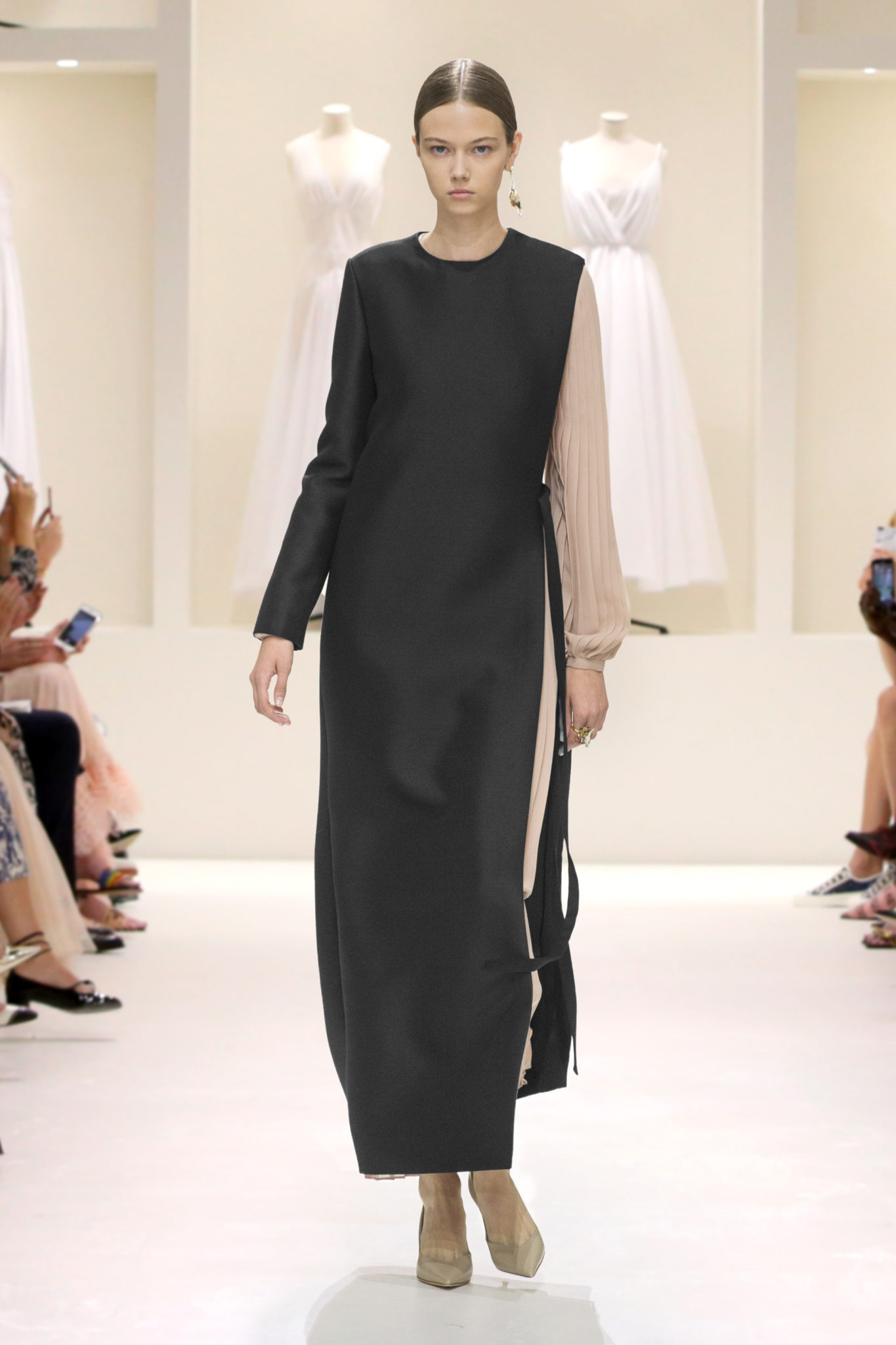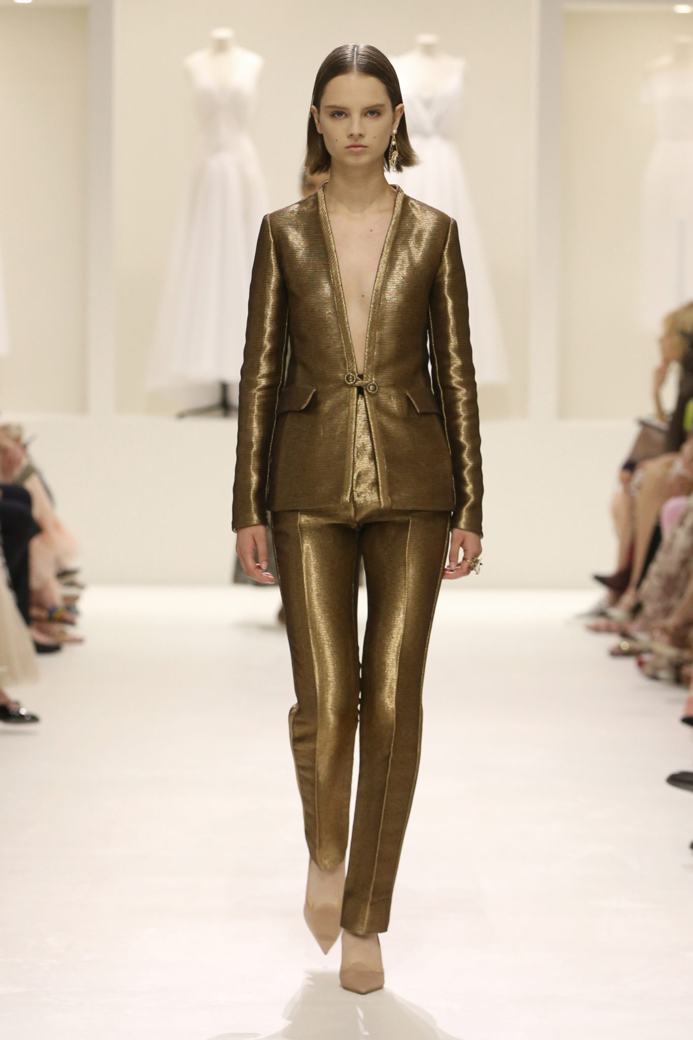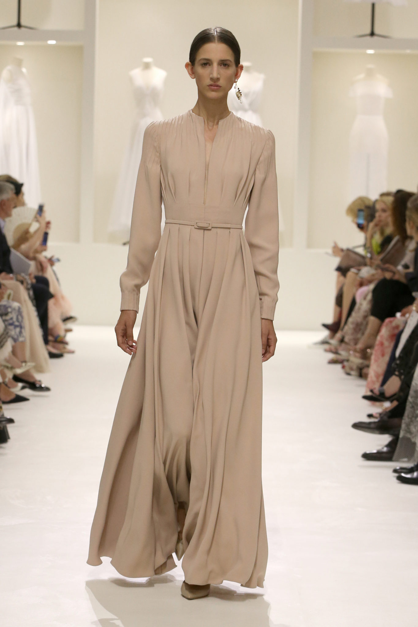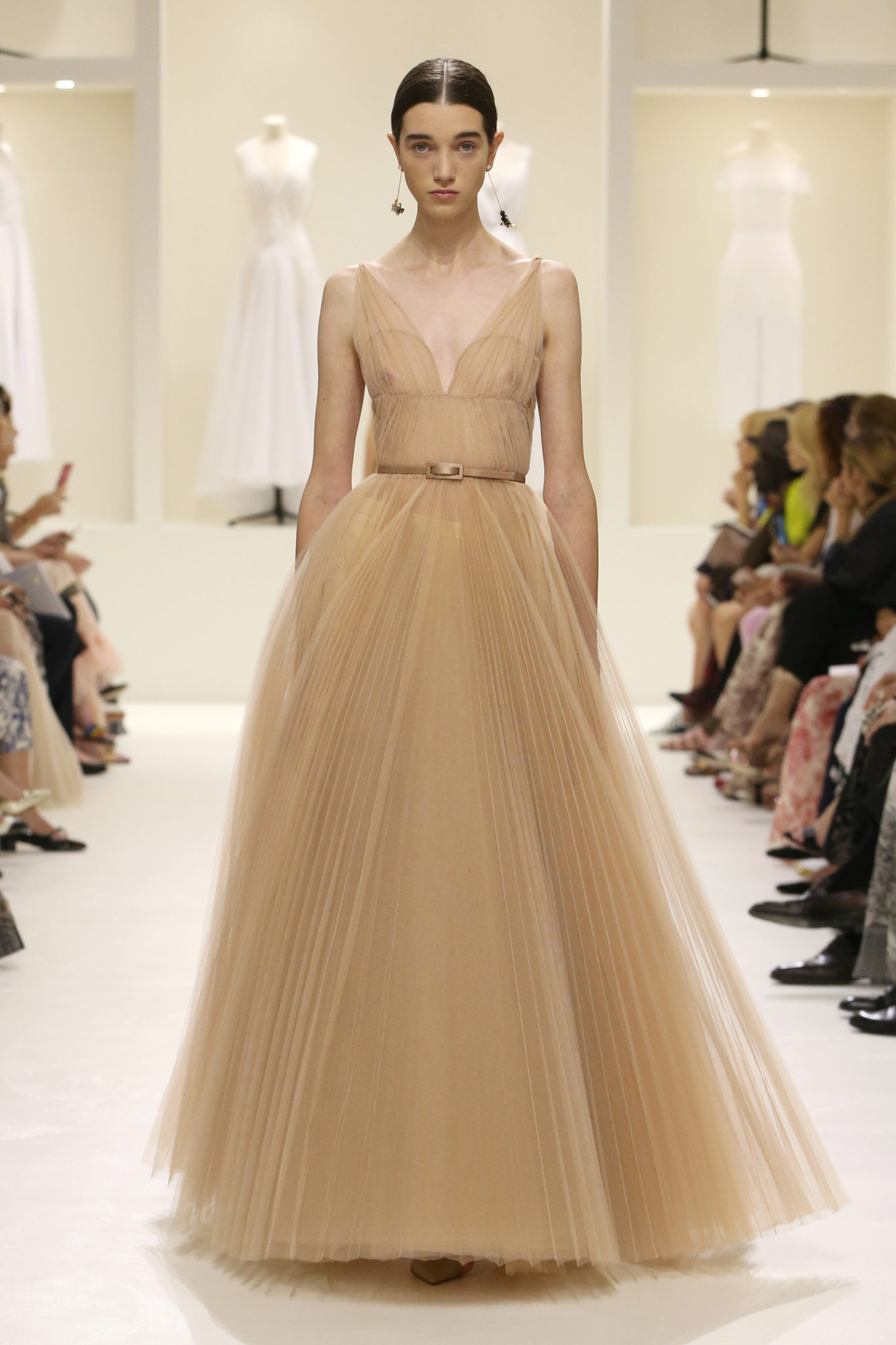 «Curieusement, c’est peut-être le désordre inhérent au désir et à la subjectivité qui rend la psychanalyse lacanienne et l’art d’avant-garde si remarquablement radicaux, faisant de tous deux des idéaux pour une négociation des créations étranges de la couture.» Alison Bancroft*Est-il possible de célébrer la haute couture tout en faisant une lecture critique de celle-ci ? Est-il possible d’être fidèle aux règles strictes édictées par la Chambre syndicale de la haute couture** tout en les décomposant pour créer un ordre nouveau ? Ce sont ces interrogations que Maria Grazia Chiuri a soulevées pour cette collection haute couture automne-hiver 2018-2019, à l’issue de l’exposition Christian Dior, couturier du rêve, qui a mis en lumière, au musée des Arts décoratifs, les créations de la haute couture en rendant hommage à ce lieu sacré et intemporel : l’atelier. Les ateliers sont des temples, gardiens de la pensée. C’est au cœur de cette mémoire de la couture – cette série d’images, de formes, de couleurs et d’attitudes – que se déploie la vision créative de Maria Grazia Chiuri. La couture est une instance de l’avant-garde, une forme d’art qui se développe grâce à l’imagination. Une réflexion qui cultive l’audace de répéter des gestes codifiés tout en cherchant à les enfreindre. Car la couture est aujourd’hui, avant tout, un geste conceptuel. A l’image d’un ready-made de Marcel Duchamp. Ce sont parfois des tissus qui guident le projet, qui sont travaillés dans d’anciennes manufactures qui ne peuvent produire que quelques mètres à la fois et auxquelles on a demandé d’introduire un élément inhabituel ou un nouveau savoir-faire ; chaque matière pouvant subir des modifications qui accentuent ses effets de manière inattendue. D’autres fois, l’idée première vient de la volonté de reconstruire le rituel et la façon de s’habiller au gré des occasions qui rythment une journée. La haute couture, c’est la possibilité de porter une qualité unique, d’adapter l’œuvre parfaite à son propre corps. Maria Grazia Chiuri revient aux fondamentaux et imagine des tailleurs dans lesquels les manches de la veste Bar deviennent des ailes de chauve-souris. La véritable transgression étant de se référer aux règles d’usage tout en détournant leur syntaxe. La palette des couleurs poudrées (brique, vert, rose ou orange), en dialogue avec le Nude, colore les vêtements, mais aussi les accessoires – bijoux fantaisie raffinés, voilettes et chapeaux – telle une continuité complémentaire du corps que la couture met à l’honneur. Les robes du soir, éblouissantes par leurs différents plissés, ou par leurs jeux de superpositions, contrastent avec des bustiers simples qui offrent une dissonance surprenante. La forme sculpturale d’une robe de soie rouge cousue d’une seule pièce ouvre la voie à une série de créations majestueuses et intimes, à la fois retenues et explosives : la couture devient alors un lieu psychologique de résistance féminine. Alison Bancroft assimile, dans un sens lacanien, la couture au mode d’expression des avant-gardes : réappropriation de pratiques séculaires rejetées par le désir de nouveauté et réinterprétation des traditions par des valeurs contemporaines. C’est par cette rencontre entre un système de règles établies et la créativité la plus libre que, pour Maria Grazia Chiuri, la couture devient rébellion : une sorte de « guérilla » idéologique qui explose aux frontières d’une tradition ancrée, sans jamais les outrepasser.