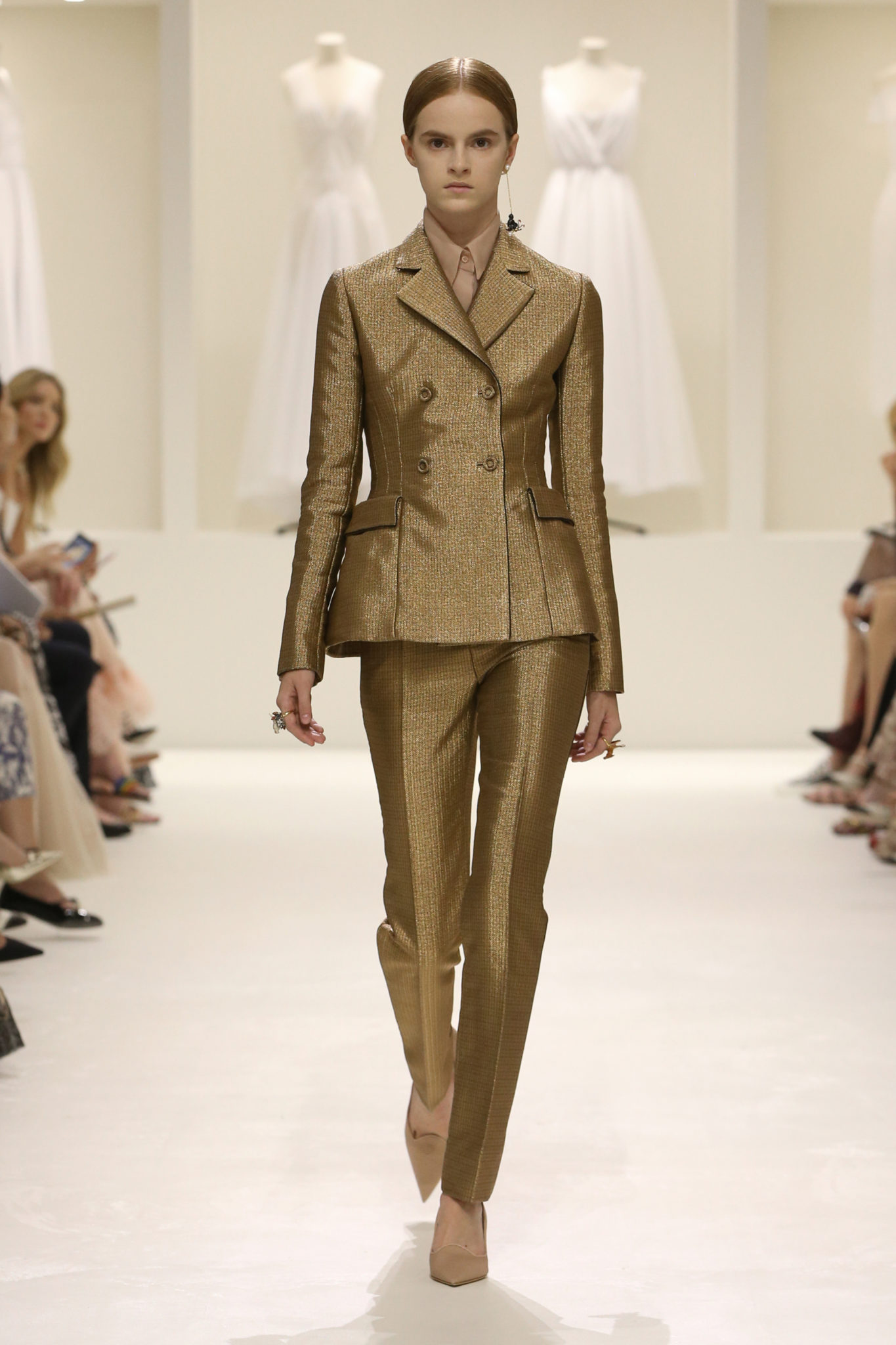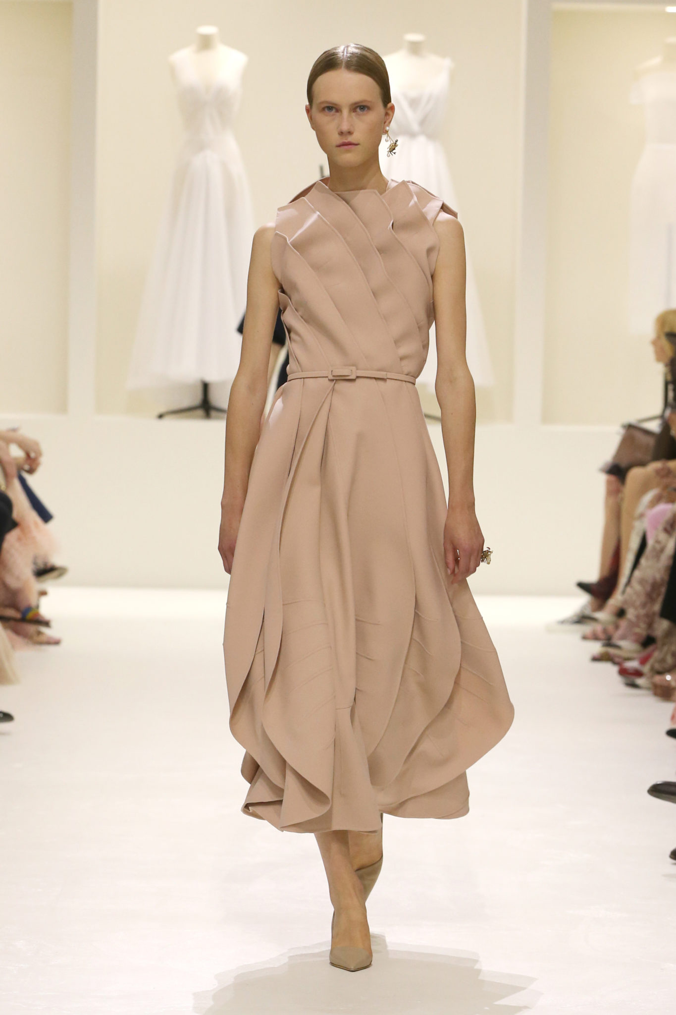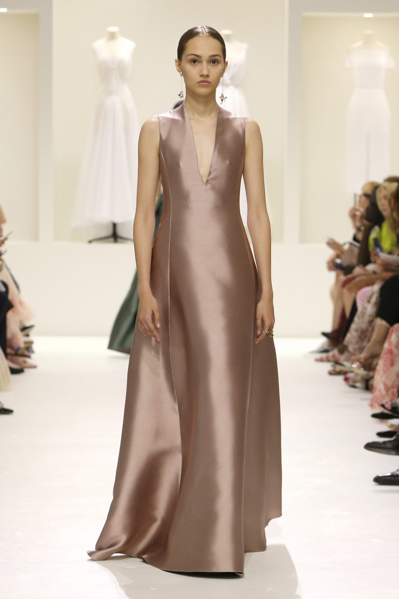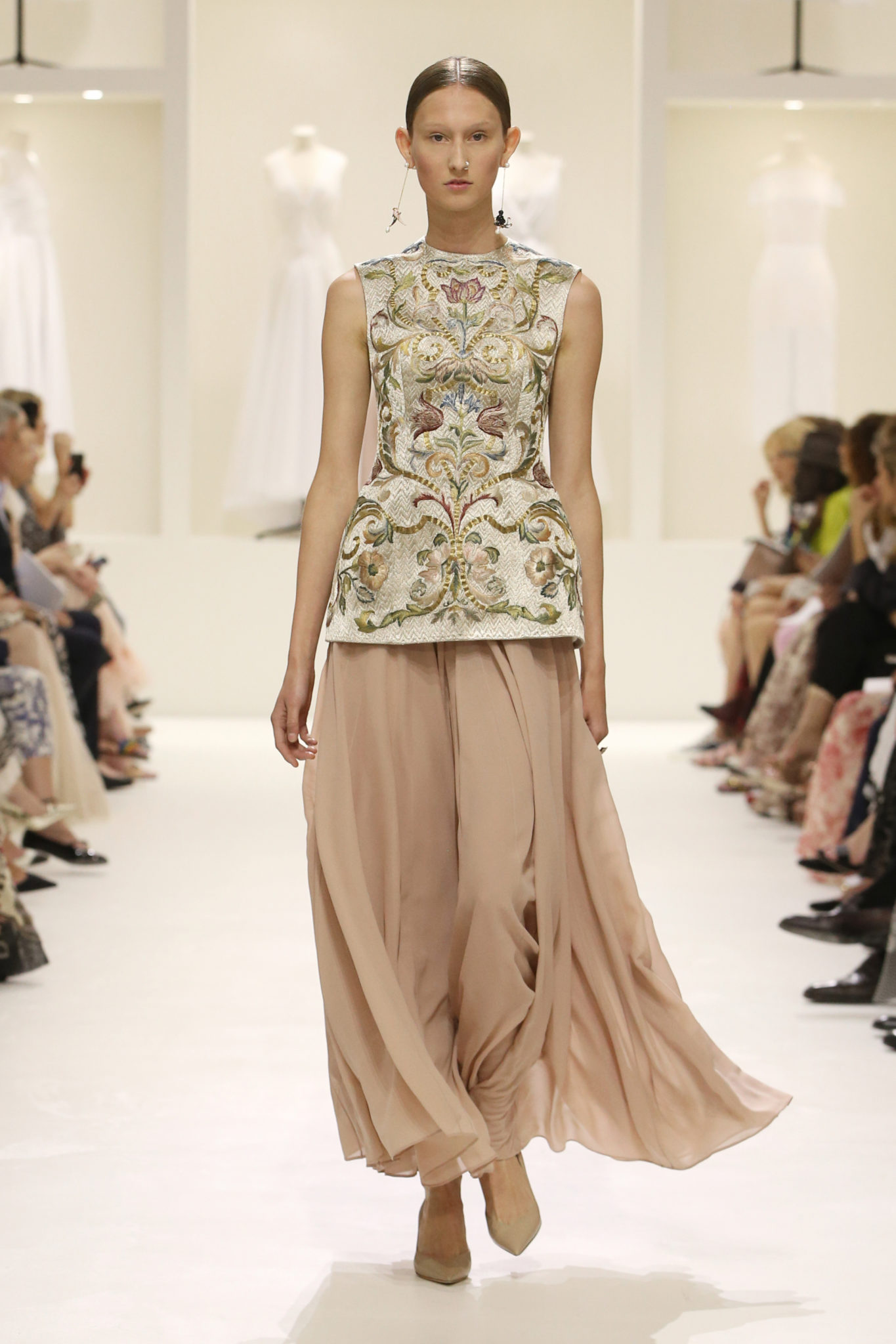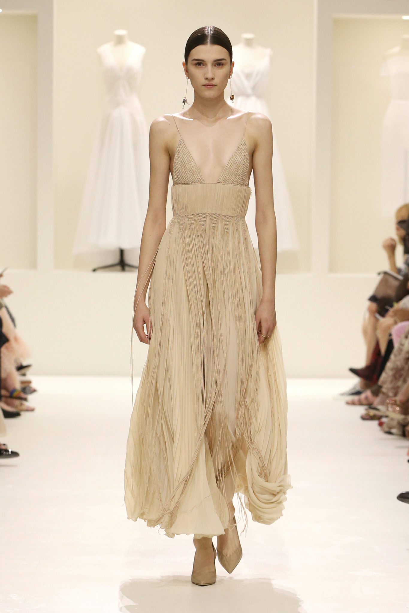 «Curieusement, c’est peut-être le désordre inhérent au désir et à la subjectivité qui rend la psychanalyse lacanienne et l’art d’avant-garde si remarquablement radicaux, faisant de tous deux des idéaux pour une négociation des créations étranges de la couture.» Alison Bancroft*Est-il possible de célébrer la haute couture tout en faisant une lecture critique de celle-ci ? Est-il possible d’être fidèle aux règles strictes édictées par la Chambre syndicale de la haute couture** tout en les décomposant pour créer un ordre nouveau ? Ce sont ces interrogations que Maria Grazia Chiuri a soulevées pour cette collection haute couture automne-hiver 2018-2019, à l’issue de l’exposition Christian Dior, couturier du rêve, qui a mis en lumière, au musée des Arts décoratifs, les créations de la haute couture en rendant hommage à ce lieu sacré et intemporel : l’atelier. Les ateliers sont des temples, gardiens de la pensée. C’est au cœur de cette mémoire de la couture – cette série d’images, de formes, de couleurs et d’attitudes – que se déploie la vision créative de Maria Grazia Chiuri. La couture est une instance de l’avant-garde, une forme d’art qui se développe grâce à l’imagination. Une réflexion qui cultive l’audace de répéter des gestes codifiés tout en cherchant à les enfreindre. Car la couture est aujourd’hui, avant tout, un geste conceptuel. A l’image d’un ready-made de Marcel Duchamp. Ce sont parfois des tissus qui guident le projet, qui sont travaillés dans d’anciennes manufactures qui ne peuvent produire que quelques mètres à la fois et auxquelles on a demandé d’introduire un élément inhabituel ou un nouveau savoir-faire ; chaque matière pouvant subir des modifications qui accentuent ses effets de manière inattendue. D’autres fois, l’idée première vient de la volonté de reconstruire le rituel et la façon de s’habiller au gré des occasions qui rythment une journée. La haute couture, c’est la possibilité de porter une qualité unique, d’adapter l’œuvre parfaite à son propre corps. Maria Grazia Chiuri revient aux fondamentaux et imagine des tailleurs dans lesquels les manches de la veste Bar deviennent des ailes de chauve-souris. La véritable transgression étant de se référer aux règles d’usage tout en détournant leur syntaxe. La palette des couleurs poudrées (brique, vert, rose ou orange), en dialogue avec le Nude, colore les vêtements, mais aussi les accessoires – bijoux fantaisie raffinés, voilettes et chapeaux – telle une continuité complémentaire du corps que la couture met à l’honneur. Les robes du soir, éblouissantes par leurs différents plissés, ou par leurs jeux de superpositions, contrastent avec des bustiers simples qui offrent une dissonance surprenante. La forme sculpturale d’une robe de soie rouge cousue d’une seule pièce ouvre la voie à une série de créations majestueuses et intimes, à la fois retenues et explosives : la couture devient alors un lieu psychologique de résistance féminine. Alison Bancroft assimile, dans un sens lacanien, la couture au mode d’expression des avant-gardes : réappropriation de pratiques séculaires rejetées par le désir de nouveauté et réinterprétation des traditions par des valeurs contemporaines. C’est par cette rencontre entre un système de règles établies et la créativité la plus libre que, pour Maria Grazia Chiuri, la couture devient rébellion : une sorte de « guérilla » idéologique qui explose aux frontières d’une tradition ancrée, sans jamais les outrepasser.